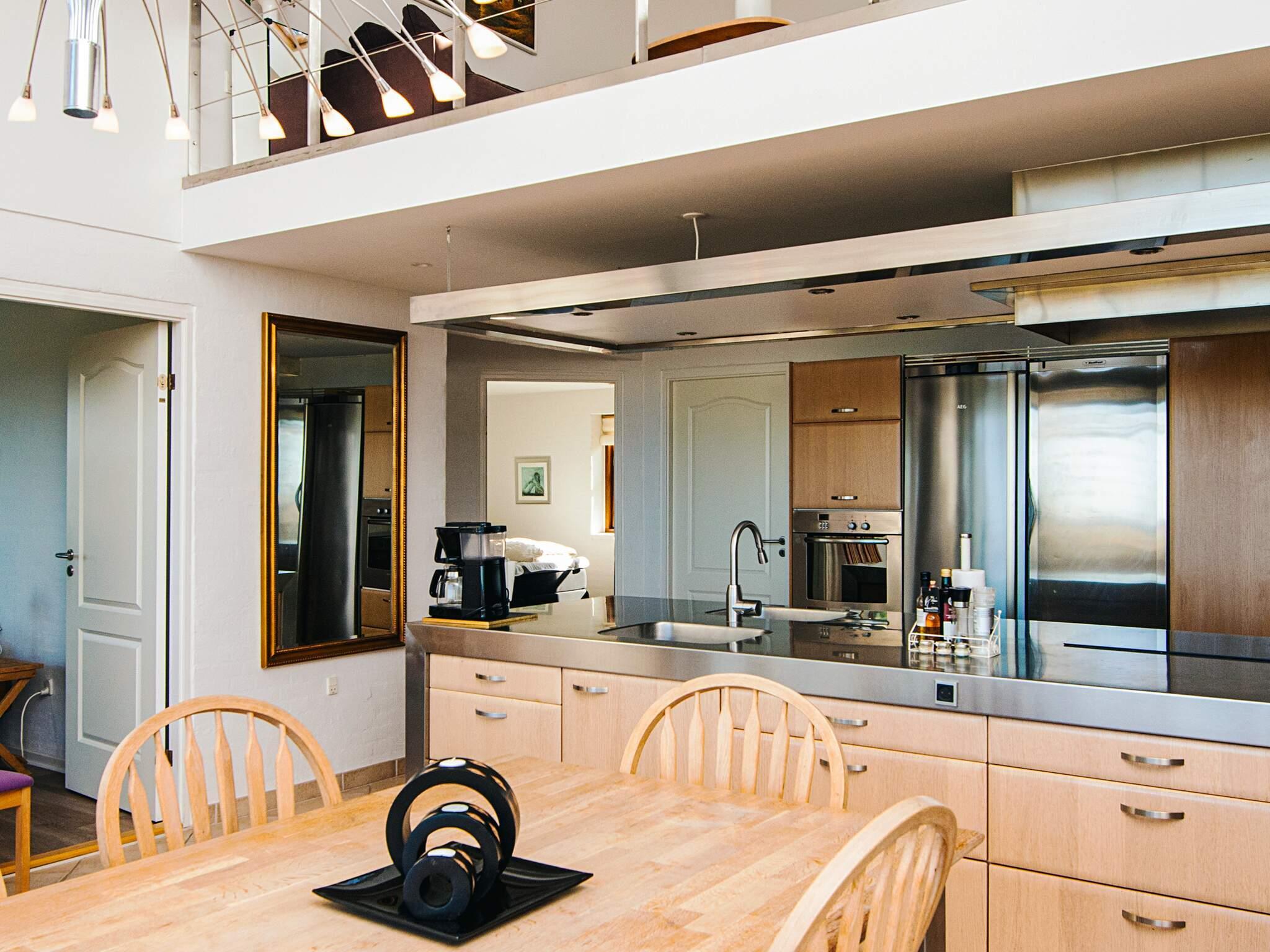 Das Ferienhaus ist innen modern und zweckmäßig eingerichtet und möbliert. Im hellen Wohnbereich steht eine gemütliche Sitzecke mit herrlichem Panorama-Ausblick bereit. Gleich im Anschluss findet man den geräumigen Essbereich mit Kaminofen. Die Küchenausstattung im offenen Küchenbereich nebenan ist zeitgemäß und umfassend, u.a. mit Kochinsel mit großem Ceranfeld, separatem Backofen und Gefrierschrank sowie Spülmaschine. Die vier Schlafzimmer und der Hems sind zweckmäßig ausgestattet. Es gibt zwei Bäder im Haus, eines davon mit großer Duschecke und attraktivem Whirlpool mitten im Raum, von dem man ebenfalls schöne Aussicht zum Wasser genießt. Gleich nebenan wartet die Sauna.
