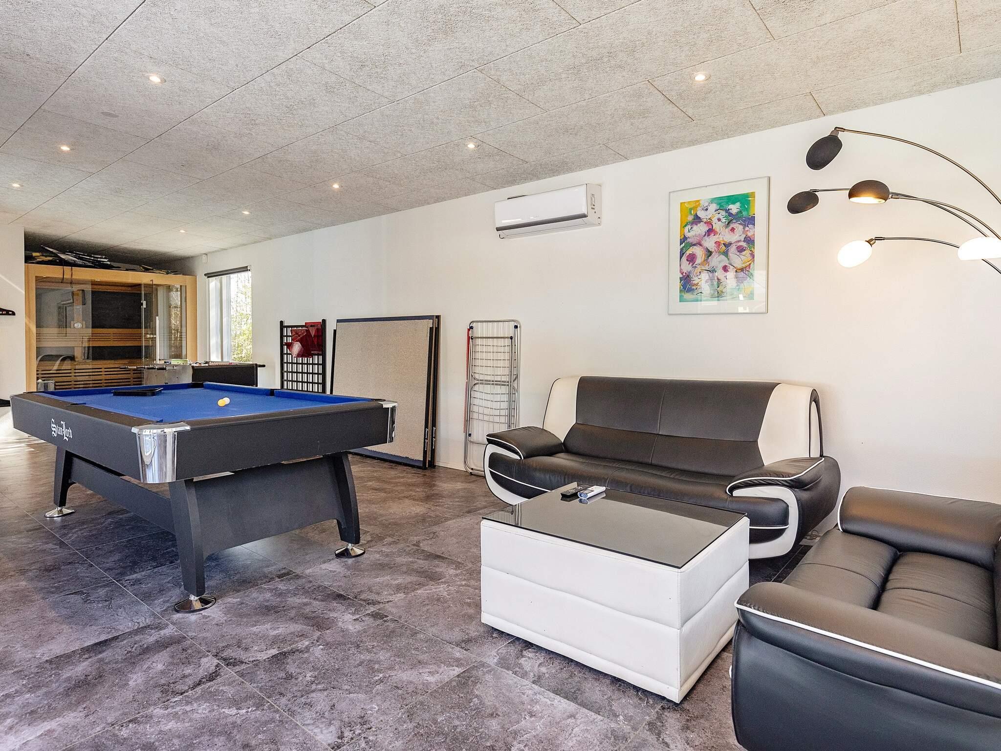 Für den Freizeitspaß wurde eine Ecke gestaltet, in dem man Billard, Tischkicker, Tischtennis und Darts spielen kann. Es gibt einen geräumigen Wohnbereich mit Kamin und 65" Smart-TV mit Chromecast zum Streamen sowie ein 49" Smart-TV im Haus. WLAN ebenfalls vorhanden. Das Esszimmer liegt in offener Verbindung zur Küche. Außerdem vier Schlafzimmer und ein extra Schlafplatz in der Stube, zwei Bäder mit Dusche/WC im Haus.