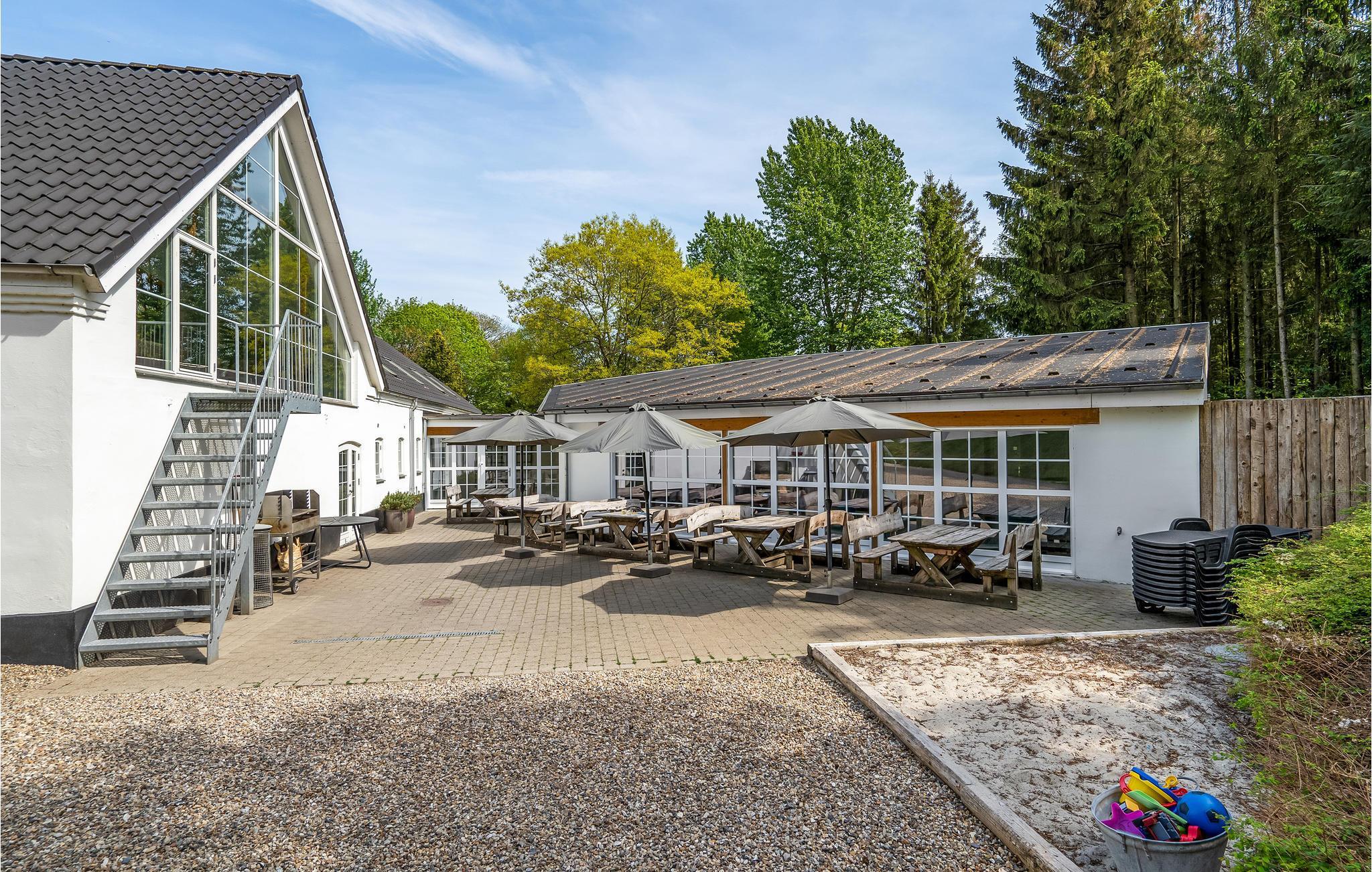 Hier werden Sie Ihren Urlaub in einer authentischen Gegend verbringen. In einem dänischen Landhaus, zusammen mit der Familie oder Freunden. Die Unterkunft Nebelgård lässt Ihren Urlaubstraum Wirklichkeit werden. Es ist ein einzigartiges Ferienziel in einer ländlichen Umgebung. Die alten Ställe, die Scheude und der Heuboden bieten Ihnen seit der Renovierung 2009 eine hervorragende Unterkunft auf 950 m². Es gibt einen großen Poolbereich mit Rutsche, Whirlpool und Sauna. Im Spielzimmer stehen Tischtennis, PlayStation, Tischfußball und mehr. Es gibt auch ein Minikino mit Kinostühlen und einem Großbildschirm. Die große Scheune beherbergt auf 200 m² einen Wohnraum mit einem großen Tisch, an dem alle Bewohner Platz finden. Auch mehrere Sitzgelegenheiten, einen Billardtisch und einen 50" Flachbildschirm gibt es hier. Die Küche ist mit 8 Kochplatten, 2 Backöfen, 2 Kühlschränken, einer Gefriereinheit und 2 Geschirrspülern professionell ausgestattet. Im Stallgebäude liegen die Doppelzimmer, Badezimmer und eine Lounge mit Panoramafenster. Es gibt auch einen Hauswirtschaftsraum mit Waschmaschine und Trockner. Im Freien erwartet Sie ein schöner Garten mit Sitzgelegenheiten zum Genießen von romantischen Sommerabenden im Kerzenschein. Der Hof liegt in einer ruhigen Gegend, die zu schönen Spaziergängen einlädt. Auf dem großen Naturgrund gibt es auch einen See, dort beobachten Sie wilde Tiere. Ein prächtiges Ferienhaus in einer unberührten Natur.