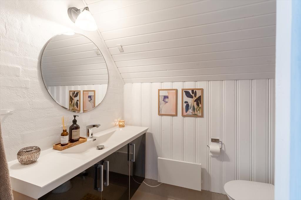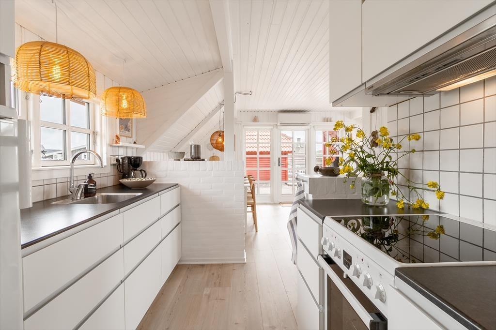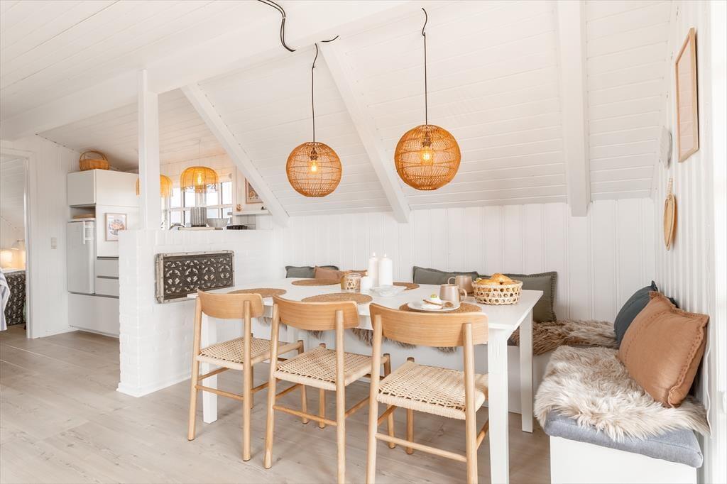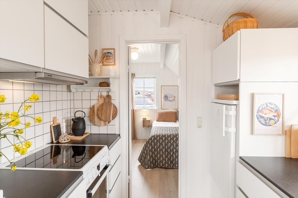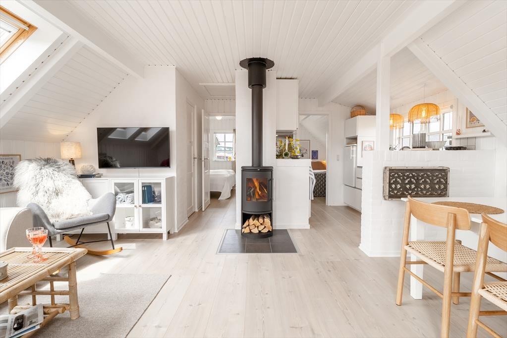 Innen erwartet dich eine helle und gemütliche Einrichtung, die sofort eine entspannte Urlaubsatmosphäre verbreitet. Der Kaminofen im Wohnzimmer sorgt an kühleren Tagen für wohlige Wärme und zusätzliche Gemütlichkeit, und in den weichen Möbeln kannst du es dir mit einem guten Buch oder einem Brettspiel mit der Familie so richtig bequem machen. Wohnzimmer und Küche sind in einem offenen Raum kombiniert, der als natürlicher Treffpunkt dient – ideal für lange Gespräche, gemeinsames Kochen und fröhliches Beisammensein. Es gibt ausreichend Platz für sechs Personen, verteilt auf zwei Schlafzimmer im Haus sowie ein separates Annex – perfekt für Familien oder befreundete Paare, die gemeinsam verreisen. Die Einrichtung ist schlicht, nordisch und wohnlich, und durch die großen Fenster fällt viel Licht ein – sodass du ständig daran erinnert wirst, wie nah du der Natur und dem Meer bist.