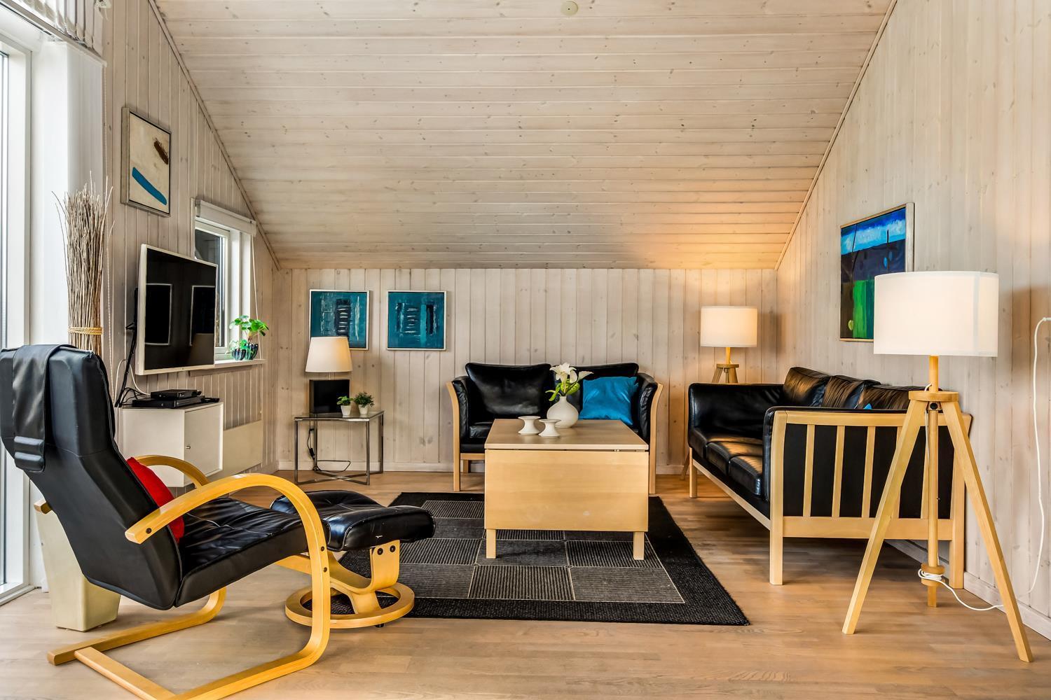 Einladendes und gut ausgestattetes Ferienhaus von 103 m². Das Haus bietet einen Flur mit Platz für die Oberbekleidung. Die Küchenecke und das Wohnzimmer gleiten leicht und natürlich zusammen, so dass die Familie sich gemeinsam amüsieren kann, wenn in der Küche etwas zu tun ist. Die Küchenecke ist gut ausgestattet. Cerankochfeld, eingebauter Backofen, Mikrowelle, Abzugshaube, Geschirrspüler, Kühlschrank mit Gefrierfach und alles an Service und Kochgeschirr. Zum Wohnzimmer hin ist die Küchenecke durch eine kleine halbe Wand begrenzt, an der 2 Barhocker angebracht sind, auf denen Sie sich bei der Zubereitung von Mahlzeiten leicht unterhalten und ein Glas Wein genießen können. Auf dem Weg ins Wohnzimmer kommt man an einem schönen Esstisch vorbei, der günstig direkt an der Küchenecke liegt. Das Wohnzimmer ist mit schönen Ledermöbeln, Fernseher mit dänischen und deutschen Programmen, kostenlosem Internet, DVD / DC / Radio sowie einem schönen Kaminofen und Wärmepumpe ausgestattet, der für zusätzliche Gemütlichkeit und Wärme für die rauhen Tage an der Nordsee sorgt. Das Haus verfügt über 2 Badezimmer. Genießen Sie das große schöne Badezimmer mit Whirlpool, Fußbodenheizung, Glassteindusche, WC, Waschbecken und Fliesenboden mit Fußbodenheizung. Direkt neben dem Hauptbad befindet sich ein kleines Extrazimmer. Hier befinden sich die Waschmaschine und der Trockner, sowie der Zugang zur 2-3-Personen-Sauna des Hauses. Gäste-WC mit WC, Waschbecken und Fliesenboden mit Fußbodenheizung. 3 geräumige Schlafräume (1DB, 1DB, 2B). In allen Schlafräumen ist derselbe Holzboden vorhanden. Küchenecke mit Fliesenboden. In jedem Raum ist viel Platz und viel Luft. Das Wohnzimmer ist bis zum Dach offen gebaut, das bedeutet, dass es auch einen offenen Schlafboden gibt, der als Abstellraum oder zum Spielen für Kinder und kindliche Seelen genutzt werden kann. Wenn Sie ein Elektroauto oder einen Plug-in-Hybrid haben, verfügt das Haus über eine Ladegerät, Type 2 die bis zu 11 kWh aufladen kann. Sie müssen Ihr eigenes Ladekabel mitbringen. Nichtraucher-Haus. Haustiere sind nicht erlaubt.