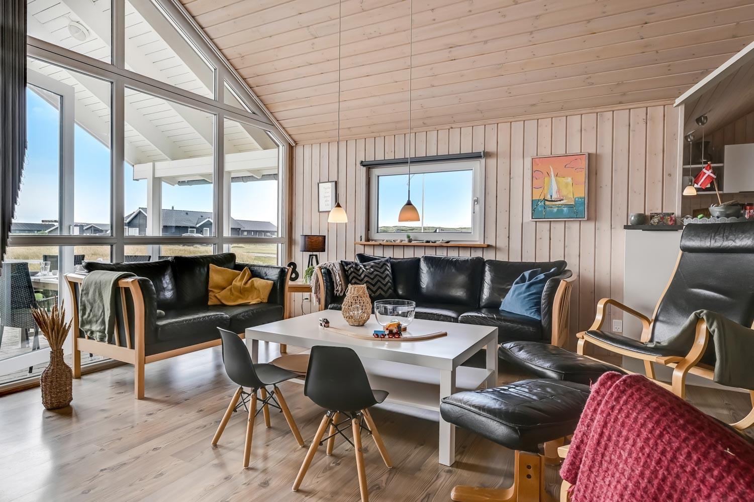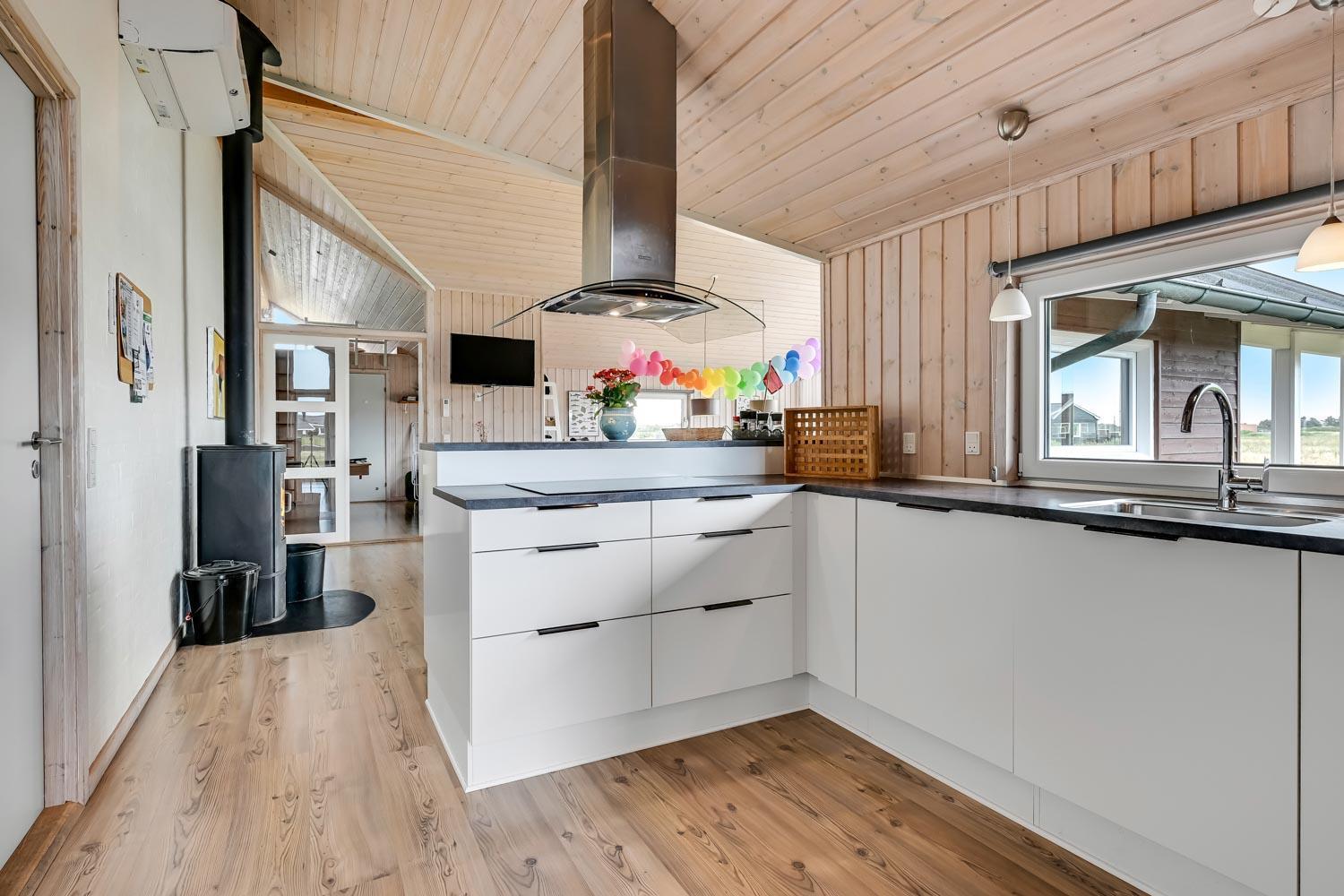 Im Wohnbereich laden Ledermöbel zum Entspannen ein, vor dem Smart-TV mit dänischen und deutschen Programmen, Radio und Streamingmöglichkeiten. Der Kaminofen sorgt für wohlige Wärme und eine gemütliche Atmosphäre. Die Wärmepumpe hilft die Heizkosten niedrig zu halten und sorgt für ein gutes Raumklima. Vom Wohnzimmer aus hat man ebenfalls Zugang zur großzügigen Terrassenanlage.
