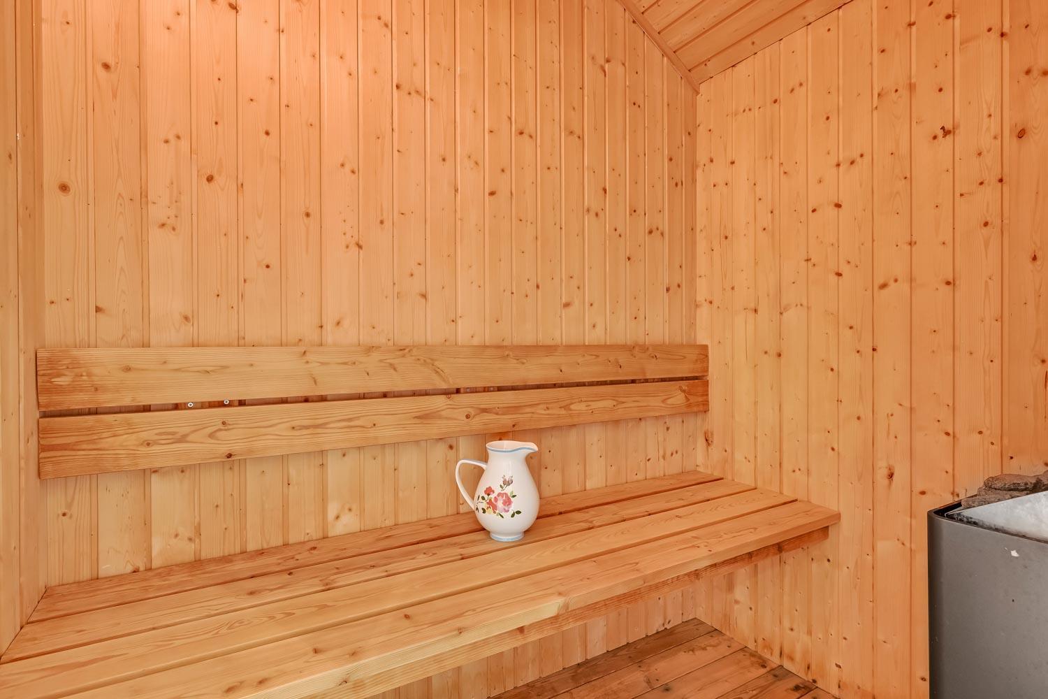 Das große Badezimmer verfügt über Whirlpool, direkten Zugang zur Sauna, Toilette, Waschbecken, gefliesten Boden mit Fußbodenheizung und Dusche. Zudem gibt es ein Gäste-WC mit Toilette, Waschbecken, Dusche, Fliesenboden und Fußbodenheizung, sowie eine Waschmaschine und ein Trockner.