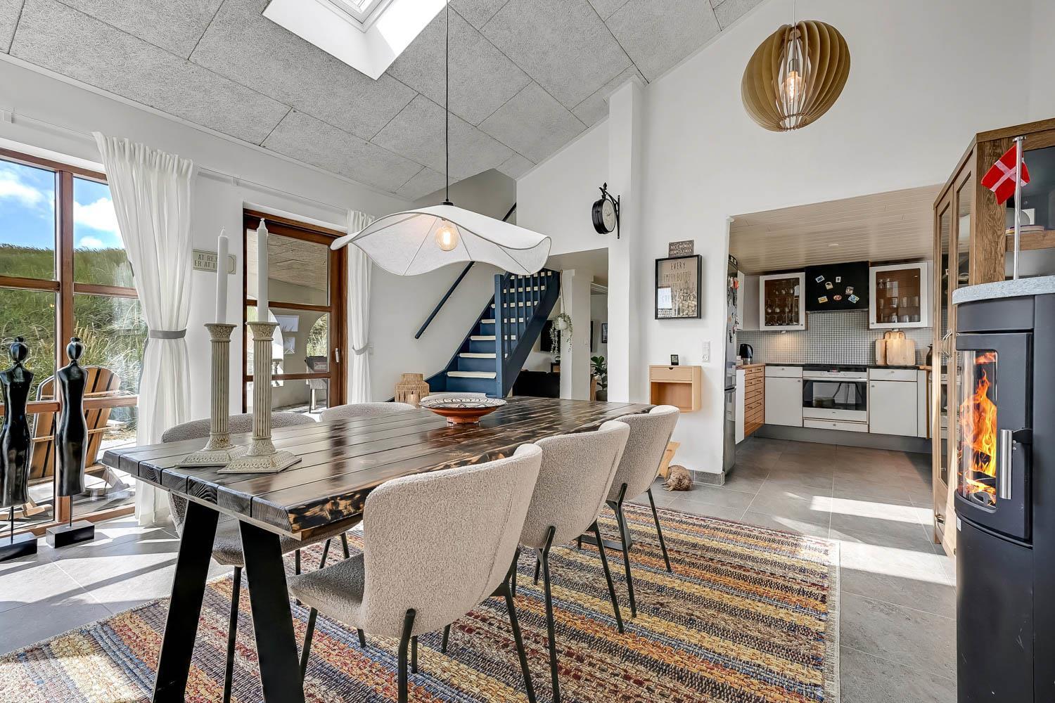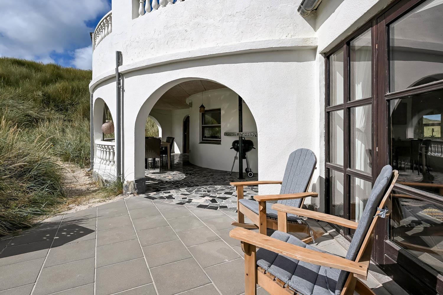 Das Haus liegt auf einem Dünengrundstück ganz nah an der Nordsee. Das Haus hat eine der besten Lagen im ganzen Gebiet. Das Haus hat mehrere Terrassen; die 1. Terrasse im Erdgeschoss ist überdacht und hier wird der spanische Baustil in den Vordergrund gerückt; hier gibt es natürlich Gartenmöbel und Grill und es ist die perfekte Stelle, um sich hier aufzuhalten, wenn es draußen sehr warm ist, weil es hier immer sehr viel kühler ist. Vom 1. Stock gibt es einen Ausgang zu einer weiteren Terrasse und von hier haben Sie einen tollen Blick zu den Dünen und über das Gebiet. Von hier gibt es noch eine Treppe, die nach oben auf den Turm führt. Hier gibt es eine runde Terrasse, von der es einen herrlichen Blick über die Nordsee und die ganze Umgebung bei Vrist gibt. Vom Haus aus sind es nur 50 m zum Strand an der Nordsee, die täglich neue Geschichten erzählt. Es gibt viele Aktivitäten, die Sie am Strand machen können, z.B. baden, schwimmen, Steine und Bernsteine suchen, Sandburgen bauen oder Drachen steigen lassen und vieles andere. Mit dem Auto können Sie schnell das Fischerdorf Thyborøn erreichen, ein ganz gemütlicher Ort mit vielen guten Restaurants, Geschäften und Attraktionen. Hier haben Sie auch die besten Möglichkeiten, frischen Fisch zu kaufen und ihn mit nach Hause zu nehmen. Fahren Sie in die andere Richtung, erreichen Sie die alte Handelsstadt Lemvig, in der es auch viele Geschäfte, Restaurants und eine sehr schöne Hafenpromenade gibt, wo es auch einen kleinen Spielplatz für die kleinsten Kinder gibt. Dieses Haus ist für Gäste, die etwas ganz Besonderes im Urlaub haben möchten, was Haus und Lage so dicht am Meer angeht.