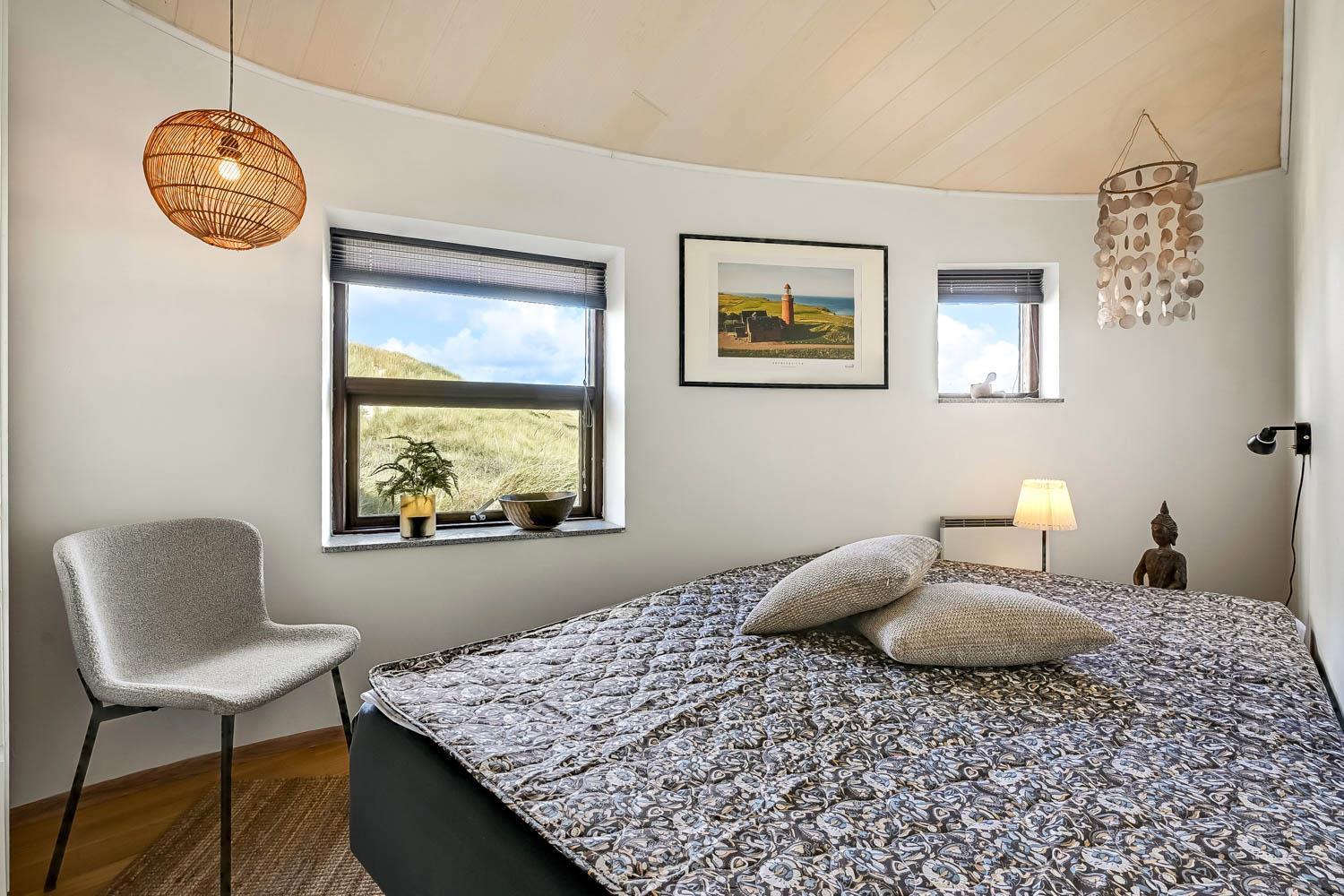 Schon wenn Sie mit Ihrem Auto über den Kiesweg das Haus erreichen, können Sie sehen, dass die Lage des Hauses etwas ganz Besonderes ist. Dieses Haus ist so einzigartig, dass man es erleben muss. Ein schöner Flur heißt Sie willkommen; hier gibt es viel Platz, um Ihre Kleidung aufzuhängen und außerdem stehen hier Waschmaschine und Trockner. Vom Flur kommen Sie in den Verteiler-Flur, hier haben Sie Zugang zu einem der Badezimmer im Haus, das sehr groß ist. Es ist mit einer Toilette, Waschbecken, Dusche, Fußbodenheizung und Whirlpool ausgestattet. In diesem Raum ist der spanische Baustil in den Vordergrund gerückt. Neben dem Badezimmer gibt einen Schlafraum mit 1DB und am Ende des Flures gibt es noch einen Schlafraum mit 1 DB. Vom Flur haben Sie Zutritt zum Esszimmer/Küche. Hier sind die Decken geöffnet und von hier gibt es einen Ausgang zu der überdachten Terrasse. Große Küche mit allem an Geschirr und Kochgeschirr; es gibt eine Induktionsplatte, einen eingebauten Ofen, Abzugshaube, Geschirrspüler, Mikrowelle und einen Kühl-/Gefrierschrank. Das Esszimmer ist eingerichtet mit einem Esstisch und einem schönen Kaminofen, der für eine gute Wärme sorgt, auch an kalten Tagen. Vom Esszimmer kommen Sie über einen kleinen Treppenaufgang zum „ Master Bedroom“ des Hauses mit einem DB; von hier haben Sie Zugang zu dem zweiten Badezimmer des Hauses mit Toilette, Waschbecken, Dusche und Zugang zu der Sauna. Von diesem Schlafraum haben Sie einen Ausgang zu einer offenen Terrasse, von der Sie den Blick auf die Dünen genießen können. Von dieser Terrasse kommen Sie über eine Treppe hoch auf die runde Terrasse ganz oben auf dem Turm. Von hier aus gibt es einen wunderschönen Blick über die Nordsee und über das ganze Gebiet um Vrist herum. Haben Sie ein Elektro-Auto oder einen Plug-in Hybrid, gibt es eine Ladebox (Type 2) zum Laden. Nichtraucher-Haus. 1 Haustier ist erlaubt.