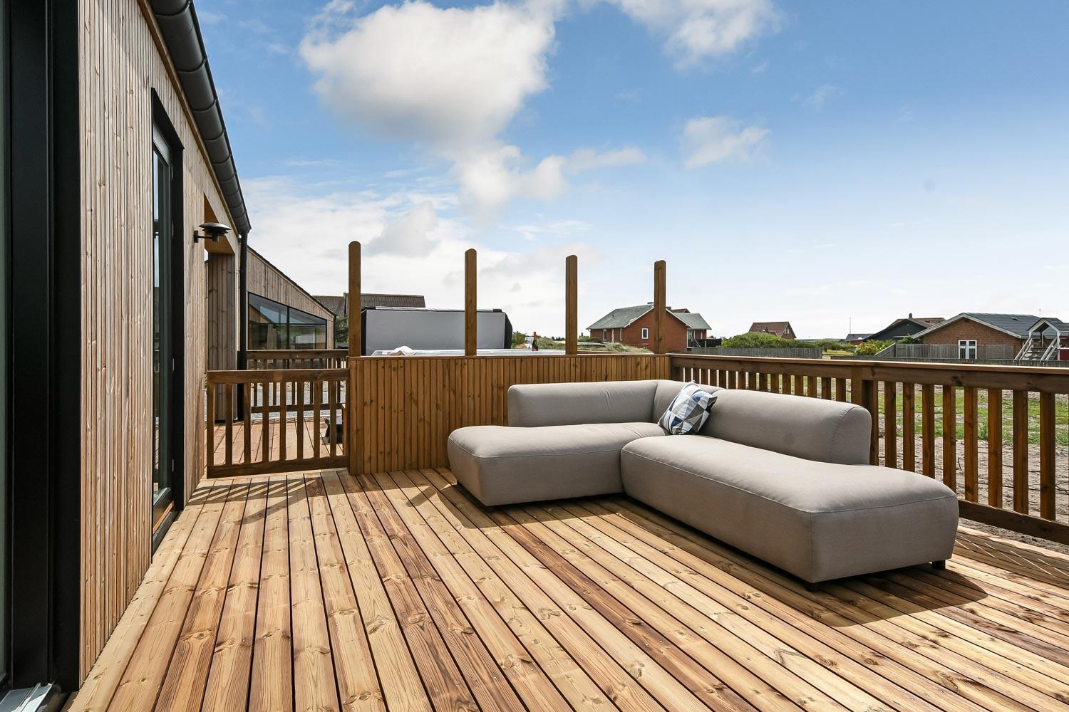 Nach einem Spaziergang in den Dünen können Sie zwischen dem Außen-Whirlpool oder einem Saunagang wählen – der Zugang zur Sauna erfolgt von außen. Zudem gibt es eine Außendusche mit Blick auf die Dünen – ein rundum besonderes Erlebnis. Dieser Bereich der Terrasse ist abgeschirmt und vollständig privat.