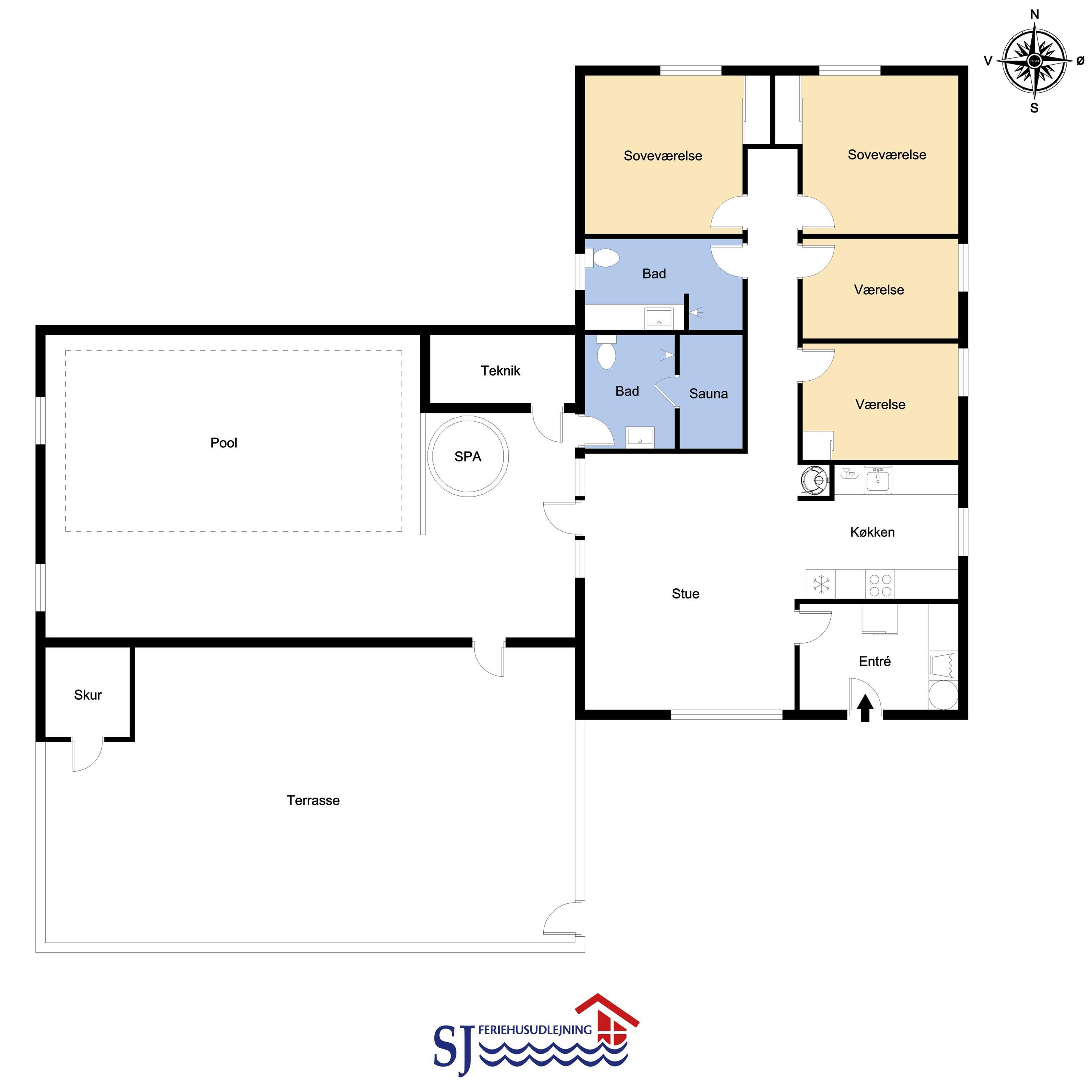 Herrliches Ferienhaus mit einer schönen, offenen Küche mit Wohn- und Essbereich. Im Wohnzimmer gibt es einen Holzofen, Flachbildschirm-TV mit dänischem und deutschem Programm (Satellitenschüssel). Die Küche ist gut ausgestattet, u. a. mit Geschirrspüler, Mikrowelle, Kühl- und Gefrierschrank. 4 Schlafzimmer mit Doppelbetten (DB) und Einzelbetten (EB): 1 DB + 1 DB + 2 EB + 2 EB. Das Haus hat 2 Badezimmer, beide mit Dusche und Fußbodenheizung, eines mit direktem Zugang zur Sauna. Im Poolraum finden Sie außer dem Pool mit Gegenstromanlage auch einen großen 5-Personen-Whirlpool. 1 Haustier ist erlaubt. D Kaution Wintersaison EUR 600 und Sommersaison EUR 300.