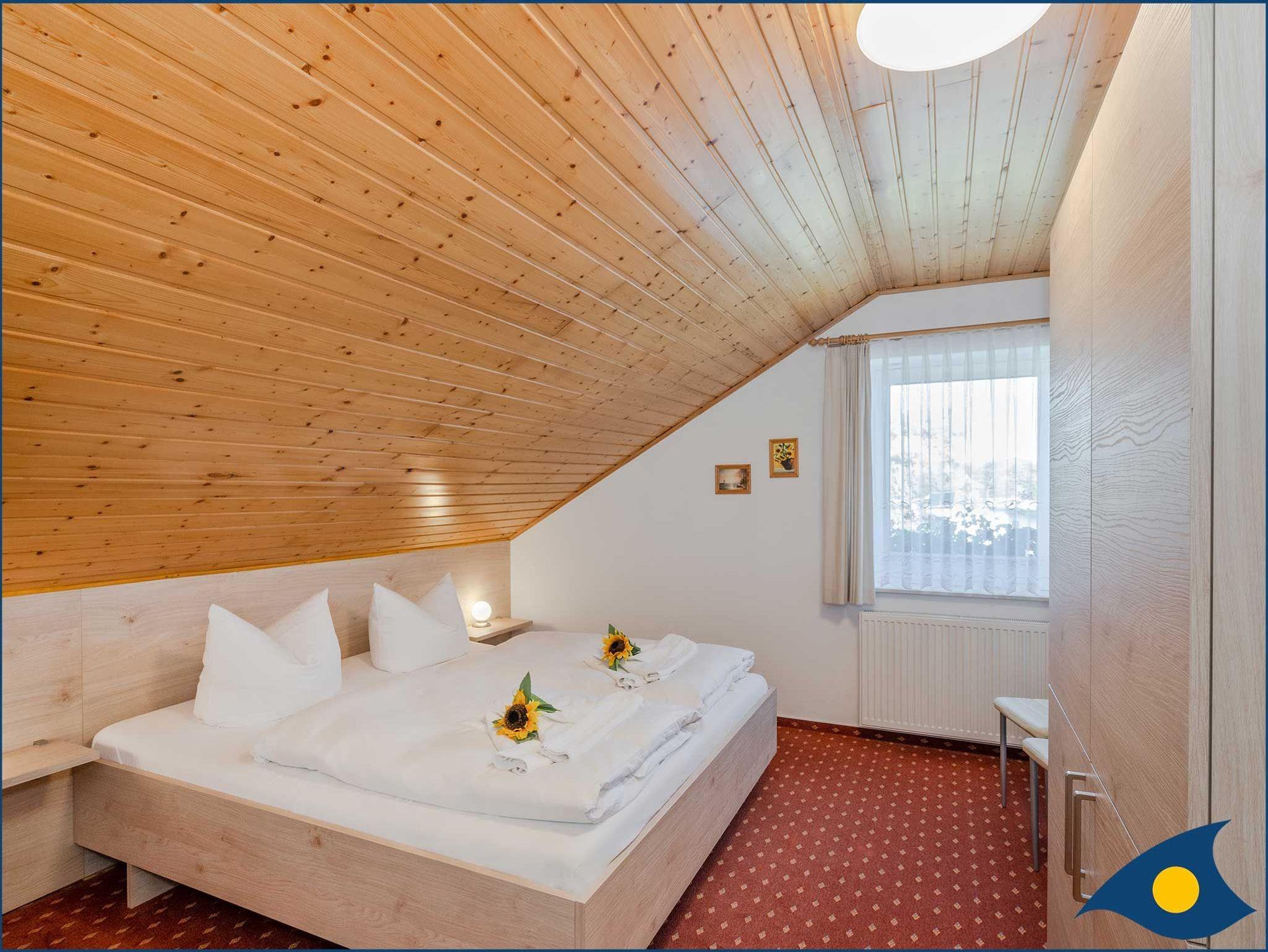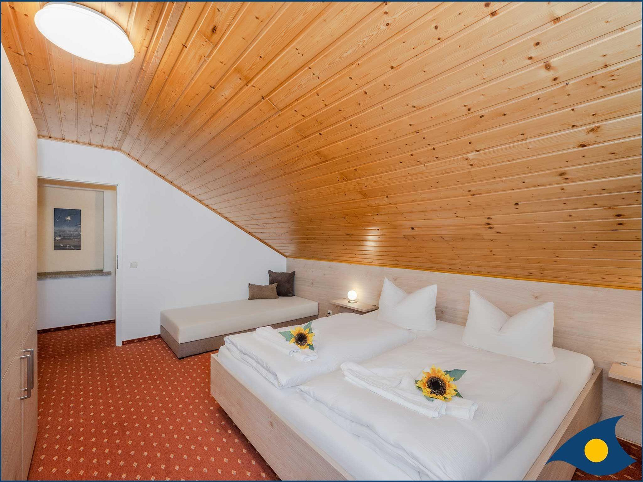 Eine schöne Holz-Treppe führt Sie in das Obergeschoss. Dort erwartet Sie unter dem Dach ein heimeliger Schlafraum. Neben dem großzügigen Doppelbett (180 x 200 cm) steht ein einzel Bett für die dritte Person zur Verfügung.