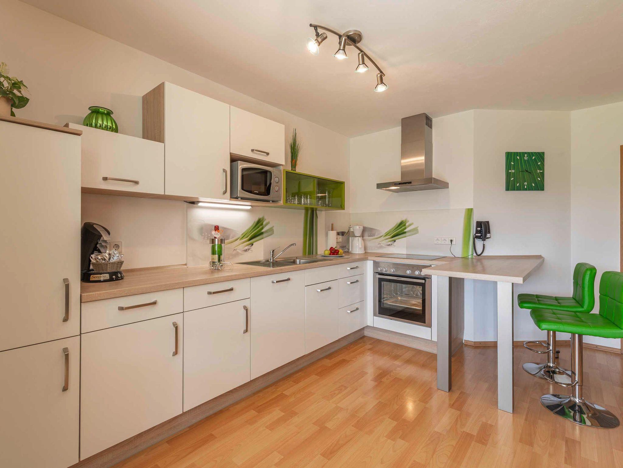 • Küche mit Geschirrspülmaschine, Kaffeemaschine, Senseo Pad-Maschine, Toaster, Mikrowelle, Wasserkocher, Brotschneidemaschine, Kühlschrank mit Gefrierfach A+++, 4-Platten Cerankochfeld mit Backofen.