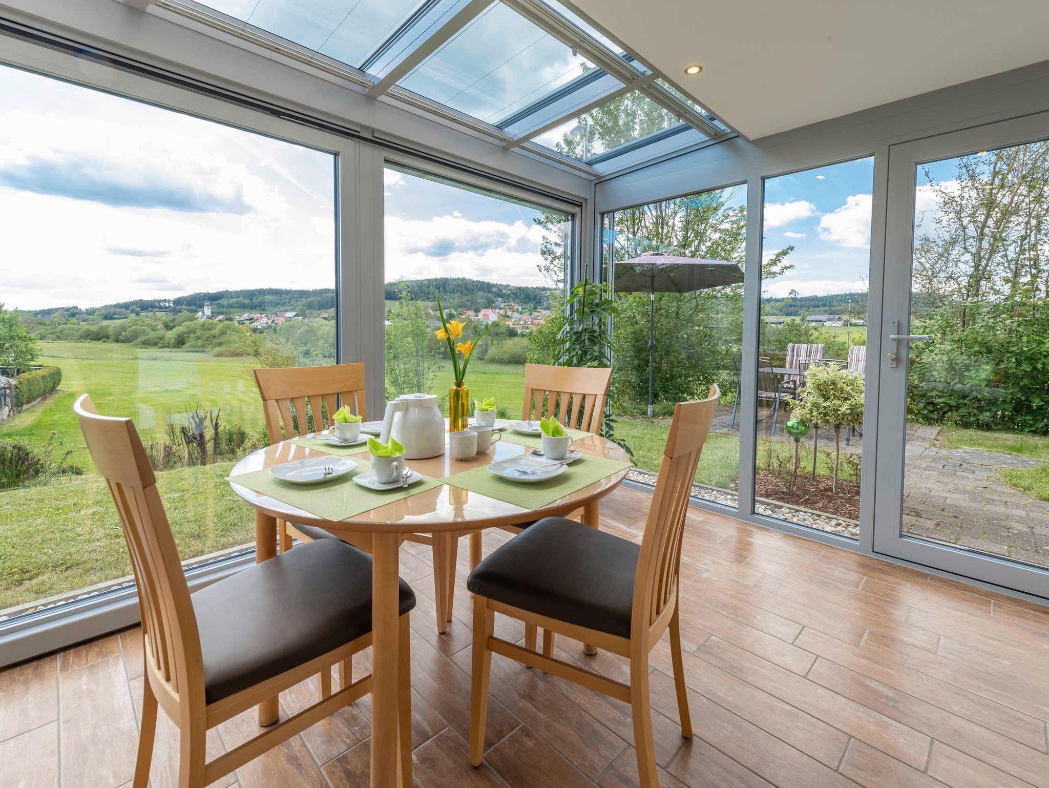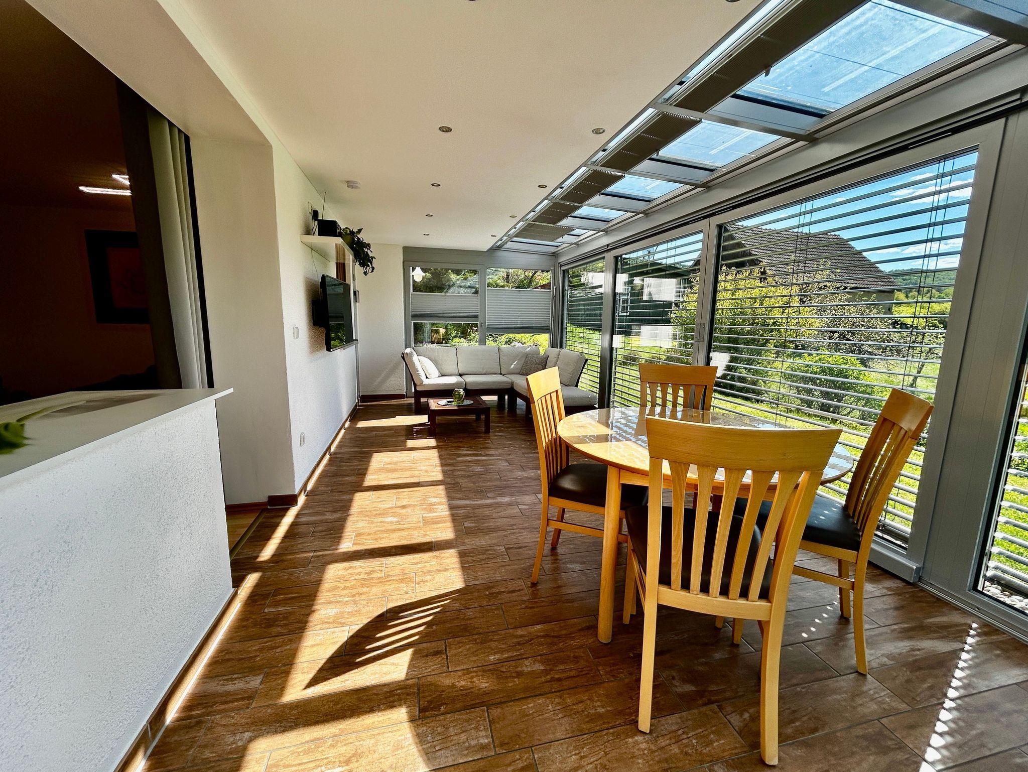 • 21qm großer komfort Wohnwintergarten mit Beschattungsanlage, Fußbodenheizung, 42 Zoll Fernseher mit Internetzugang und Apps, Essplatz und gemütliche Relaxmöbeln.