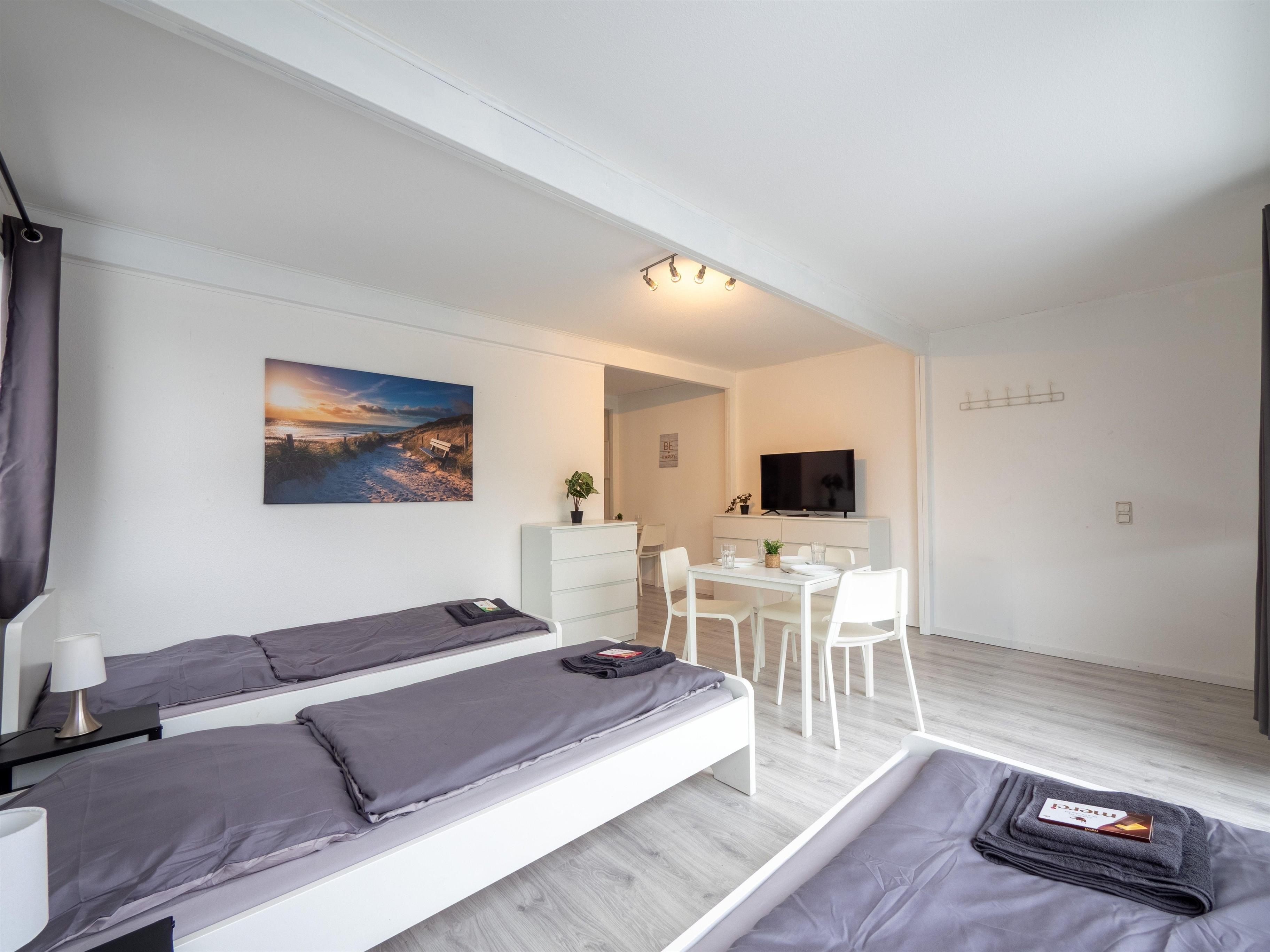 - Schlafzimmer 2: 3 Einzelbetten, Smart-TV, Nachttisch, Bettwäsche