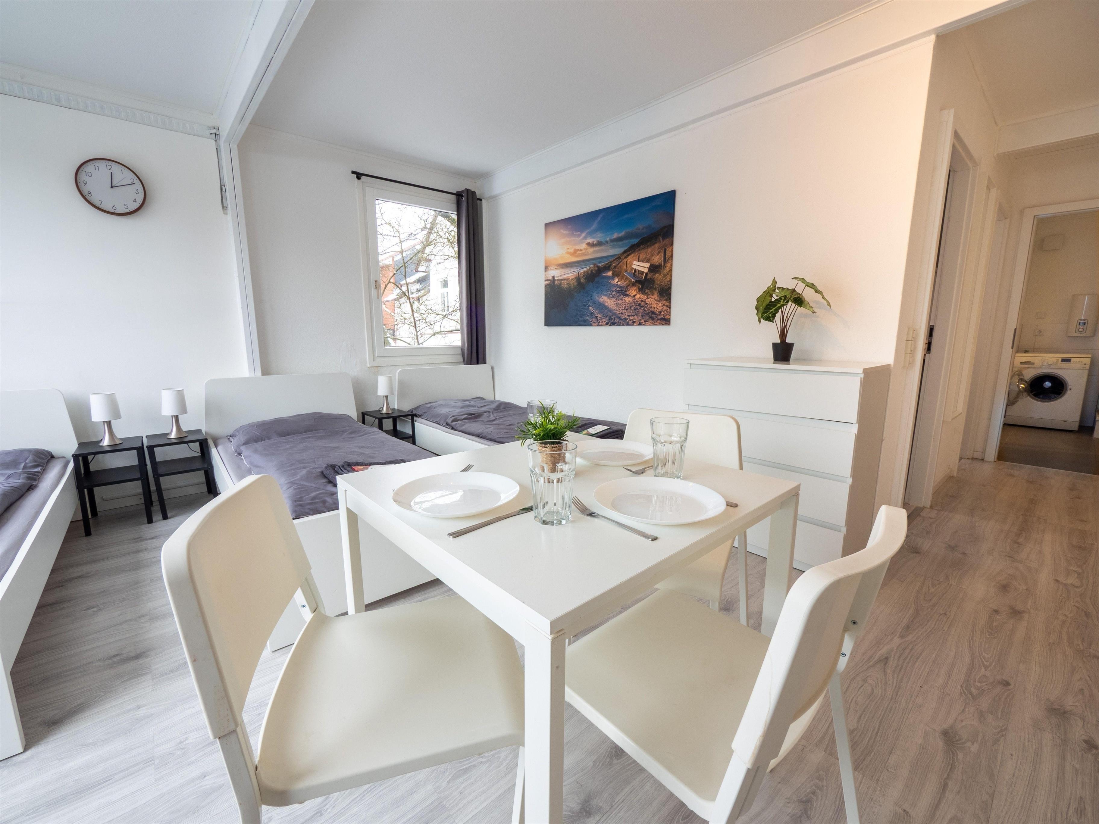 Monteurwohnung im 1. OG mit Balkon, zentral in Ahrensburg. 2 Zimmer mit insgesamt 5 Einzelbetten, Smart-TV, WLAN, voll ausgestatteter Küche. Ideal für Teams im Einsatz rund um Hamburg.