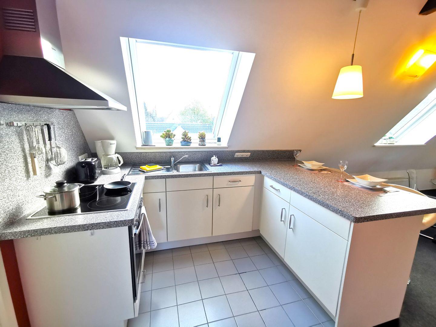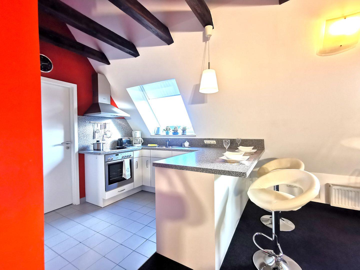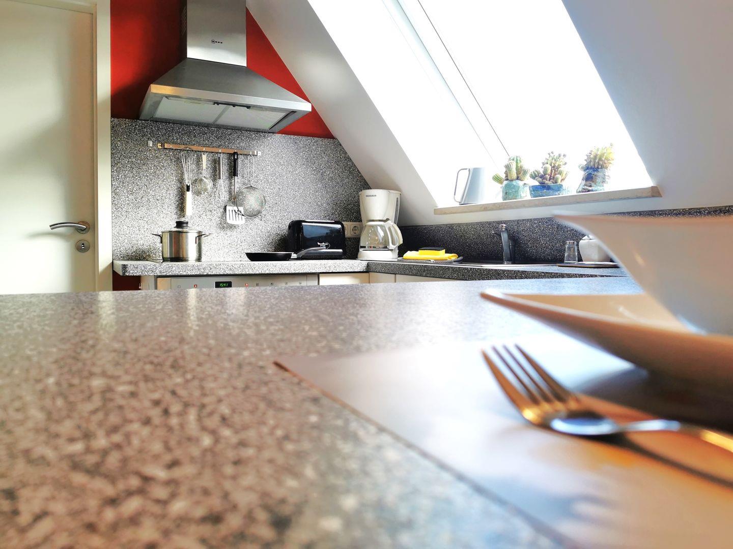 Die offene Küche mit Tresen und Barhockern ist voll ausgestattet mit Kaffeemaschine, Toaster, Wasserkocher, Herd, Backofen und allen Küchenutensilien.