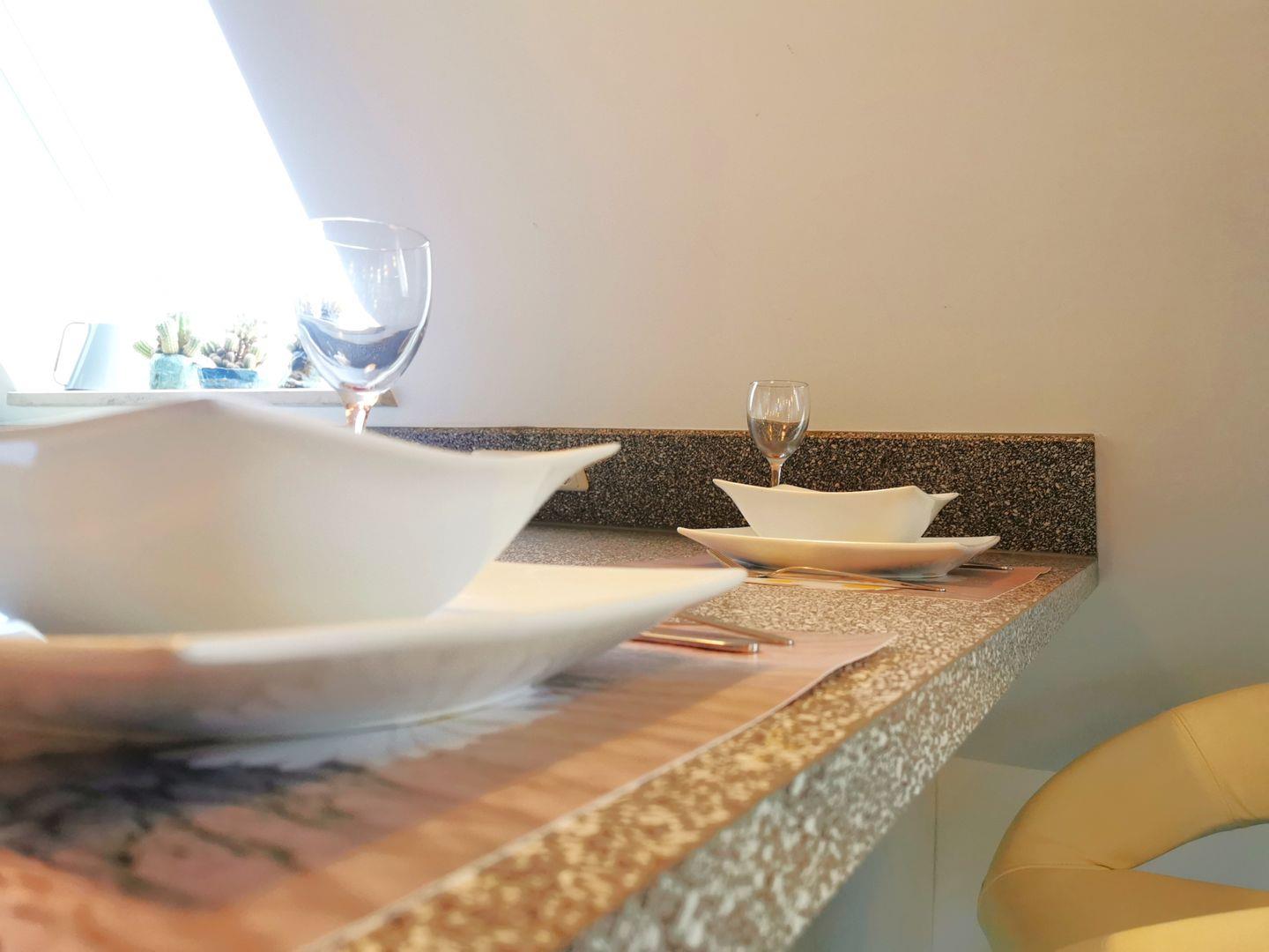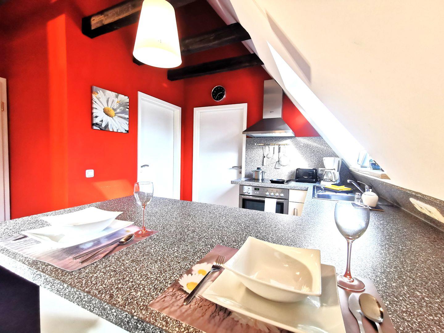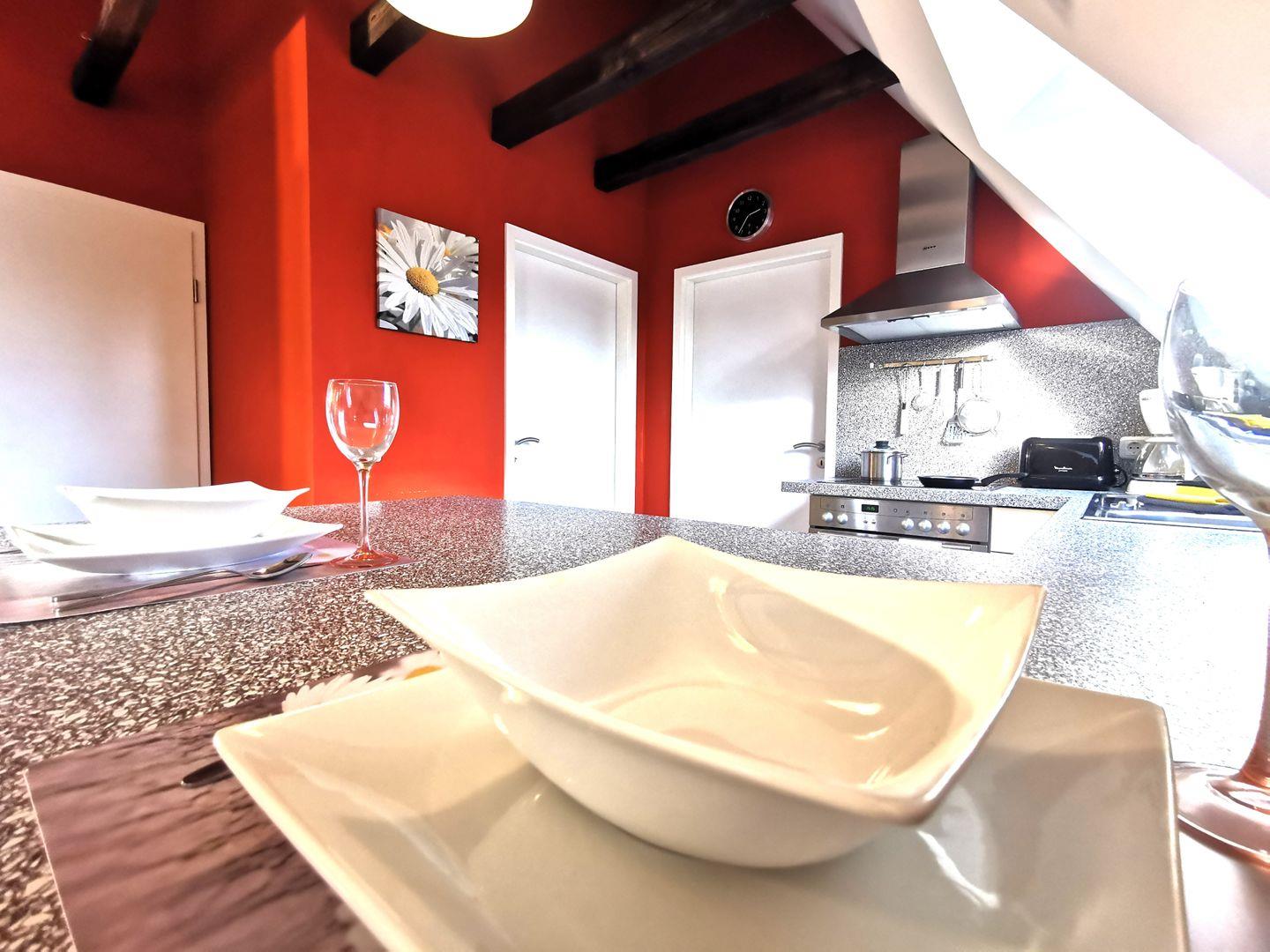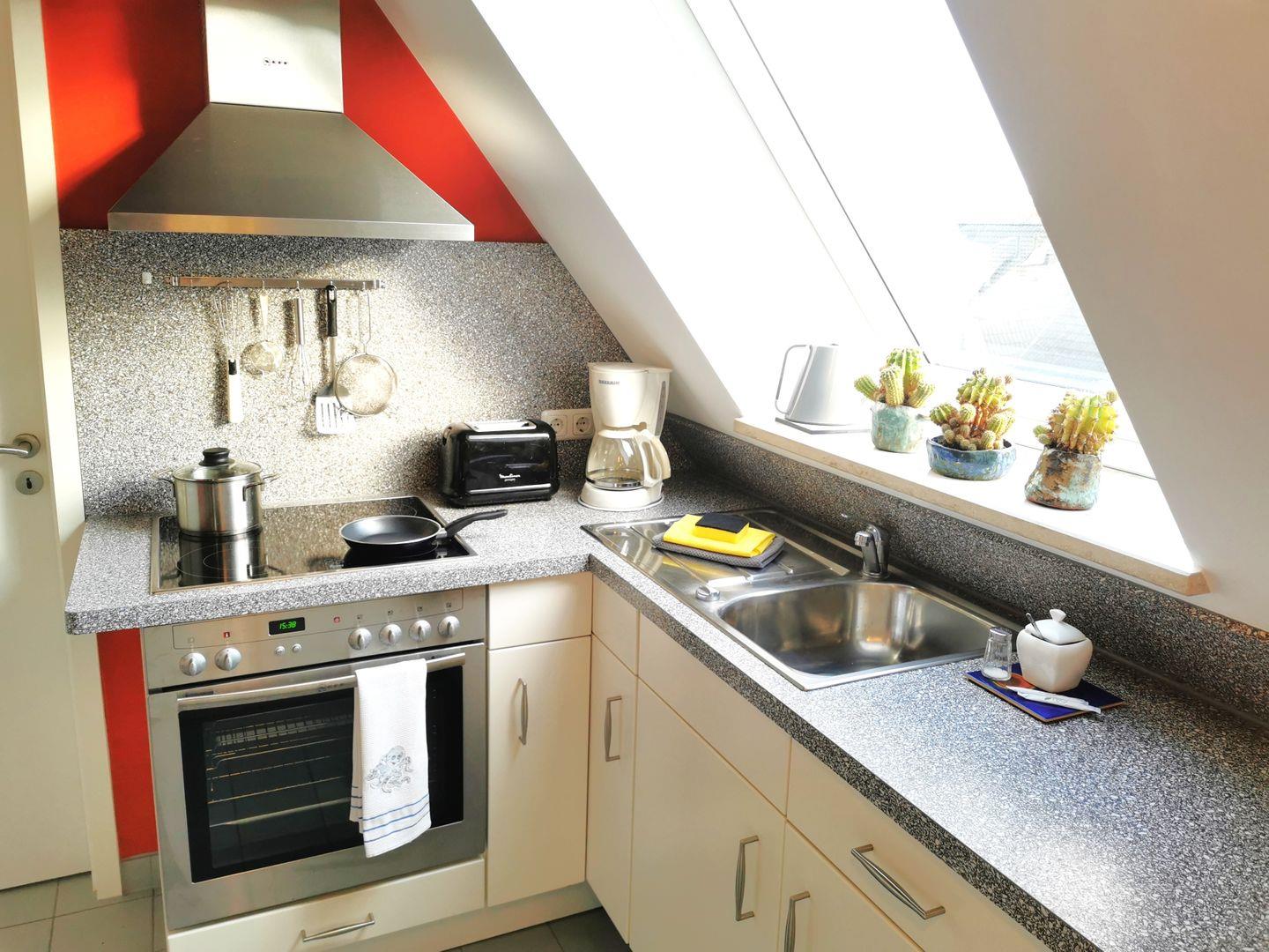 Die offene Küche mit Tresen und Barhockern ist voll ausgestattet mit Kaffeemaschine, Toaster, Wasserkocher, Herd, Backofen und allen Küchenutensilien.