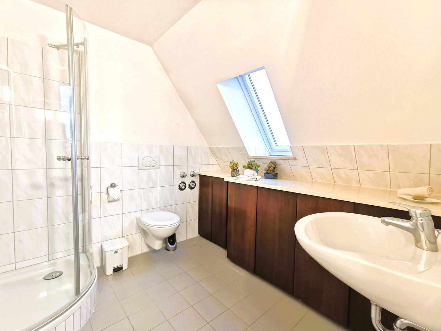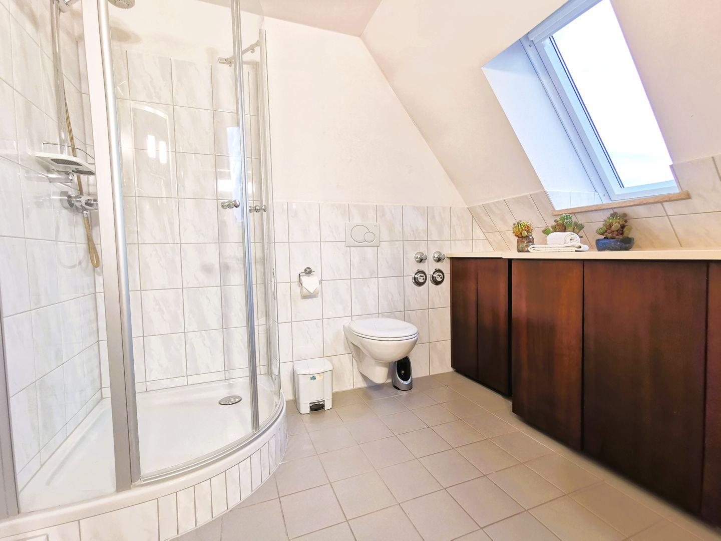 Das hochwertig eingerichtete Badezimmer mit Dusche, WC und Waschmaschine ist zeitlos und zweckmäßig.