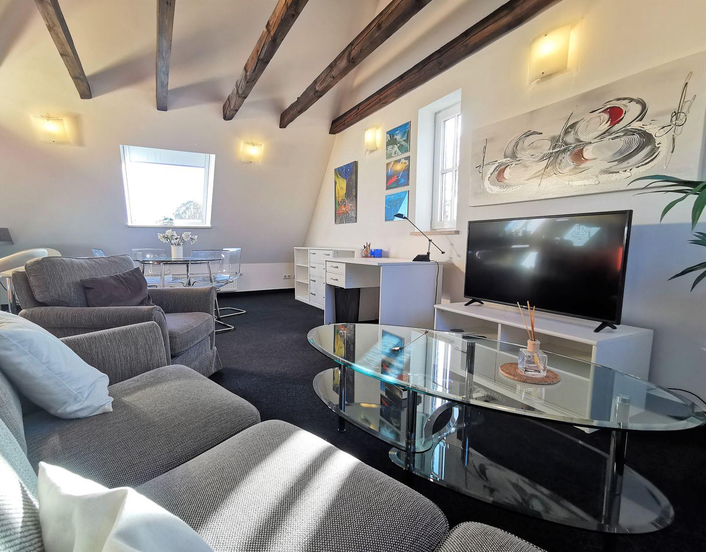 Die sichtbaren Holzbalken im Wohnbereich mit offener Küche setzen die hohen Decken in Szene. Der moderne Essbereich integriert sich neben der gemütlichen Sofaecke mit großen Smart TV. Der Schreibtisch für Homeoffice-User fügt sich ins in die sehr helle Wohnung ein.