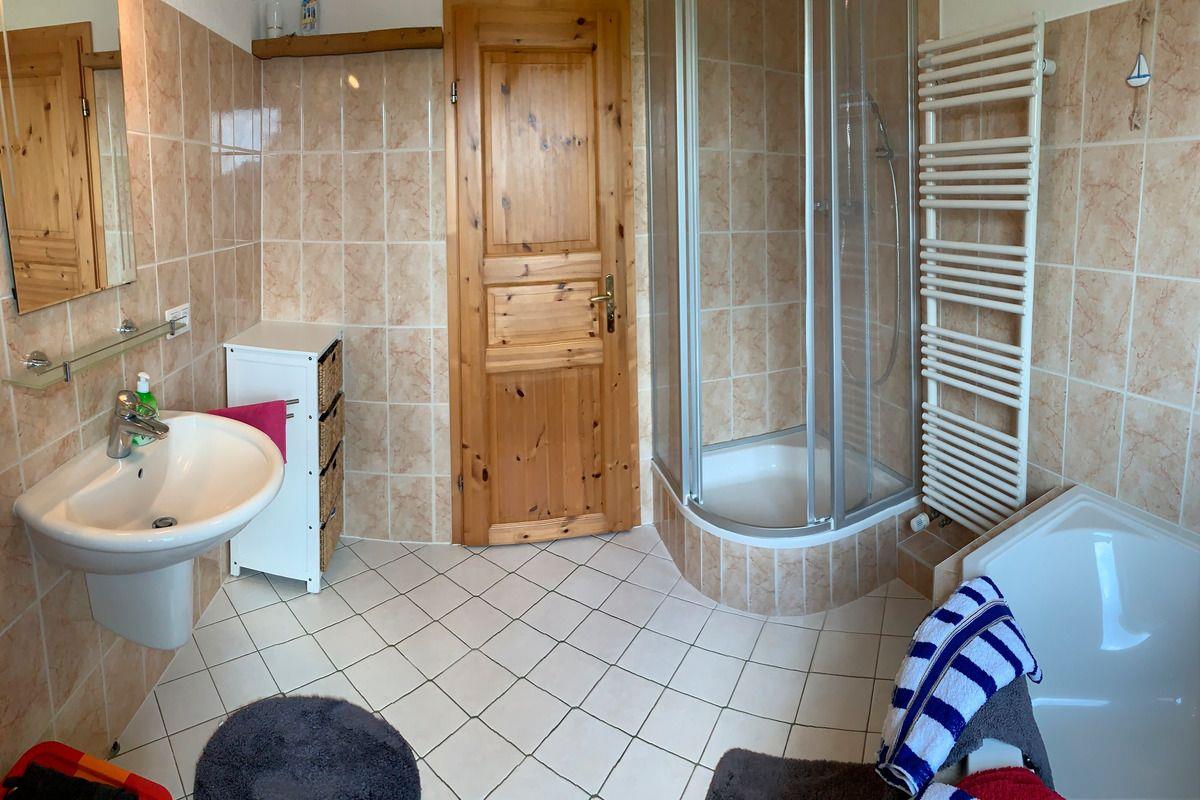 Die Ferienwohnung in Ahrenshagen ist großzügig geschnitten und hochwertig eingerichtet. Durch ein kleines Treppenhaus gelangen Sie über Ihren eigenen Eingang in die Wohnung. Vorne im Flur steht ein Kleiderschrank. In der gut ausgestatteten Einbauküche finden Sie einen Backofen, ein Cerankochfeld, eine Mikrowelle, einen Grill, einen Geschirrspüler, eine Waschmaschine, einen Kühlschrank, einen Toaster, eine Kaffeemaschine, einen Wasserkocher und eine Espressomaschine. Des Weiteren steht in der Küche einen Esstisch mit Stühlen. Im Bad gibt es eine Dusche, eine Eckbadewanne, ein WC und ein Waschbecken. Das Wohnzimmer ist mit zwei Ledercouchen, einem kleinen Tisch, Regalen und einem Siteboard, dem Fernseher, einer Stereoanlage, einem DVD-Player und einem Kaminofen ausgestattet. Die Ferienwohnung verfügt über zwei Schlafzimmer. Eins ist mit einem Doppelbett und einer Kommode möbliert. Im zweiten Schlafzimmer stehen zwei Einzelbetten und ein Kleiderschrank. Durch das Wohnzimmer gelangen Sie auf Ihren Balkon. Im Garten gibt es ein Pavillon, den Sie gerne nutzen können. Dort stehen auch Gartenmöbel und ein Grill für Sie bereit.Vor der Haustür ist eine weitere kleine Terrasse, auf der Sie die Morgensonne genießen können. Ein PKW-Parkplatz mit Carport ist auf dem Grundstück vorhanden.