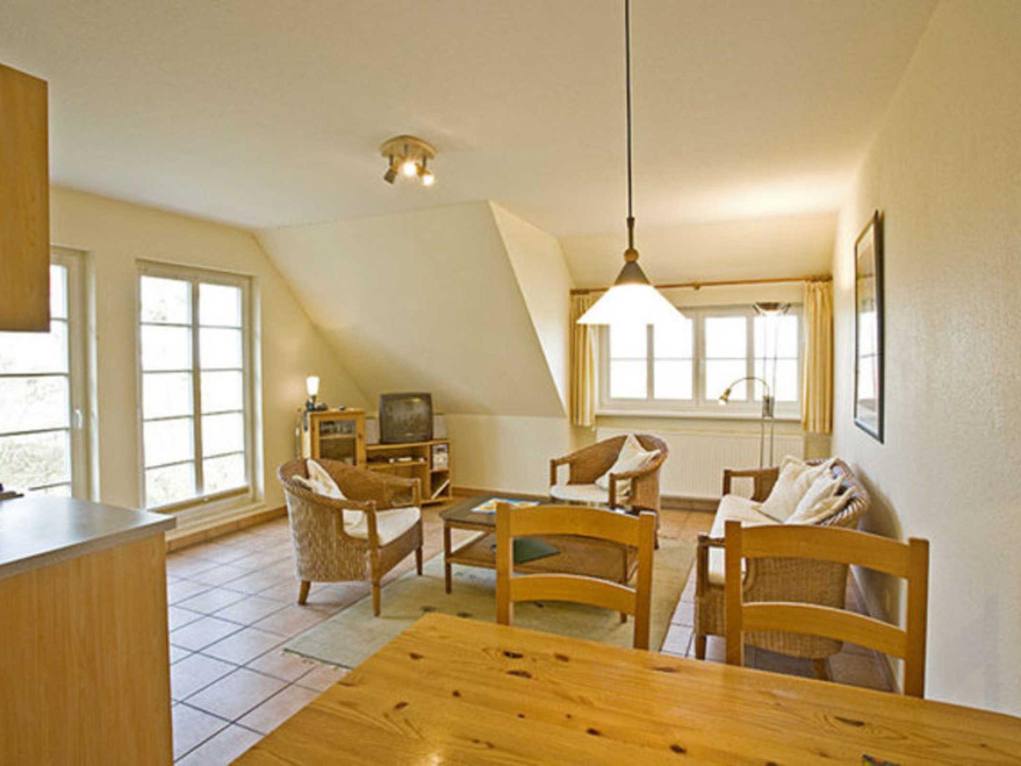 Die Wohnung Kurt für 4 Personen im Obergeschoß ist auf der Südseite des Hauses. Vom Wohnzimmer mit der Küchenzeile haben Sie den reizvollen Blick auf die Ostsee und können eindrucksvolle Sonnenuntergänge erleben. Eines der zwei Schlafzimmer (je 2 Betten) hat einen kleinen Südbalkon mit Tisch und Stühlen. Das Bad hat ein kleines Fenster und ist mit einer Dusche ausgestattet.