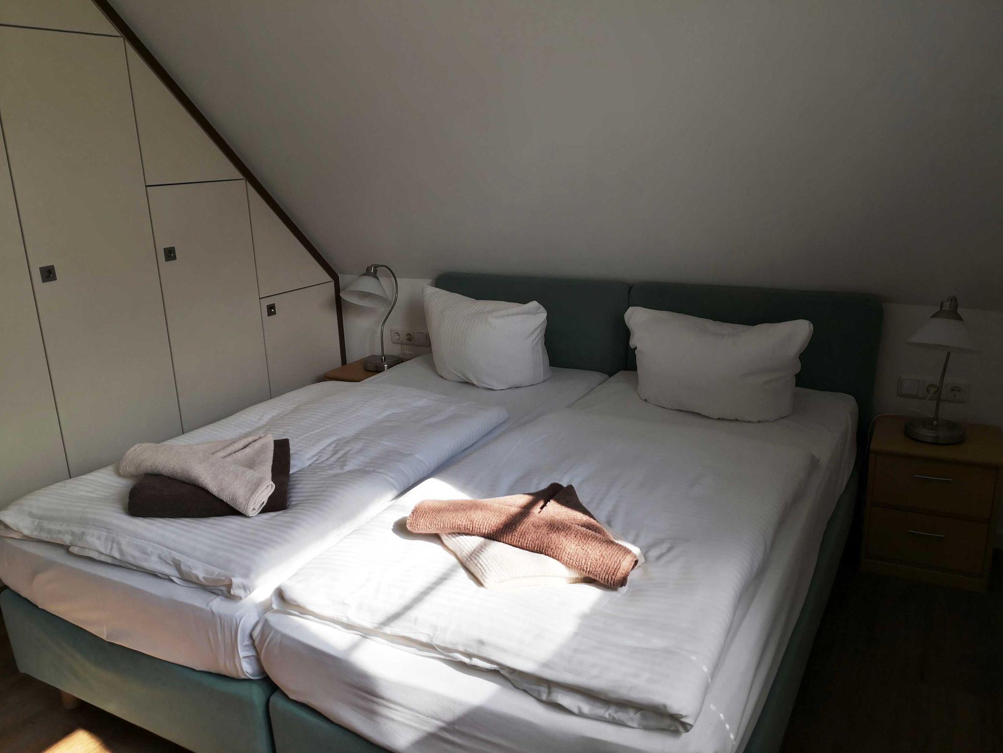 Im Obergeschoss des Gästehauses befinden sich sieben Doppelzimmer, die auch zur Einzelnutzung buchbar sind.