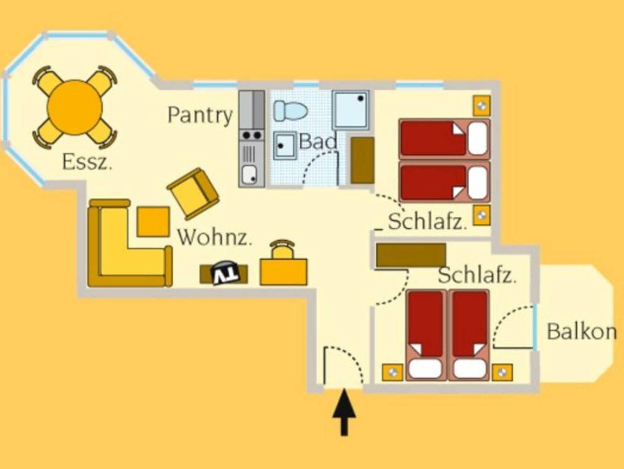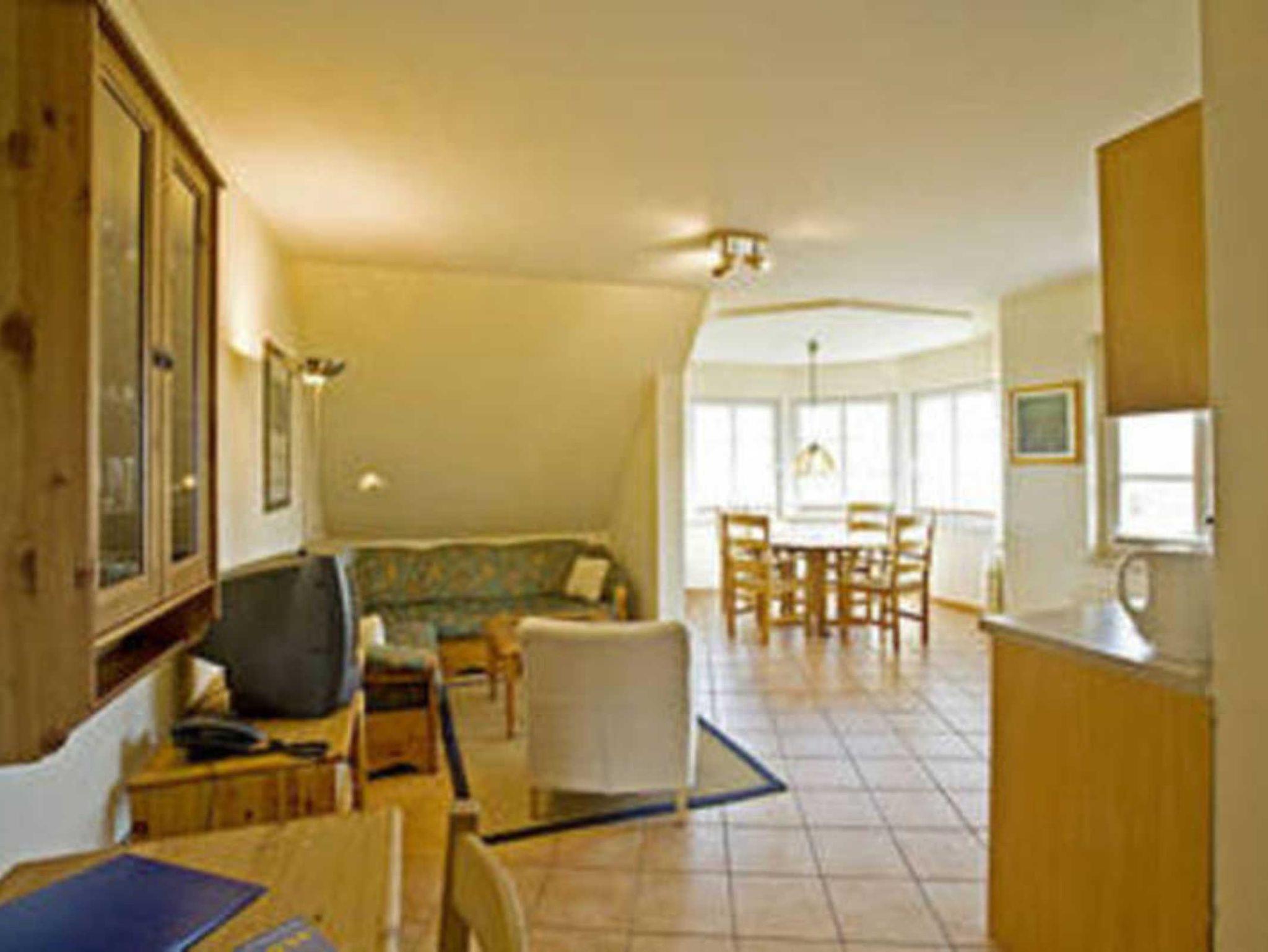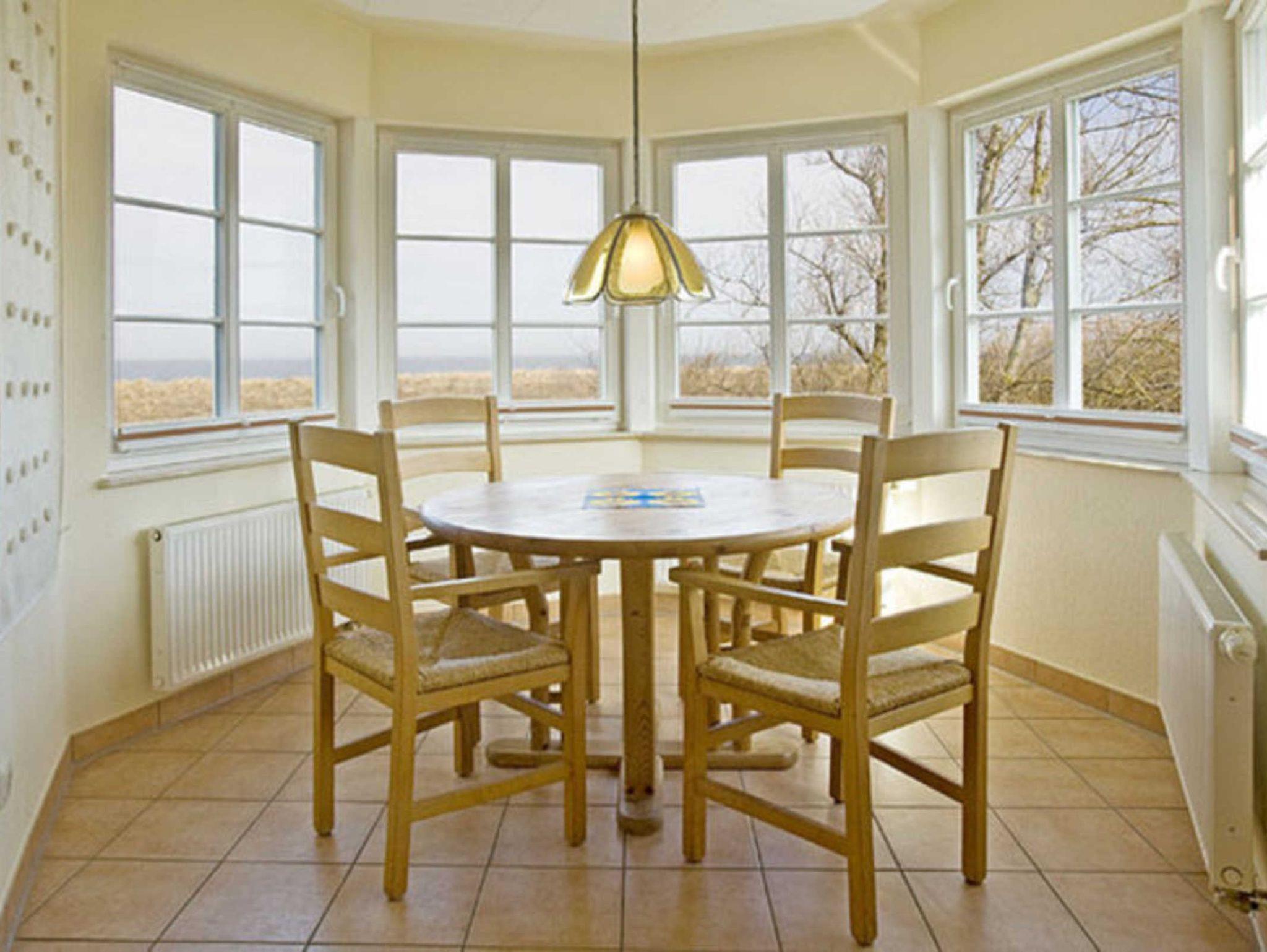 Die Wohnung Fritz für 4 Personen im Obergeschoß ist geprägt von dem runden Esstisch im Erkerturm. Die Morgen- und Abendsonne und der Blick auf die Ostsee geben diesem Wohnzimmer mit der Küchenzeile den besonderen Reiz. Die Eckcouch und der Sessel ermöglichen das gemütliche Sitzen am Abend. Der Schreibtisch kann auch als Ablage genutzt werden. Eines der zwei Schlafzimmer (je 2 Betten) hat einen kleinen Südbalkon mit Tisch und Stühlen. Das Bad hat ein kleines Fenster und ist mit einer Dusche ausgestattet.