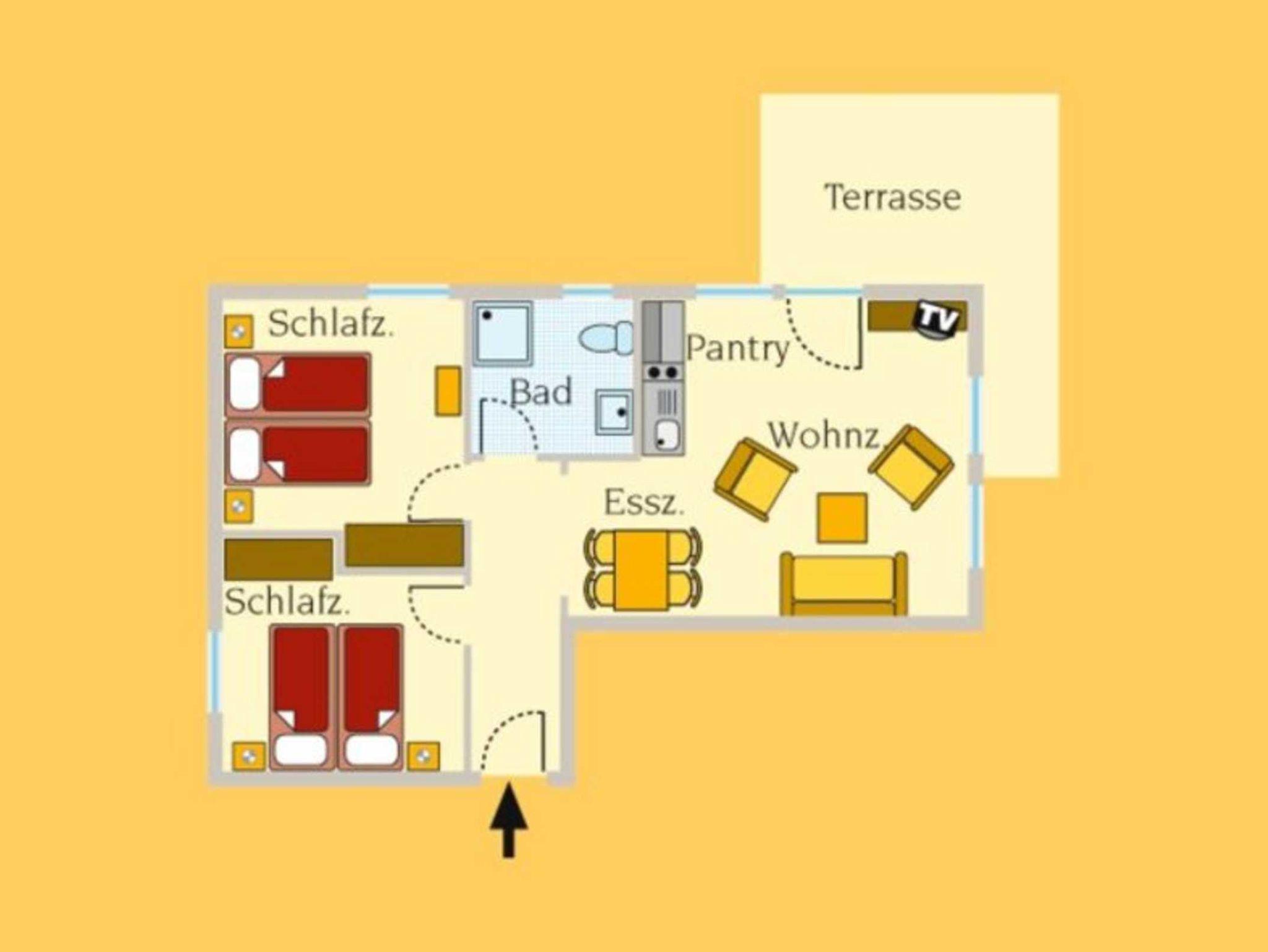 Die Wohnung Karl für 4 Personen im Erdgeschoß ist rollstuhlfahrerfreundlich eingerichtet. Sie ist auf der kleinen Düne vor dem Haus über die Südterrasse der Wohnung ohne Türschwellen zu erreichen. Neben dem großzügigen Wohnbereich mit Esstisch und Küchenzeile gibt es 2 Schlafzimmer (je 2 Betten). Das eine ist mit 2 elektrisch beweglichen Lattenrosten ausgestattet. Das Bad mit Fenster hat eine Duschecke mit Bodenablauf und einhängbaren Duschsitz. Das WC hat einen rechten großen Haltegriff und das Waschbecken ist unterfahrbar. Alle Türen sind min. 80 cm breit. Zur großen Süd-Terrasse gehören Tisch, Stühle und ein Sonnenschirm.