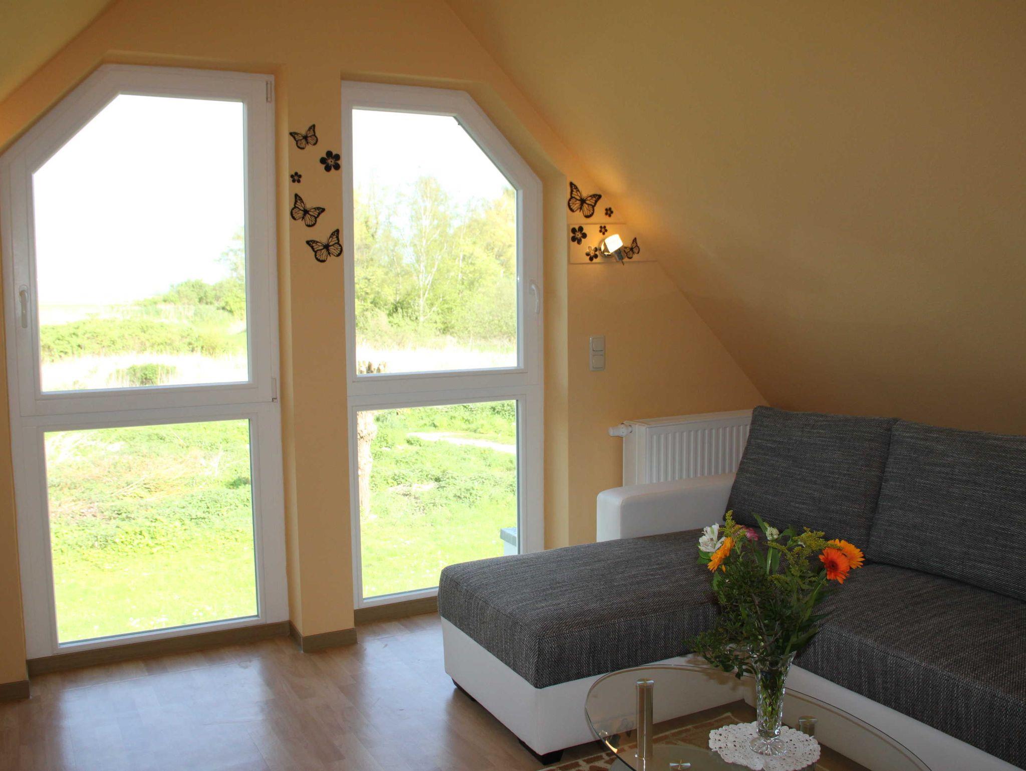 Direkt am Rad- und Wanderweg auf einem großen Grundtsück finden Sie in ruhiger Lage dieses gemütliche, separate Ferienhaus. In wenigen Gehminuten erreichen Sie den Bodden und den Hafen. Aber auch der Strand ist nur 10 Minuten Fußweg entfernt. Das Ferienhaus ist mit einem Wohnzimmer, zwei Schlafzimmern, einer separaten Küche und einem Badezimmer mit Dusche und WC ausgestattet. Ein Schlafzimmer befindet sich im Erdgeschoss, das zweite Schlafzimmer im Obergeschoss. Im Schlafzimmer unten können bis zu 3 Personen schlafen. Die Betten im Zimmer können getrennt werden. Für die 3. Person im Schlafzimmer wird ein Zustellbett bereit gestellt. In der voll ausgestatteten Küche finden Sie ebenfalls einen Essplatz. Bei schönem Wetter können Sie die eigene Terrasse am Haus benutzen. Im Preis enthalten sind Bettwäsche und Handtücher.