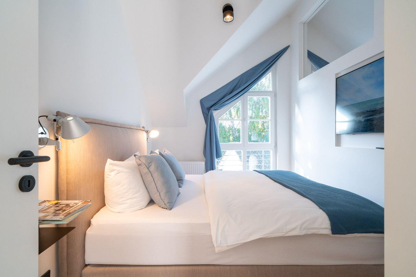 Das separate Schlafzimmer mit Boxspring-Doppelbett bietet angenehmen Rückzug nach langen Strandtagen. Natürliche Farben und reduzierte Materialien schaffen eine entspannte, nordisch inspirierte Atmosphäre.