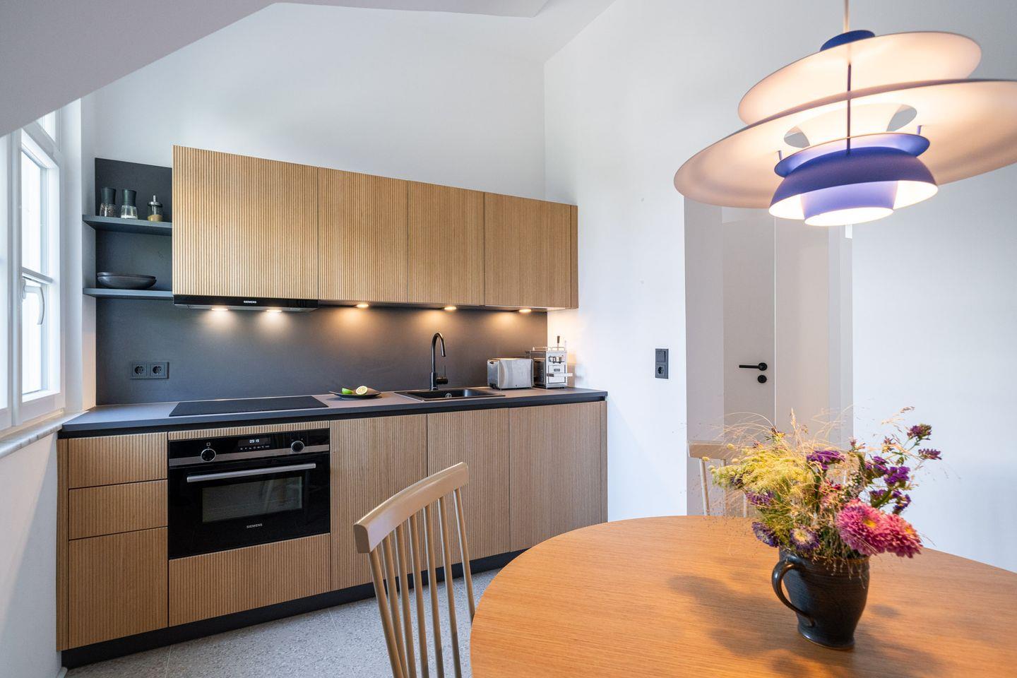 Die moderne Küche ist vollständig ausgestattet und lädt dazu ein, regionale Zutaten vom Markt in Ahrenshoop zuzubereiten. Das Badezimmer mit Raindance-Dusche sorgt nach Spaziergängen entlang der Ostsee oder durch die Boddenlandschaft für entspannte Momente.