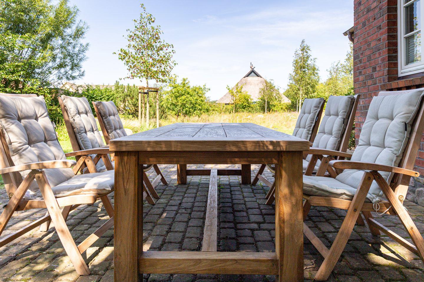 Im Erdgeschoss erwarten einen zwei gemütliche Schlafzimmer, ein großzügiger Küchen- und Essbereich mit viel Platz für gemeinsame Stunden sowie eine separate Wohnzimmerecke mit Kamin und TV – perfekt für entspannte Abende. Das Badezimmer auf dieser Ebene bietet sowohl Dusche als auch Badewanne. Über eine Treppe gelangt man ins Obergeschoss mit einem dritten, großzügigen Schlafzimmer, einem weiteren Badezimmer und einer hauseigenen Sauna. Ein Highlight zum Abschalten nach einem Strandtag. Vom Balkon aus genießt man einen wunderbaren Blick ins Grüne und die Umgebung. Auch der Außenbereich des Kapitänshauses lädt zum Verweilen ein: Auf der geschützten Terrasse lässt sich die Sonne genießen, im Garten auf einer Bank unter alten Bäumen entspannen oder den Tag bei einem Glas Wein ausklingen lassen. Das großzügige Grundstück bietet viel Platz im Grünen und an der frischen Luft. Ein charmantes Gartenhaus und ein hochwertiger Gasgrill stehen ebenfalls zur Verfügung. Da steht dem Grillabend im Sommer nichts im Wege. Es gehört ein PKW-Stellplatz zum Haus.