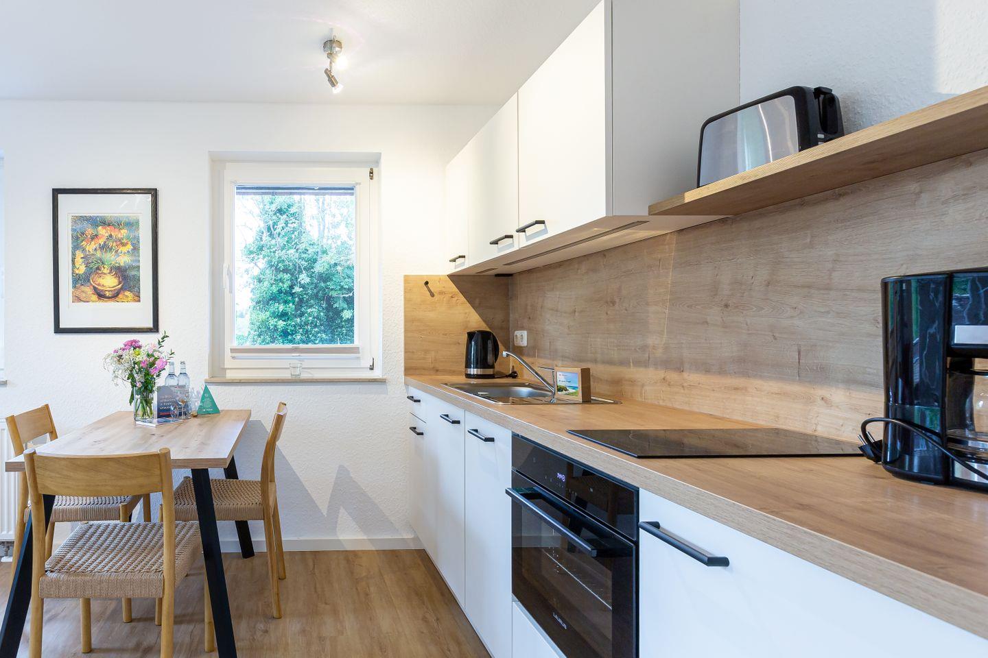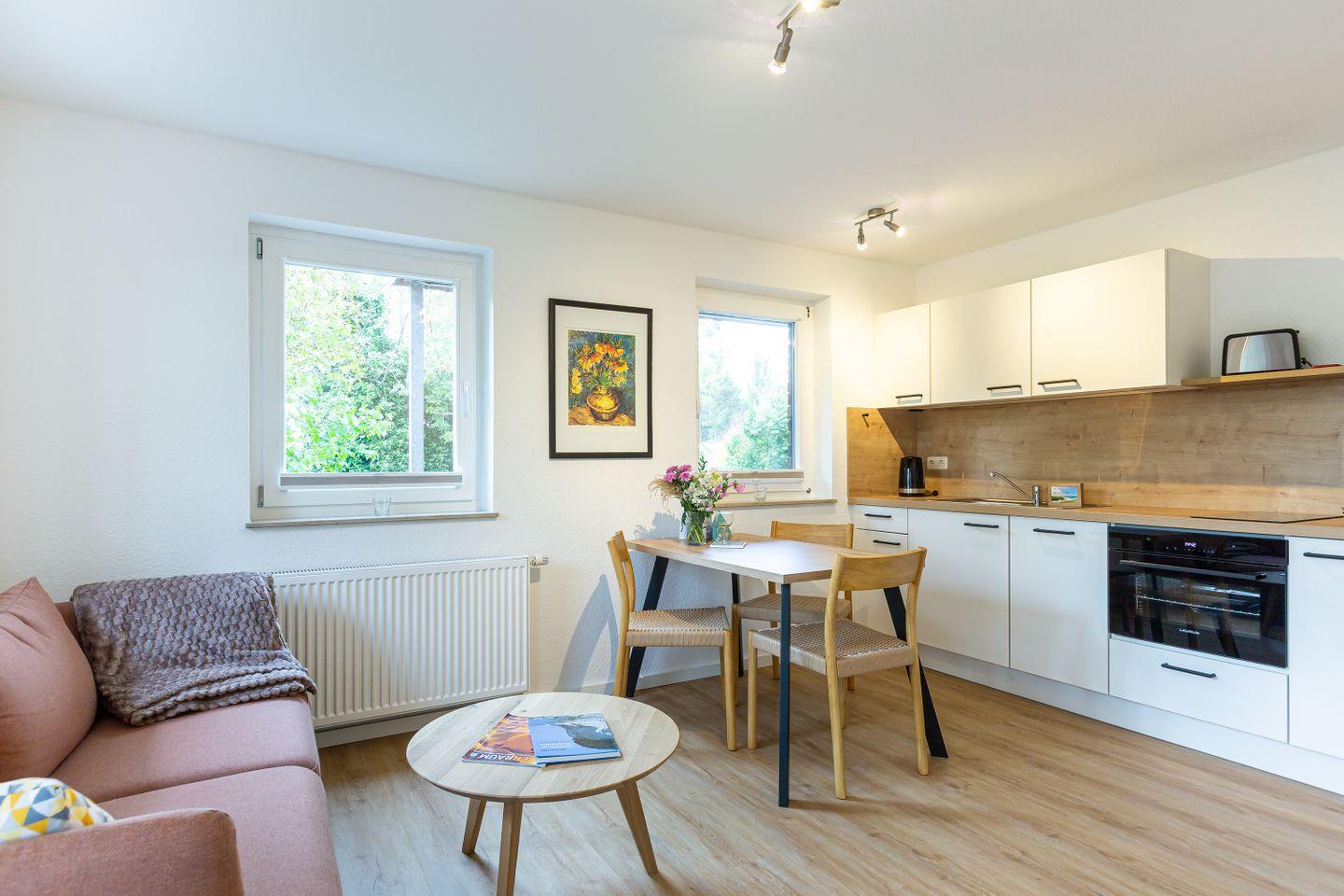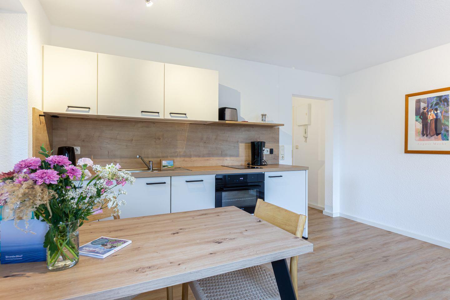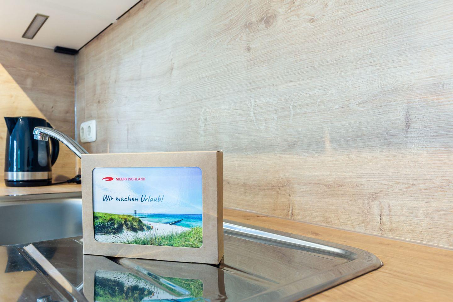Diese 37 Quadratmeter große Ferienwohnung bietet alles, was man für einen entspannten Urlaub an der Küste braucht. Der offene Wohn- und Küchenbereich ist hell und einladend, ideal für gemütliche Abende, gemeinsames Kochen oder einfach zum Abschalten nach einem Tag am Strand. Im separaten Schlafzimmer wartet ein bequemes Bett auf müde Urlauber, das moderne Bad sorgt mit klaren Linien und angenehmer Ausstattung für Wohlfühlmomente.