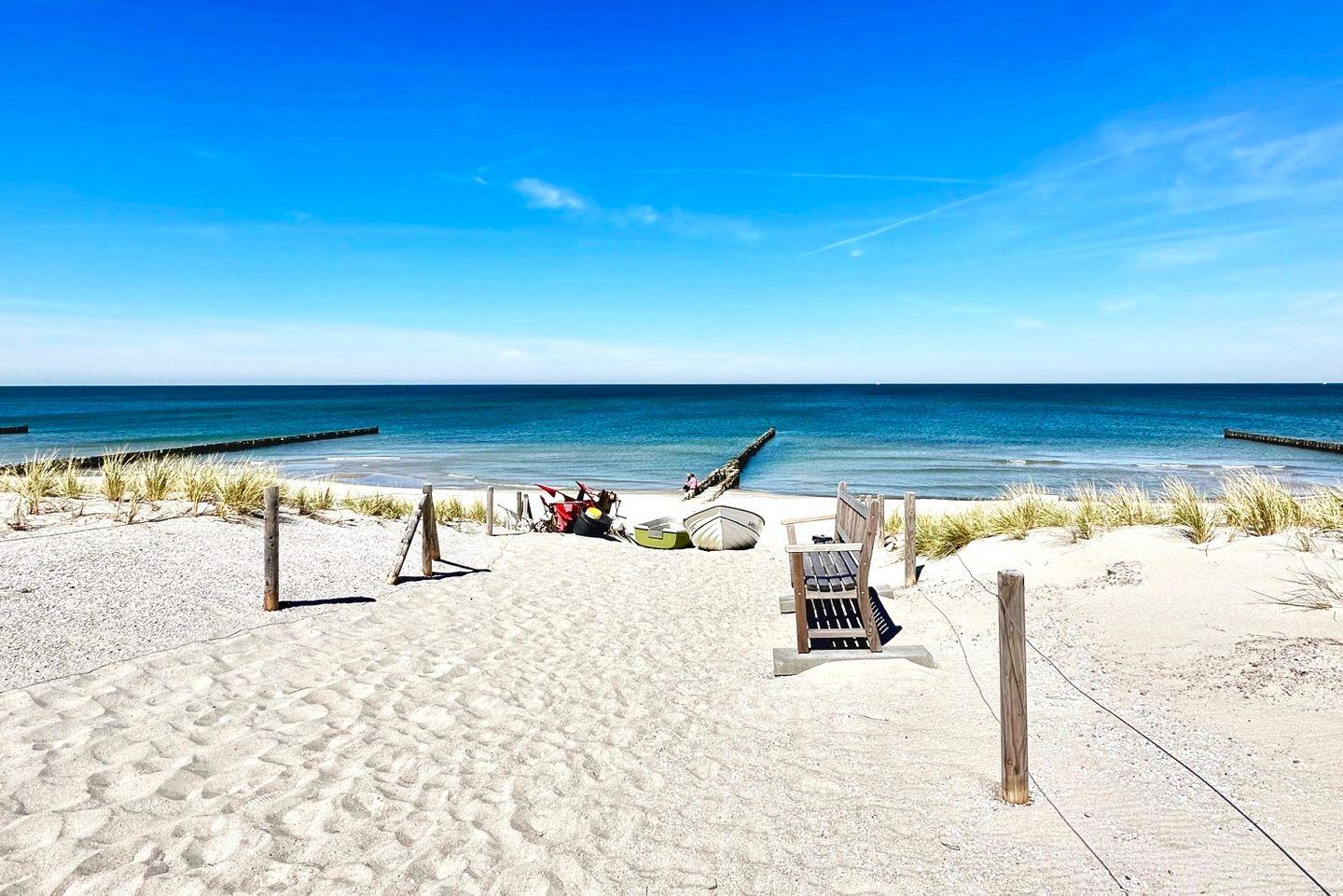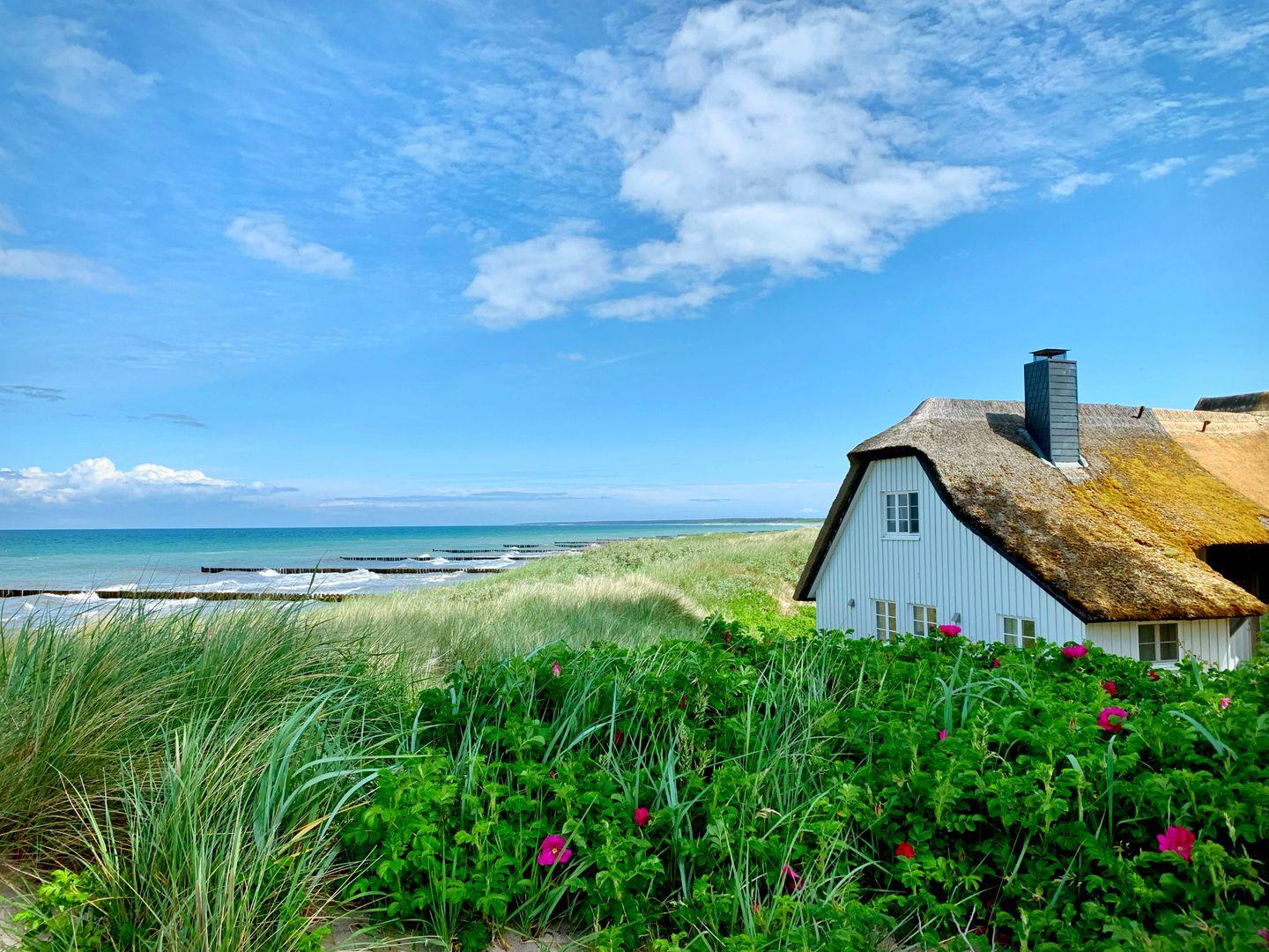 Hier beginnt dein Urlaub. Nur ein paar Schritte und schon ist man mittendrin im typischen Ahrenshooper Mix aus Natur, Kunst und Seeluft. Der feinsandige Strand liegt ganz in der Nähe, ebenso der idyllische Bodden mit seinen stillen Uferwegen. Es ist die perfekte Lage für Spaziergänge, Radtouren oder einfach zum Durchatmen. Cafés laden zum Verweilen ein, der Weststrand lockt mit wild-romantischer Ursprünglichkeit und wer mag, lässt sich vom Licht des Abends über dem Meer verzaubern.