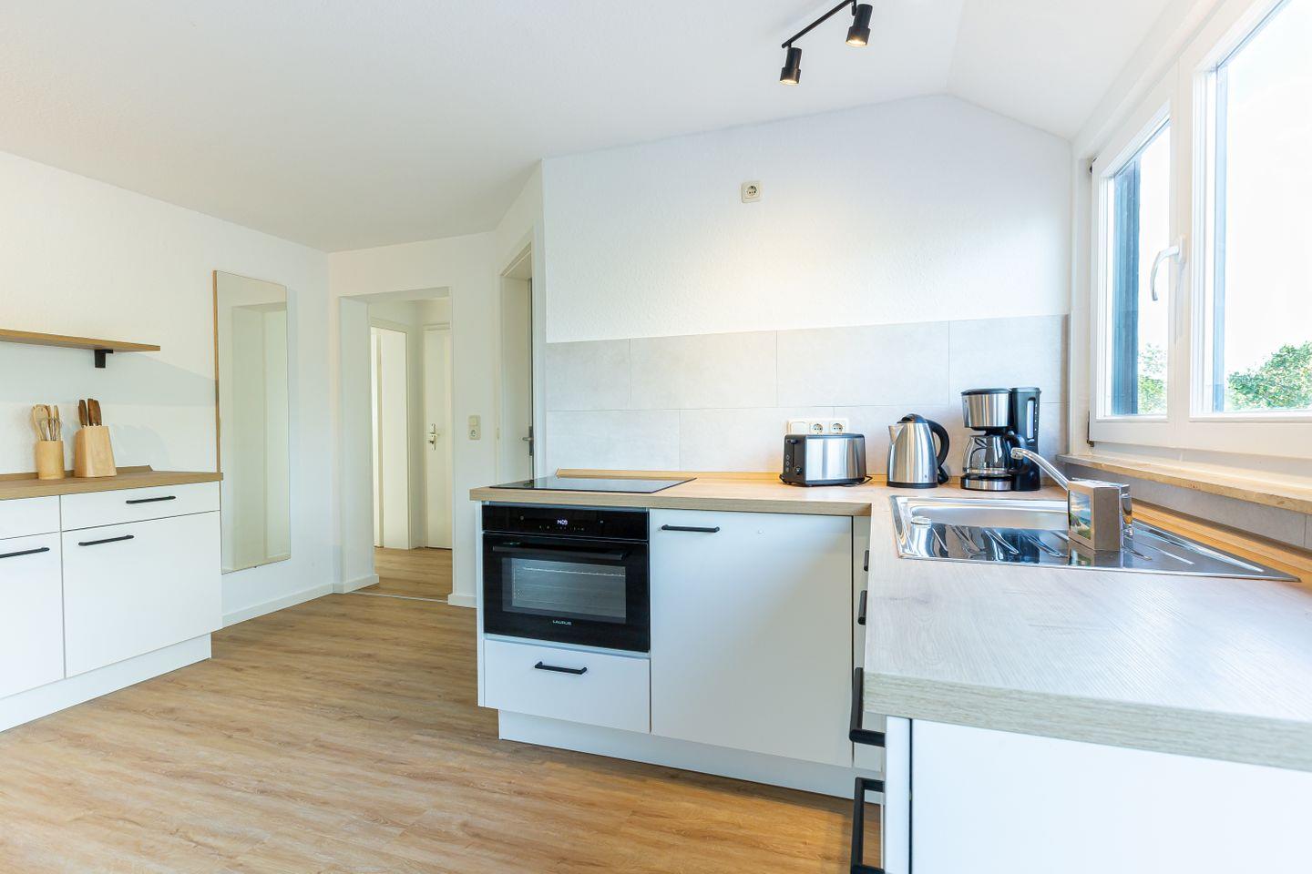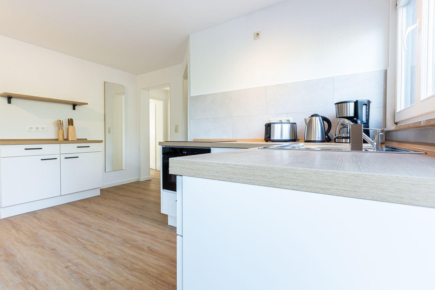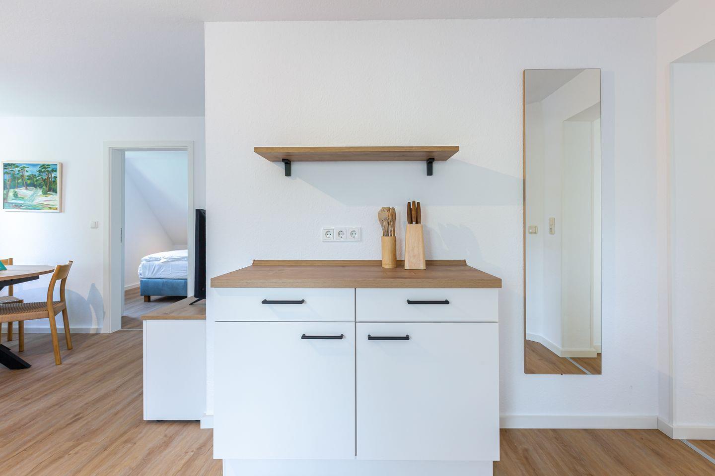 Die neu sanierte Ferienwohnung befindet sich im ersten Stock des Mehrfamilienhauses. Der helle Wohn- und Küchenbereich bildet das Herzstück der Wohnung. Die moderne Küche ist vollständig ausgestattet und lässt keine Wünsche offen – ob für ein gemeinsames Frühstück auf dem Balkon oder ein gemütliches Abendessen nach einem Strandtag. Hochwertige Möbel sorgen dabei für ein elegantes und harmonisches Wohngefühl.