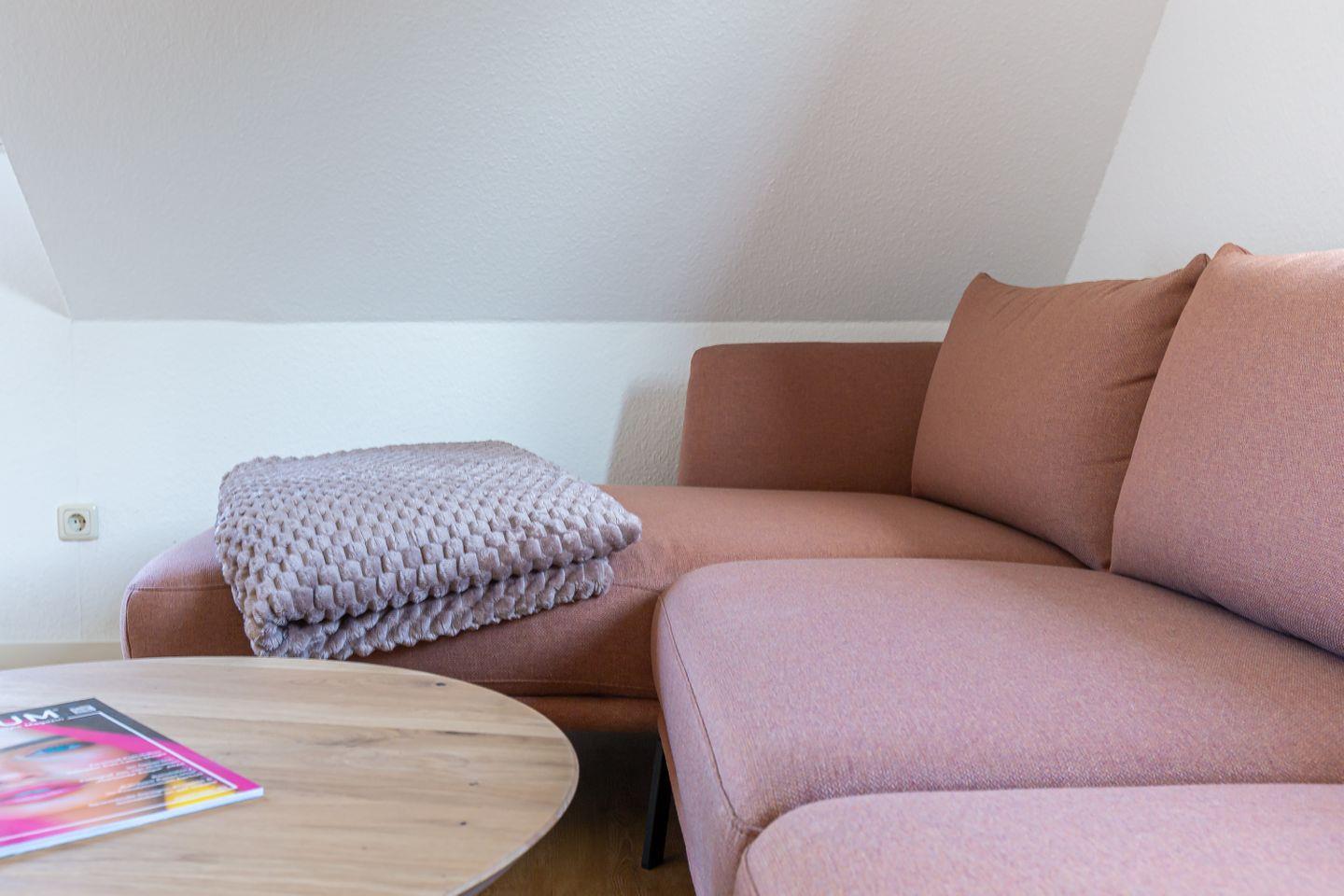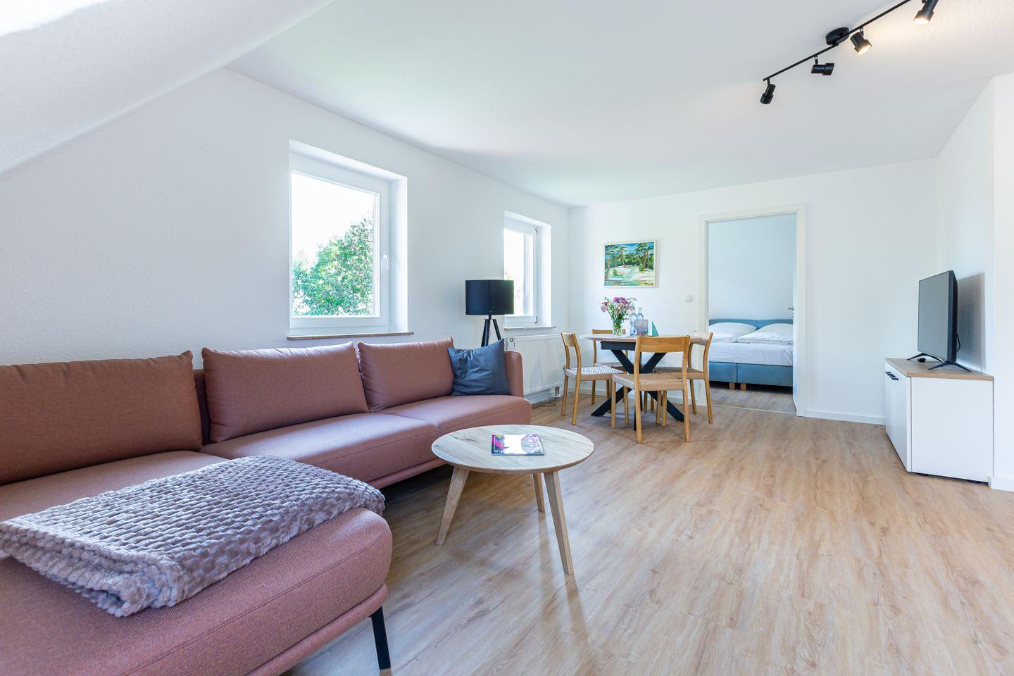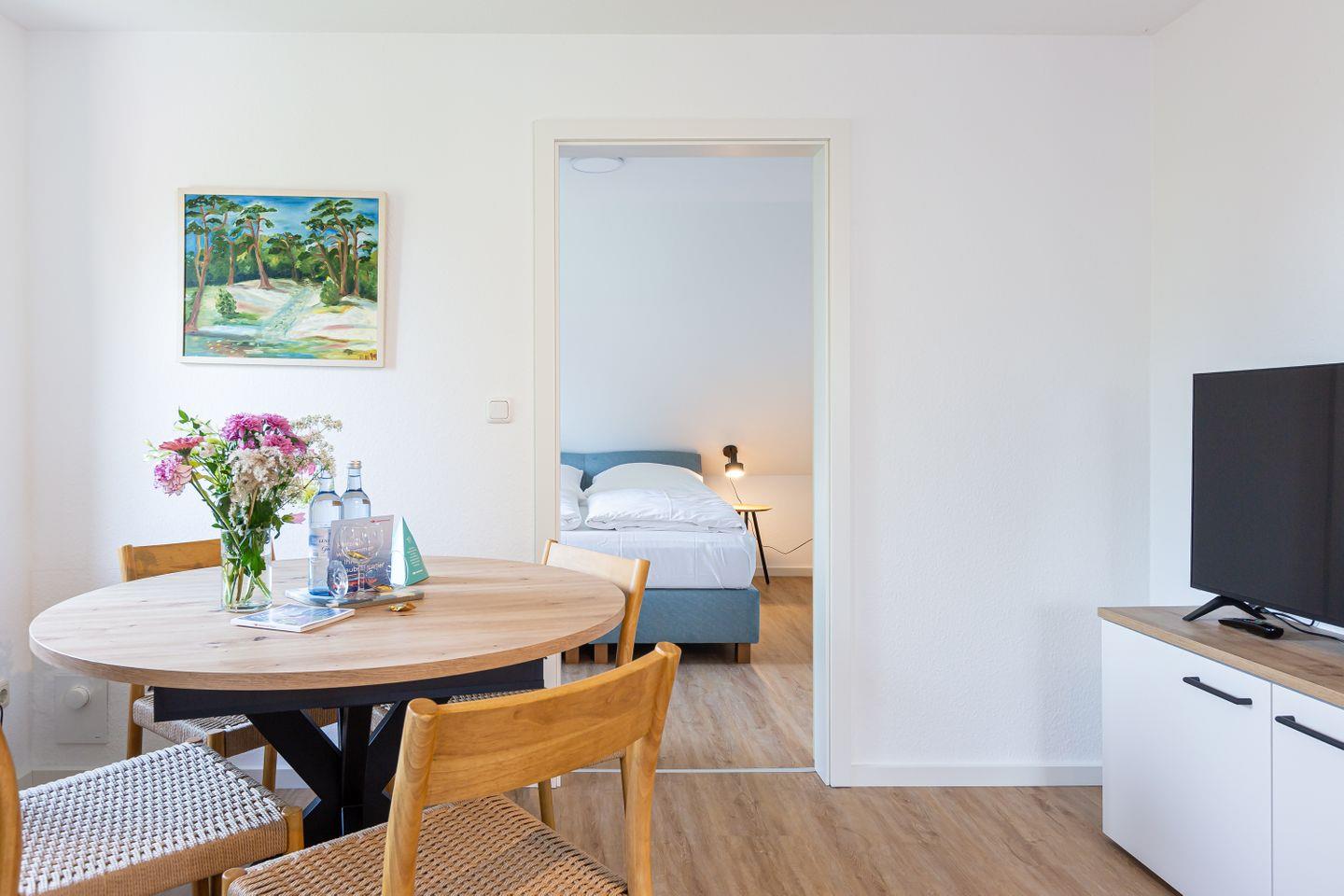 Die neu sanierte Ferienwohnung befindet sich im ersten Stock des Mehrfamilienhauses. Der helle Wohn- und Küchenbereich bildet das Herzstück der Wohnung. Die moderne Küche ist vollständig ausgestattet und lässt keine Wünsche offen – ob für ein gemeinsames Frühstück auf dem Balkon oder ein gemütliches Abendessen nach einem Strandtag. Hochwertige Möbel sorgen dabei für ein elegantes und harmonisches Wohngefühl.