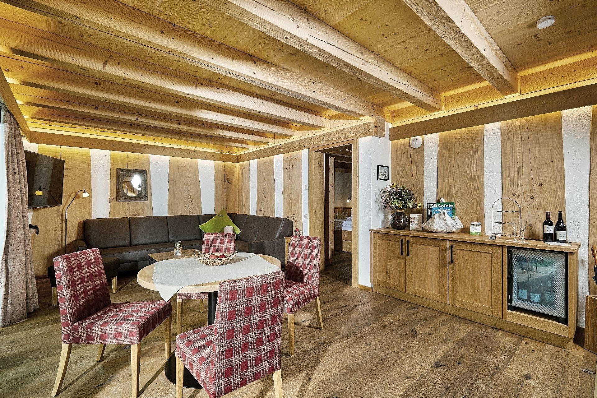 Das Chalet ist ausgestattet mit Wohnraum mit gemütlichem Leder-Sofa, voll ausgestatteter Küche, Zirbenholz-Schlafzimmer, großem Badezimmer mit Sauna und Terrasse oder großem Balkon.