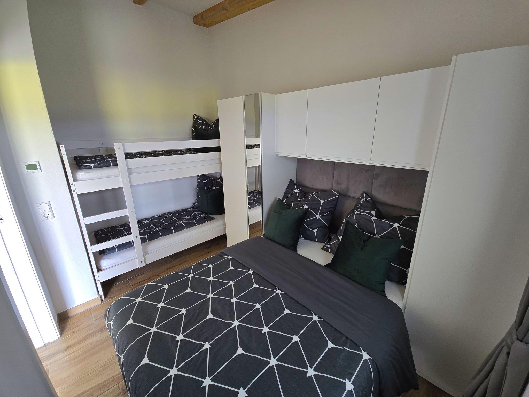 Unsere Ferienwohnung bietet mit 30 qm genug Platz für einen perfekten Urlaub. Im großzügigen Wohn-/ Essbereich finden Sie eine vollausgestattete Küche mit Geschirrspüler, Microwelle, Nespresso Kaffeemaschine, Kühl-/ Gefrierkombi und Induktionskochfeld. Das Schlafzimmer verfügt über ein Doppelbett (Maße: 140x200 cm) und einem Etagenbett (Maße: je 90x200 cm, auch für Erwachsene geeignet bis 100 kg), was einer Belegung von max. 4 Personen entspricht. Eine ebenerdige Dusche, mit WC, großem Waschbecken und Spiegel mit integriertem Kosmetikspiegel runden die Wohnung ab. Im gesamten Wohnraum befinden sich Fliesen als Bodenbelag wieder. Zur kuscheligen Atmosphäre wurden Fußboden- und Wandheizung installiert. Für ein gutes Raumklima, sorgt eine kontrollierte Wohnraumbelüftung und eine Klimaanlage. Internet und der eigens zugewiesene Parkplatz direkt an der Unterkunft ist während Ihres Aufenthaltes kostenfrei für Sie verfügbar. Die angegebenen Preise beinhalten Endreinigung, Bettwäsche, sowie Hand-, Bade- und Geschirrtücher. Auf Anfrage können wir Ihnen gerne ein Baby/Kleinkind Paket, gegen 40 EUR Kaution, anbieten (Beistellbett, Rausfallschutz, Hochstuhl, Trittschemel, Töpfchen, Toilettensitz, Geschirr).