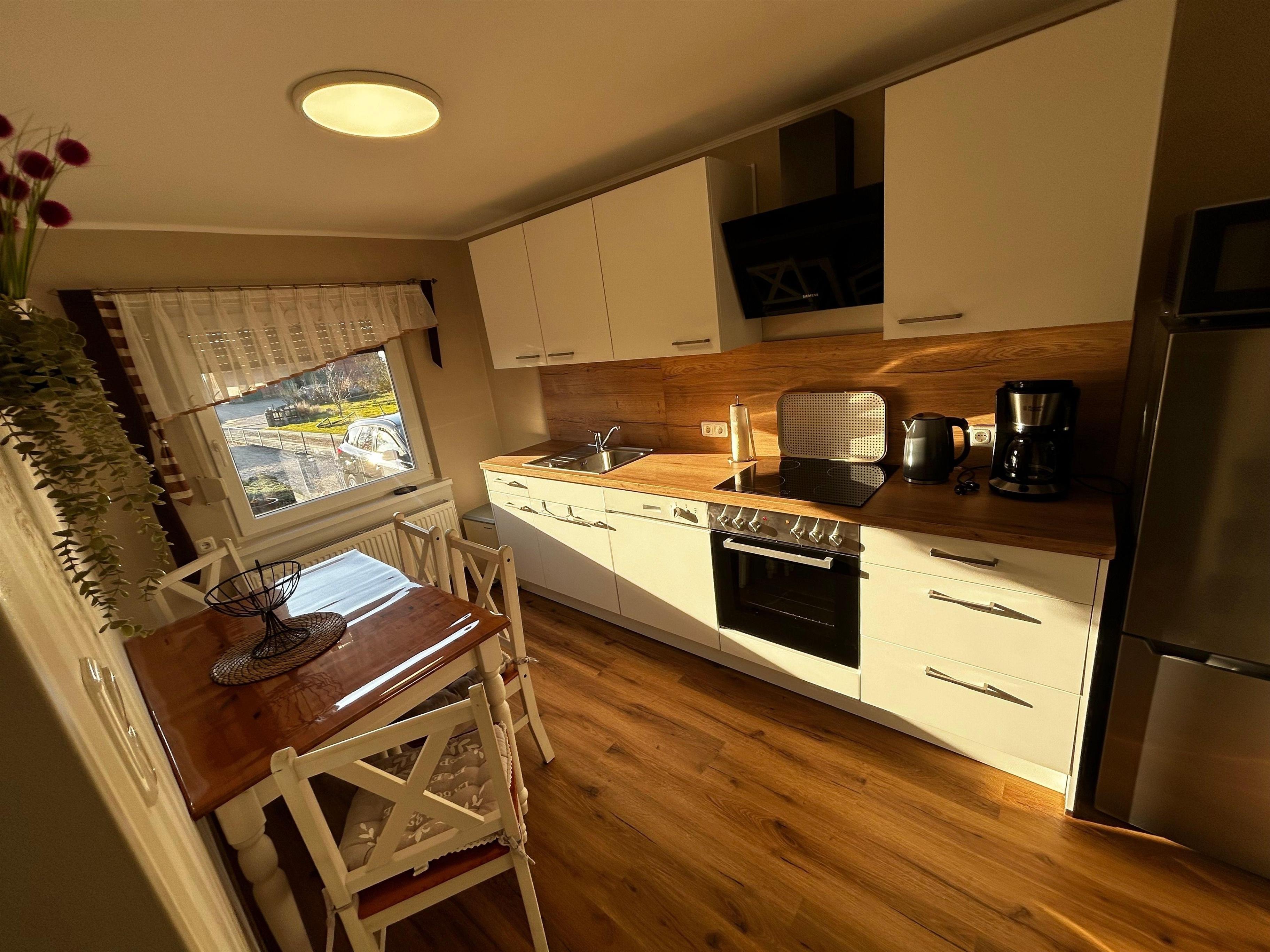 Gemütlich eingerichtetes Ferienhaus mit komfortablen Bad und Einbauküche.