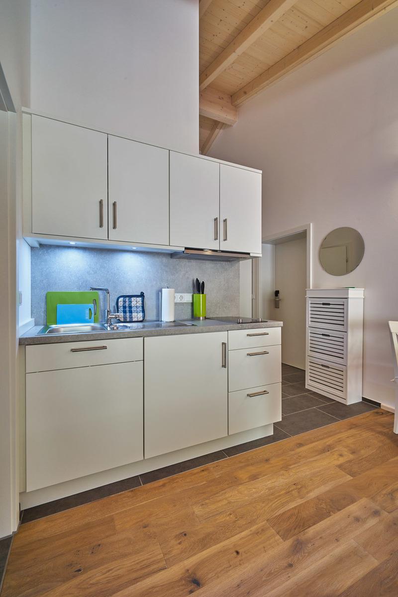 Die klar strukturierte Küchenzeile bietet ein 2-Platten Cerankochfeld, ein Spülbecken, Mikrowelle und Kühlschrank mit Eisfach sowie alle anderen wichtigen Utensilien die in einer Küche nicht fehlen dürfen.