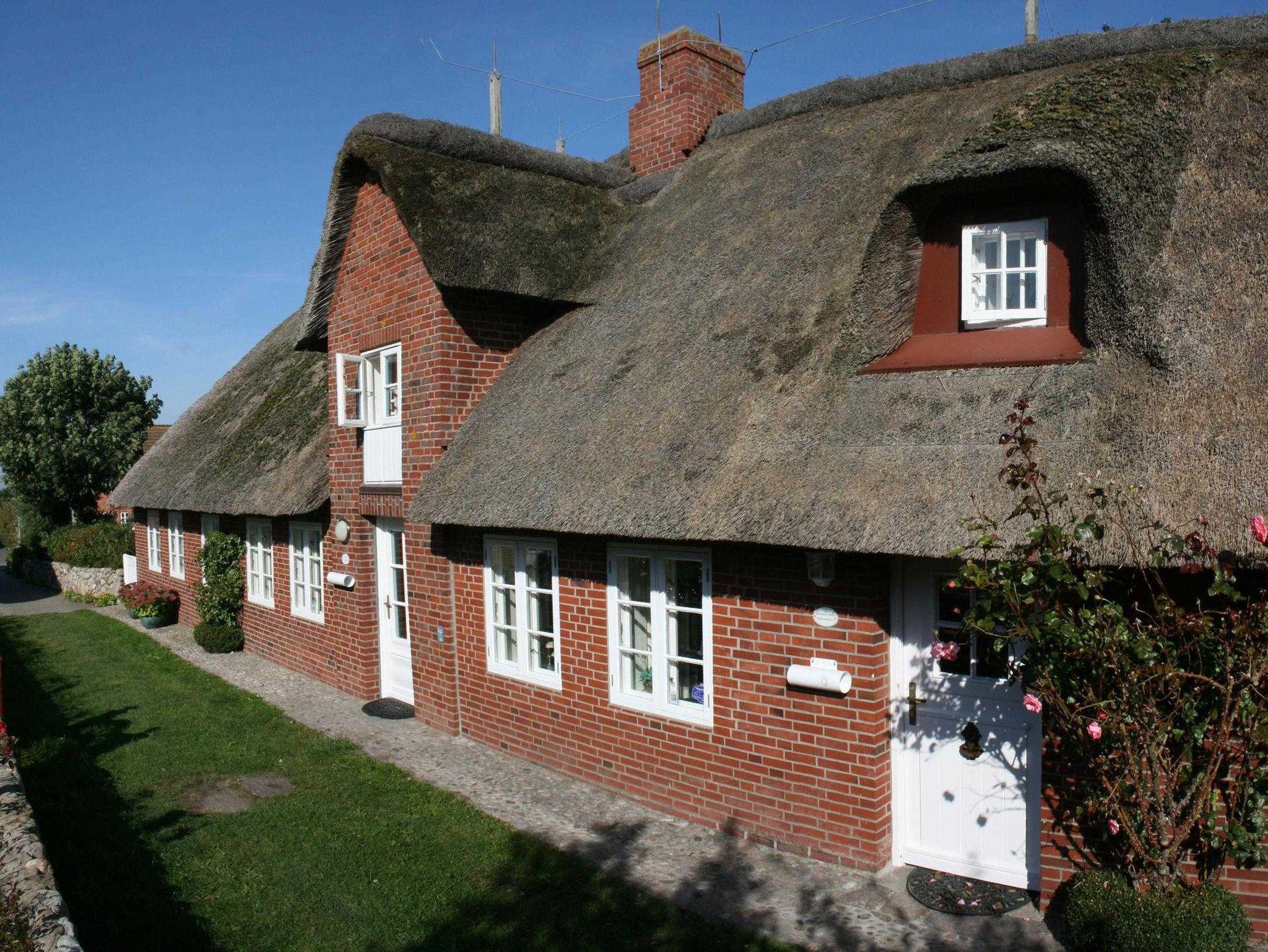 Traditionelles reetgedecktes Friesenhaus in Alkersum, idyllisch gelegen mit Garten, Terrasse und moderner Ausstattung für entspannte Ferien.