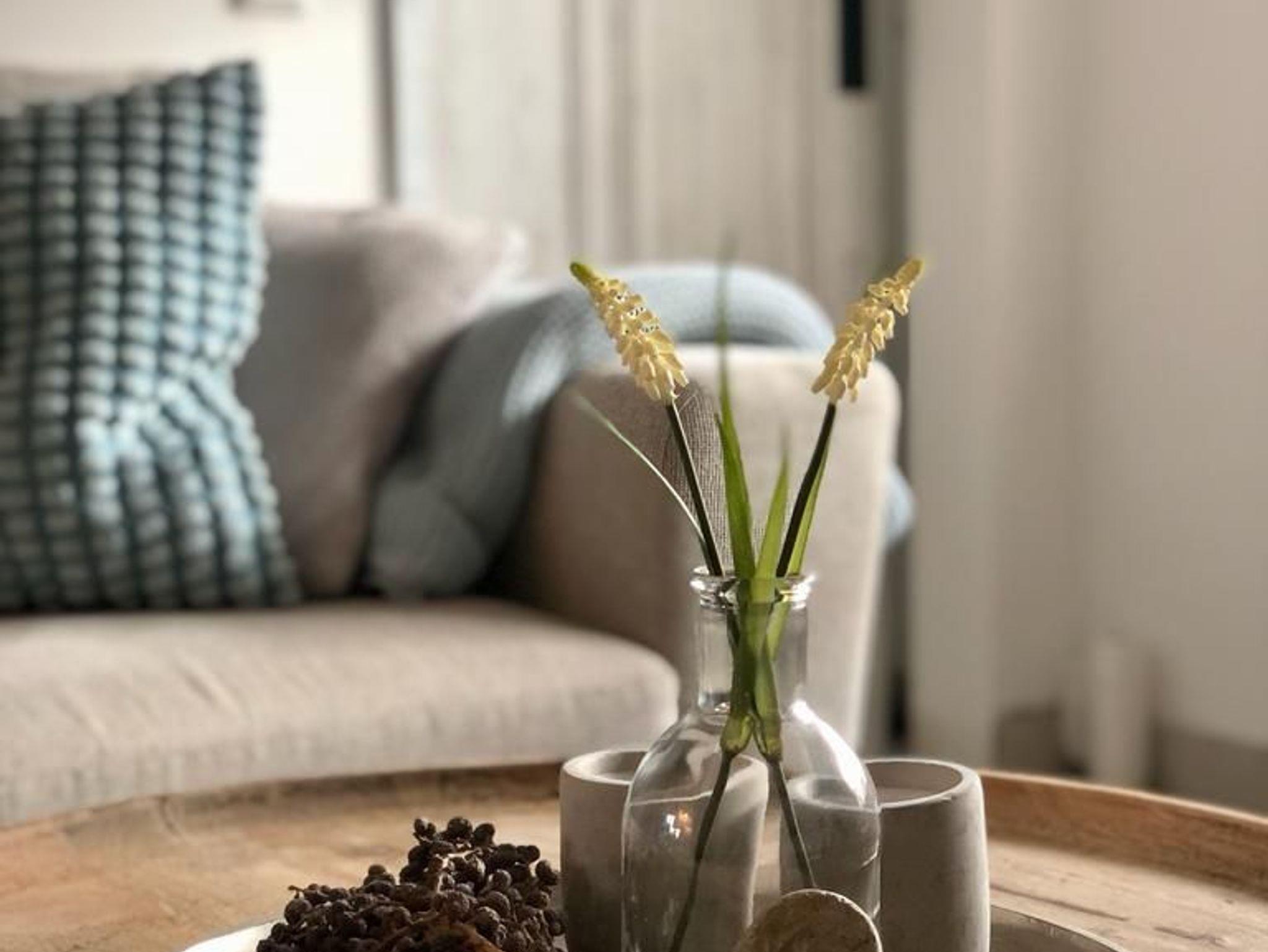 Raumaufteilung: 1 Schlafraum (1 Doppelbett), 1 Wohnraum (1 Couchliege), 1 Wohn-/Esszimmer mit offener Küche, 2 Dielen/Vorräume, 1 Badezimmer mit Dusche.