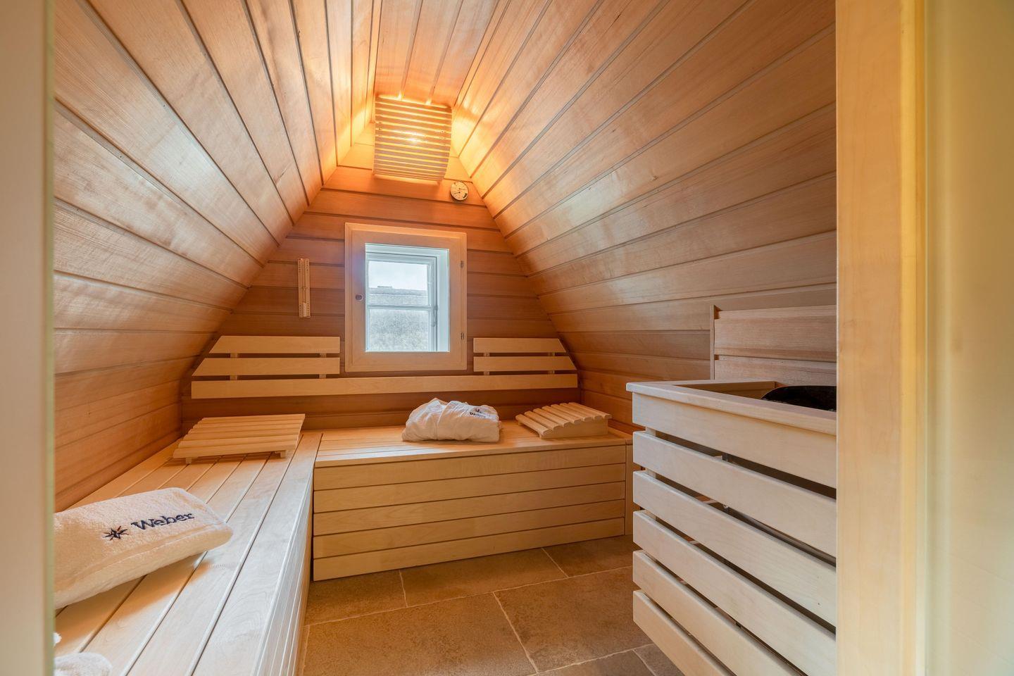 Im Dachgeschoss befindet sich die hauseigene Sauna samt Ruheraum. Hier finden alternativ auch Ihre Kinder Platz zum Spielen und Verweilen. Zur körperlichen Ertüchtigung stehen Ihnen zudem eine Gymnastikmatte und Hanteln zur Verfügung.