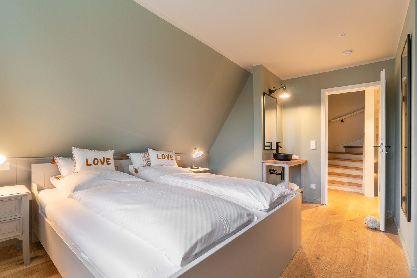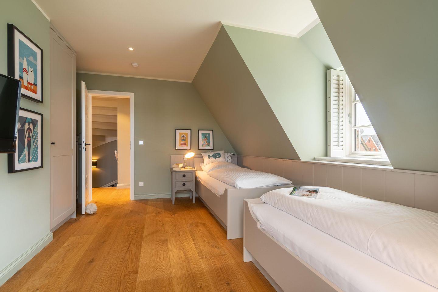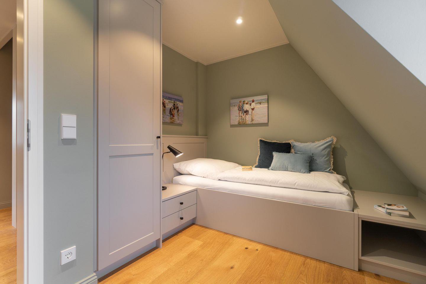 Im Obergeschoss befinden sich drei Schlafzimmer - eines mit einem Doppelbett, eines mit zwei Einzelbetten, welche auch zum Doppelbett zusammengestellt werden können und das dritte Schlafzimmer mit einem Einzelbett - sowie das Vollbad. Alle Betten, Kleiderschränke und viele weitere Möbel des Ferienhauses sind individuell Einbauten eines Föhrer Tischlers.