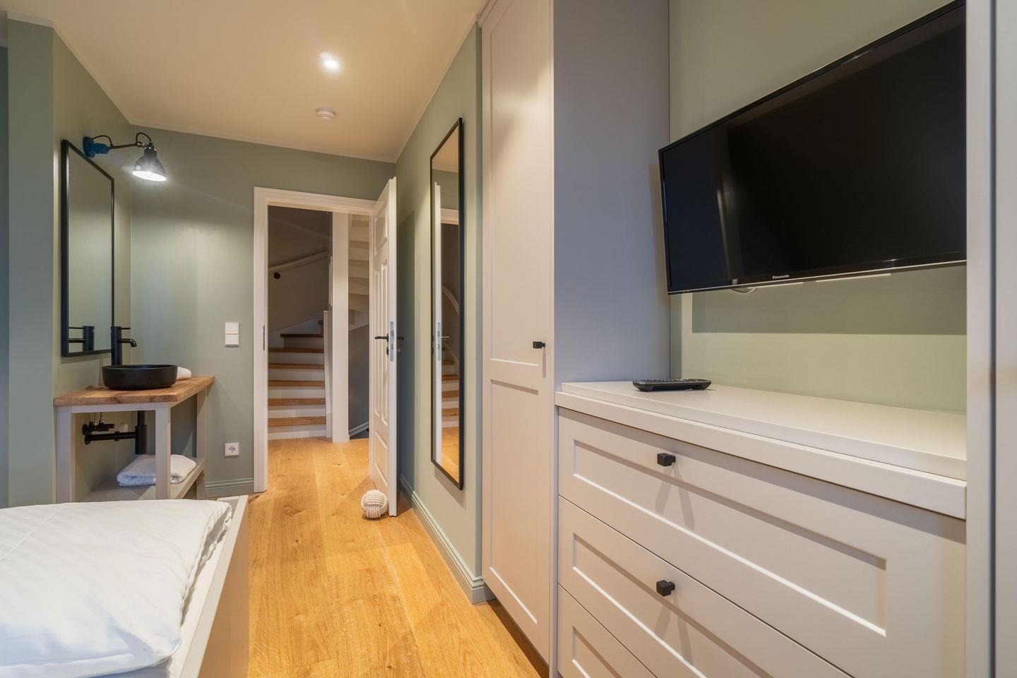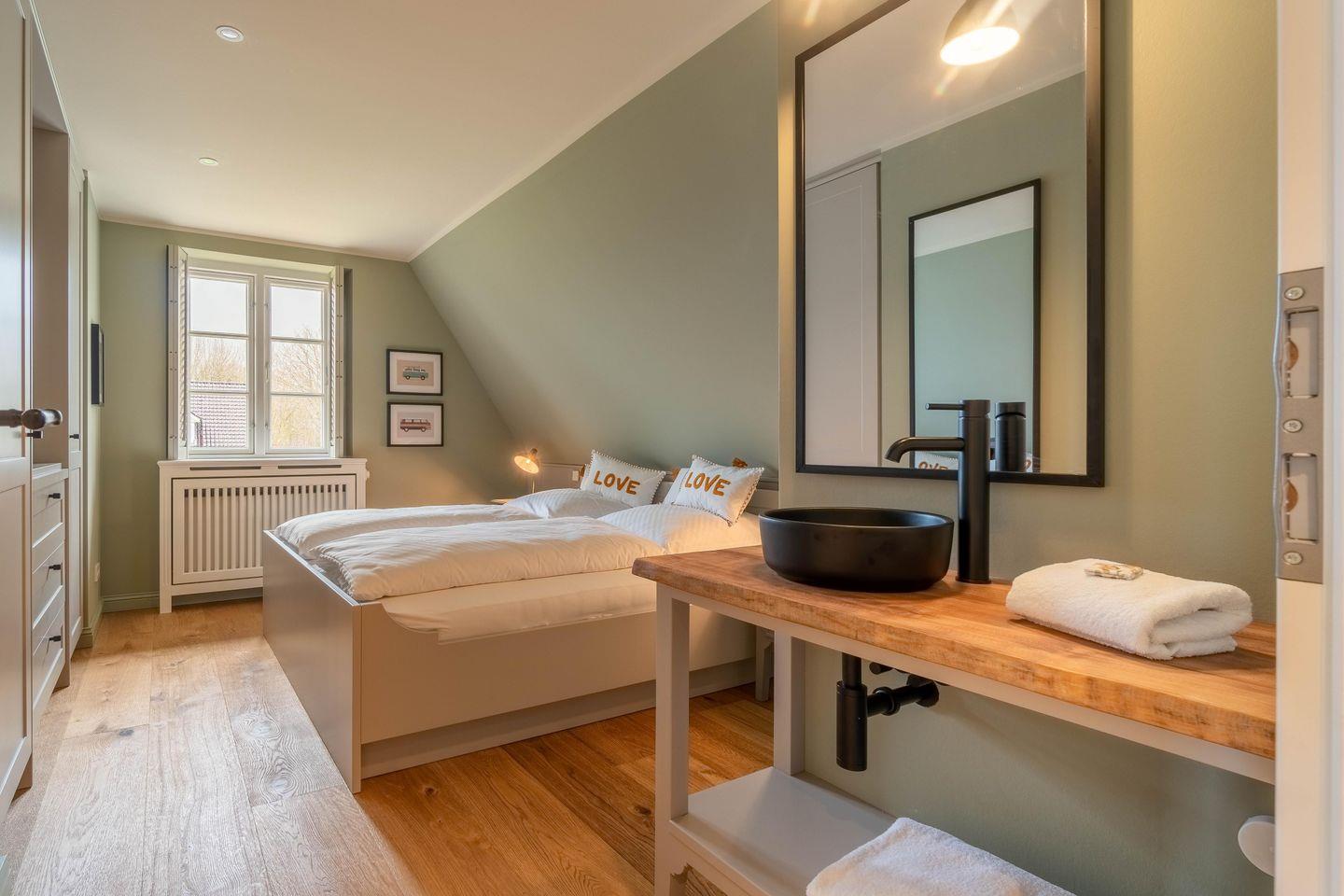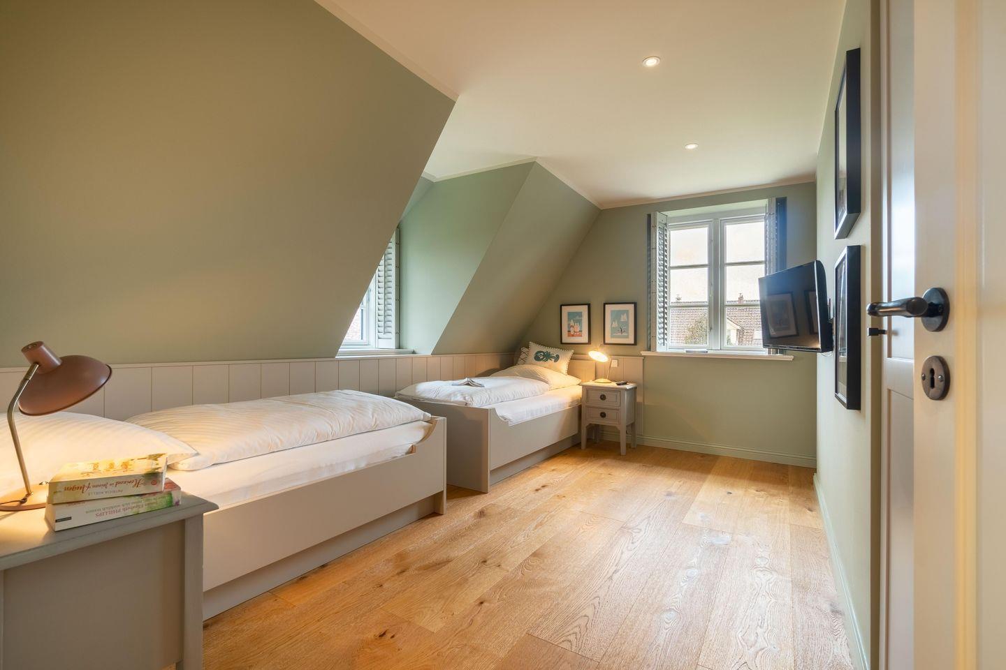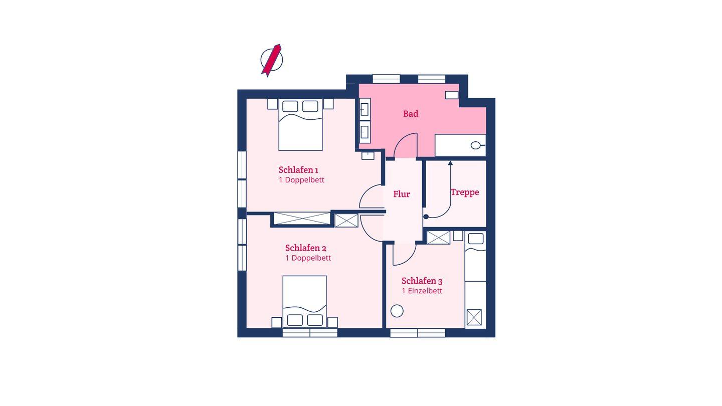 Im Obergeschoss befinden sich drei Schlafzimmer - eines mit einem Doppelbett, eines mit zwei Einzelbetten, welche auch zum Doppelbett zusammengestellt werden können und das dritte Schlafzimmer mit einem Einzelbett - sowie das Vollbad. Alle Betten, Kleiderschränke und viele weitere Möbel des Ferienhauses sind individuell Einbauten eines Föhrer Tischlers.