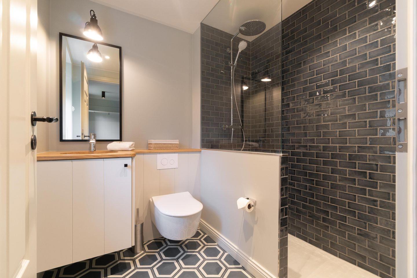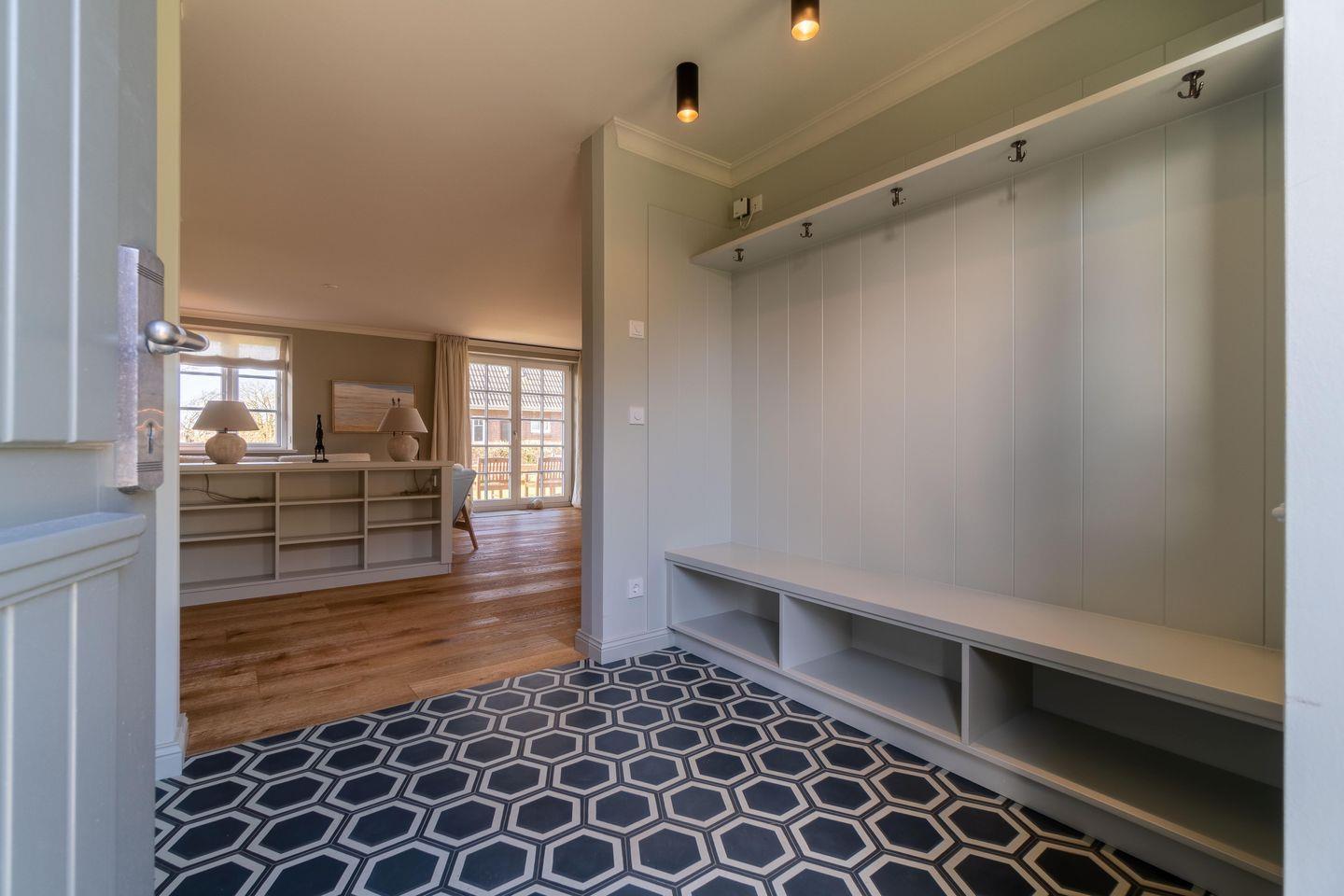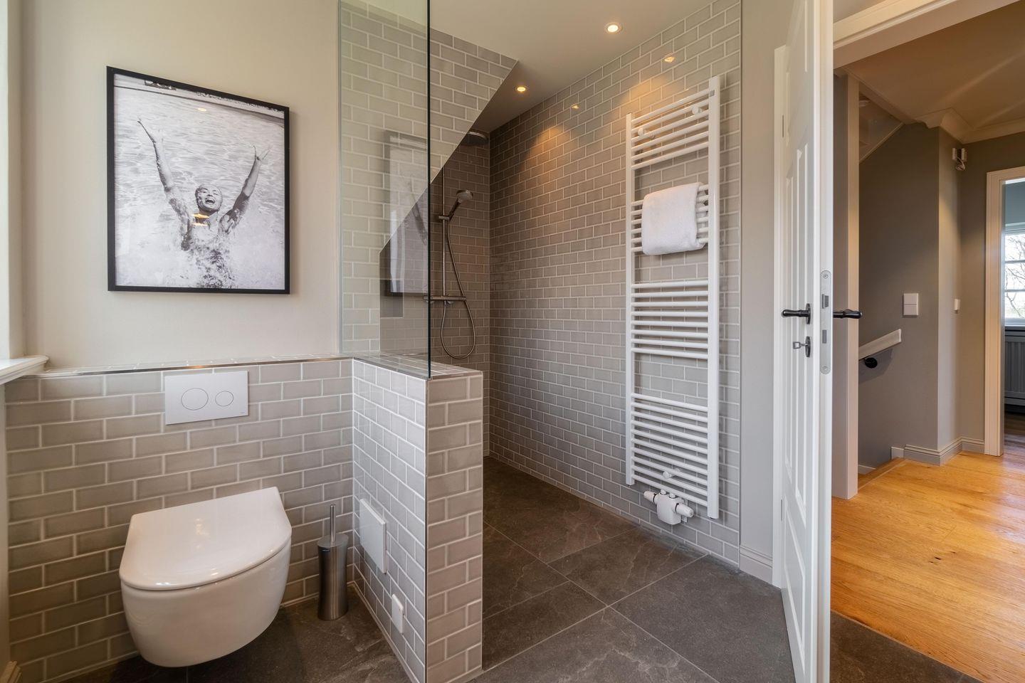 Beim Betreten des Hauses werden Sie in der offenen Diele empfangen. Die handgefertigte Garderobe bietet ausreichend Platz für Jacken und Schuhe Ein vollwertiges Duschbad befindet sich gegenüber der Garderobe, gleich links vom Eingang.