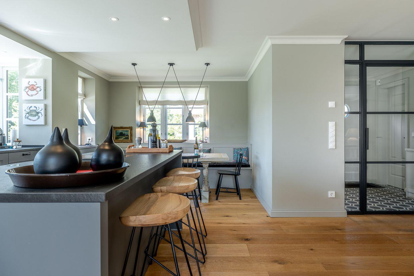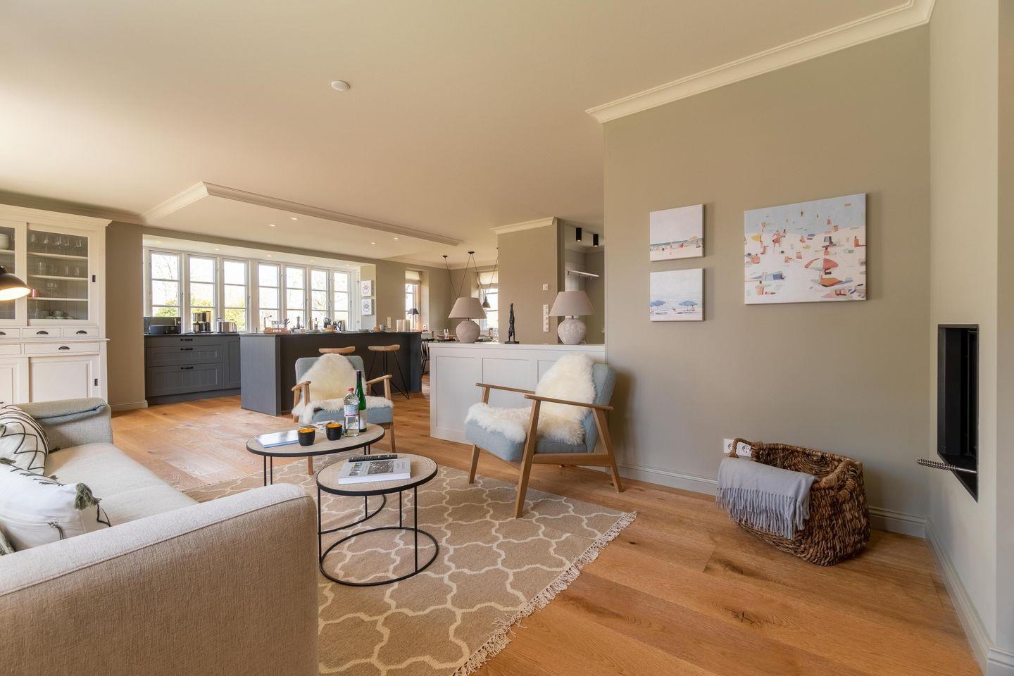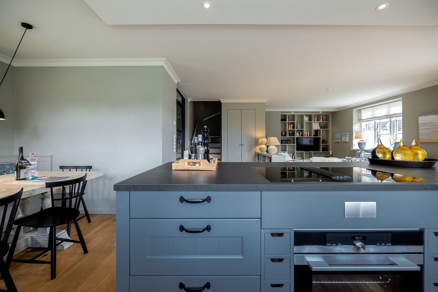 Im Zentrum des hellen Erdgeschosses steht die hochwertige, offene Küche. Umfangreich ausgestattet mit großen Induktionsfeld, zweitem Kühlschrank und nützlichem Zubehör sind alle Voraussetzungen für gesellige Abendessen im anspruchsvoll eingerichteten Essbereich geschaffen. Gleiches gilt für den Wohnbereich, der mit knisterndem Kaminfeuer und gemütlichen Sofa zu einem entspannten Ausklang des Tages einlädt.