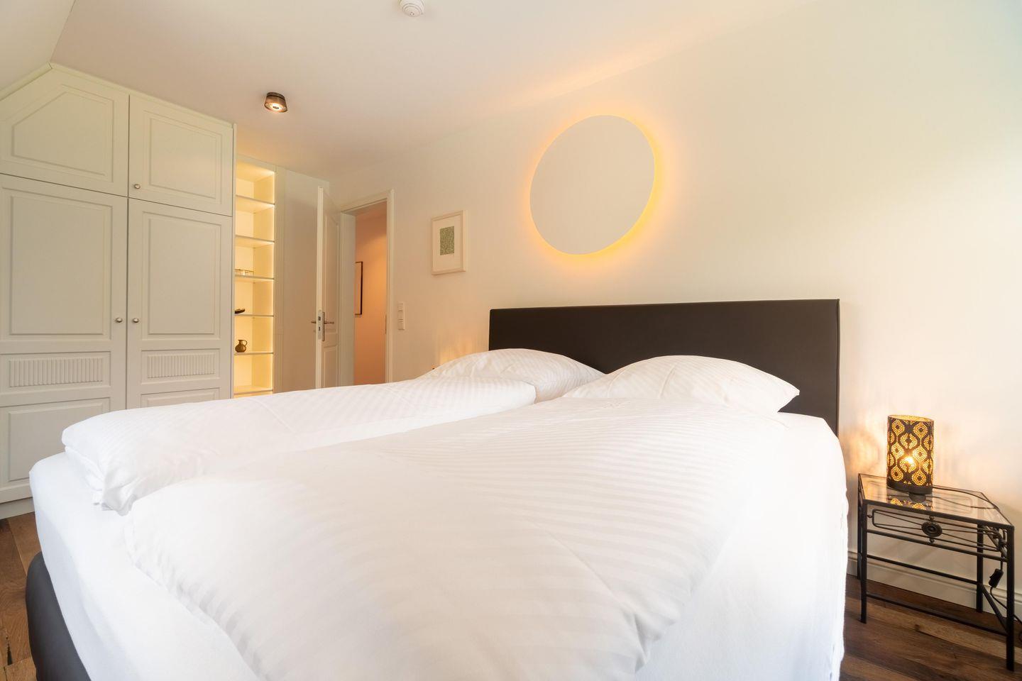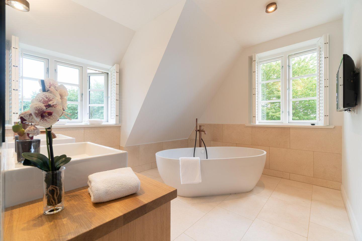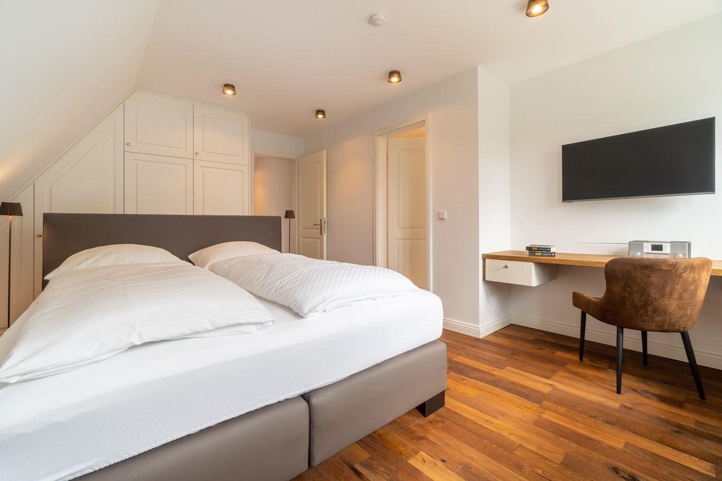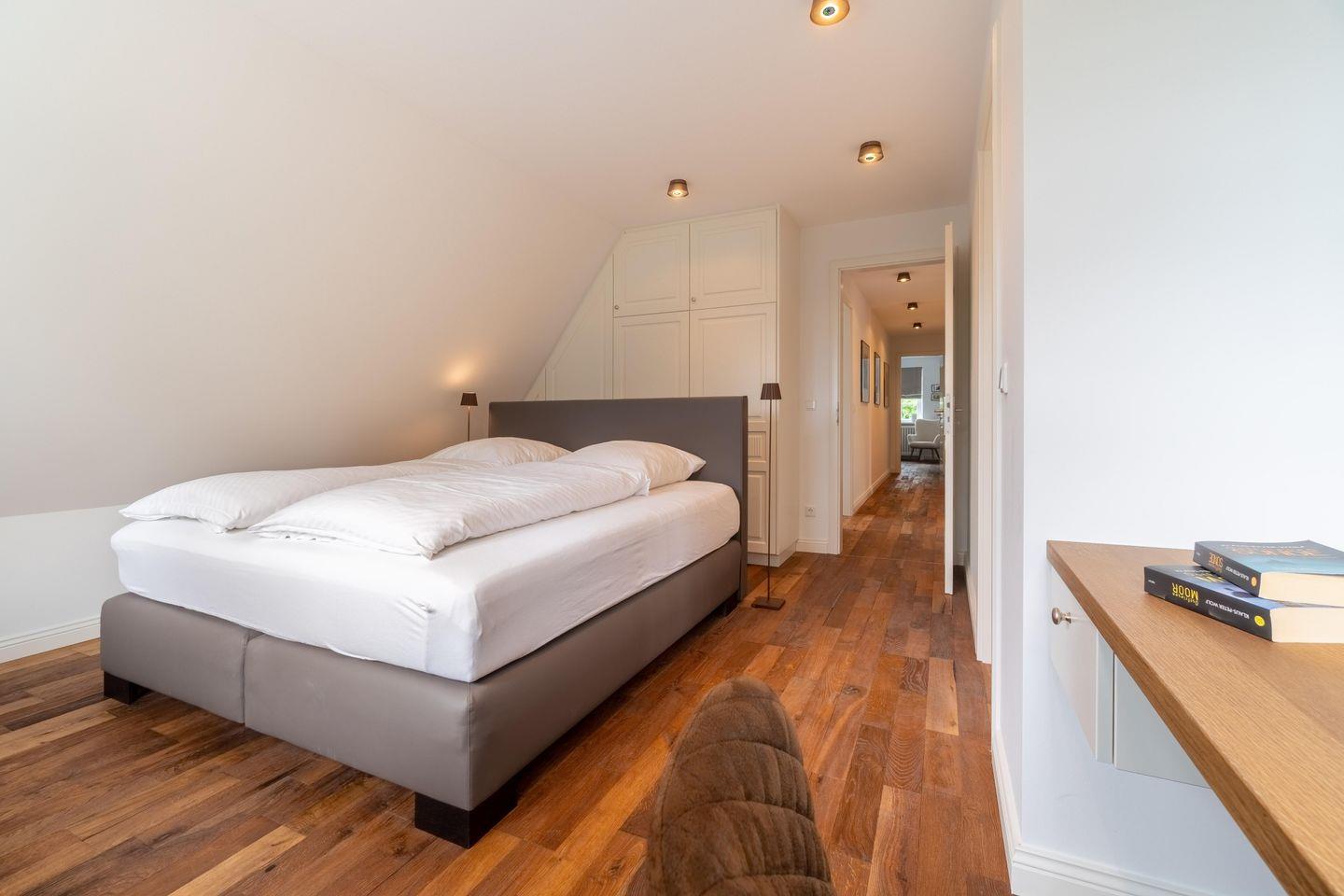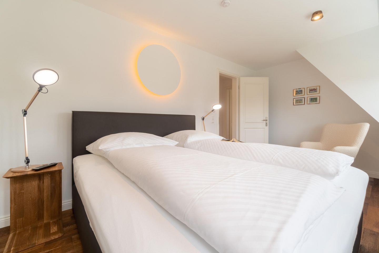 Im Obergeschoss finden Sie vier Schlafzimmer und zwei Vollbäder mit Walk-in Dusche, davon eines en Suite mit freistehender Badewanne und Smart-TV. Alle Schlafzimmer sind mit je einem Boxspringbett (180 x 200 cm) und einem eigenen Smart-TV sowie einem Internetradio oder alternativ mit einem Bluetooth-Lautsprecher der Marke Block ausgestattet.