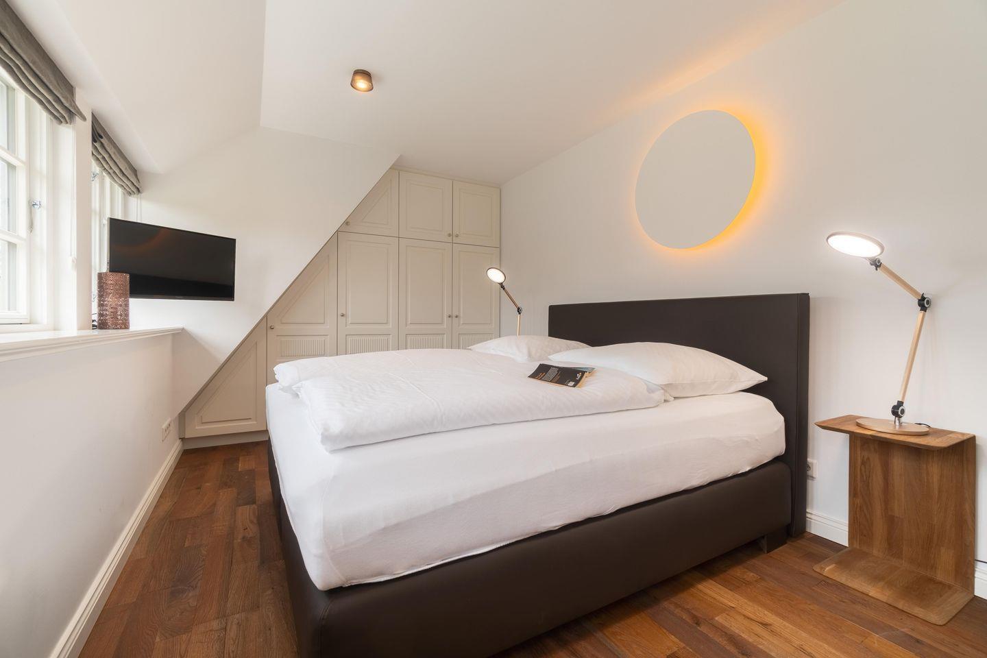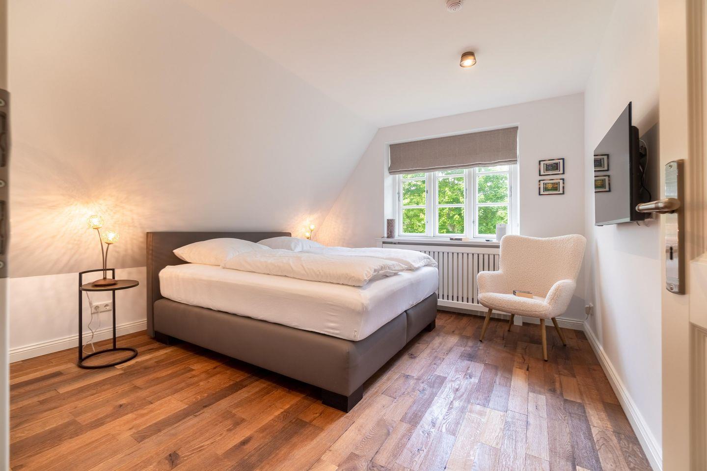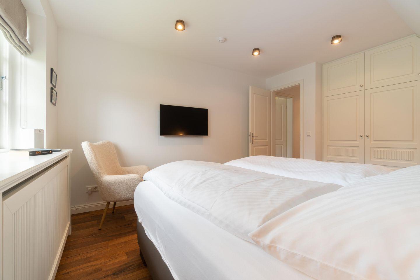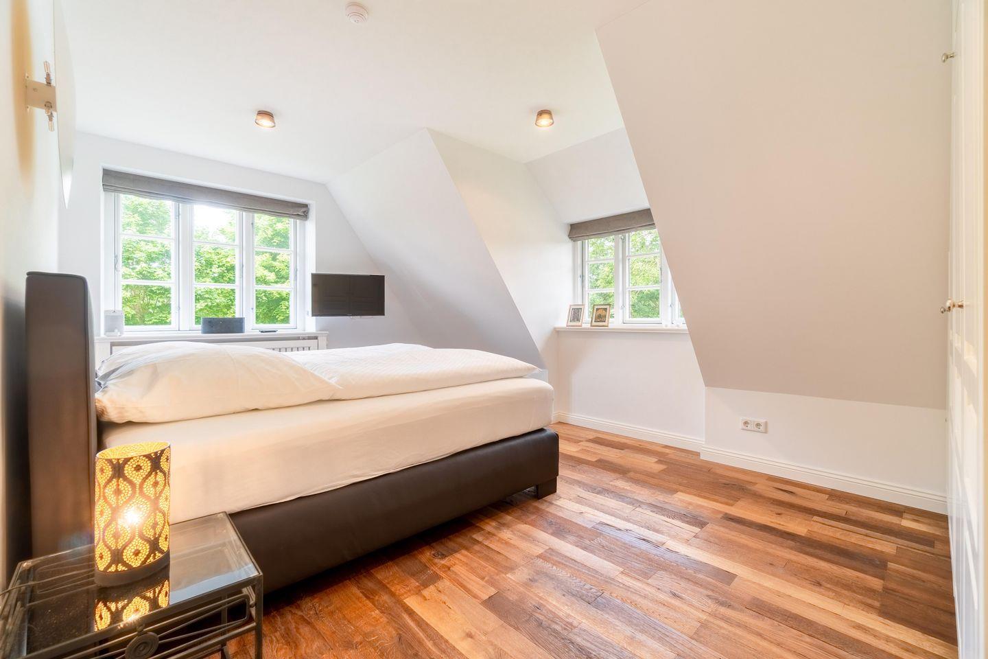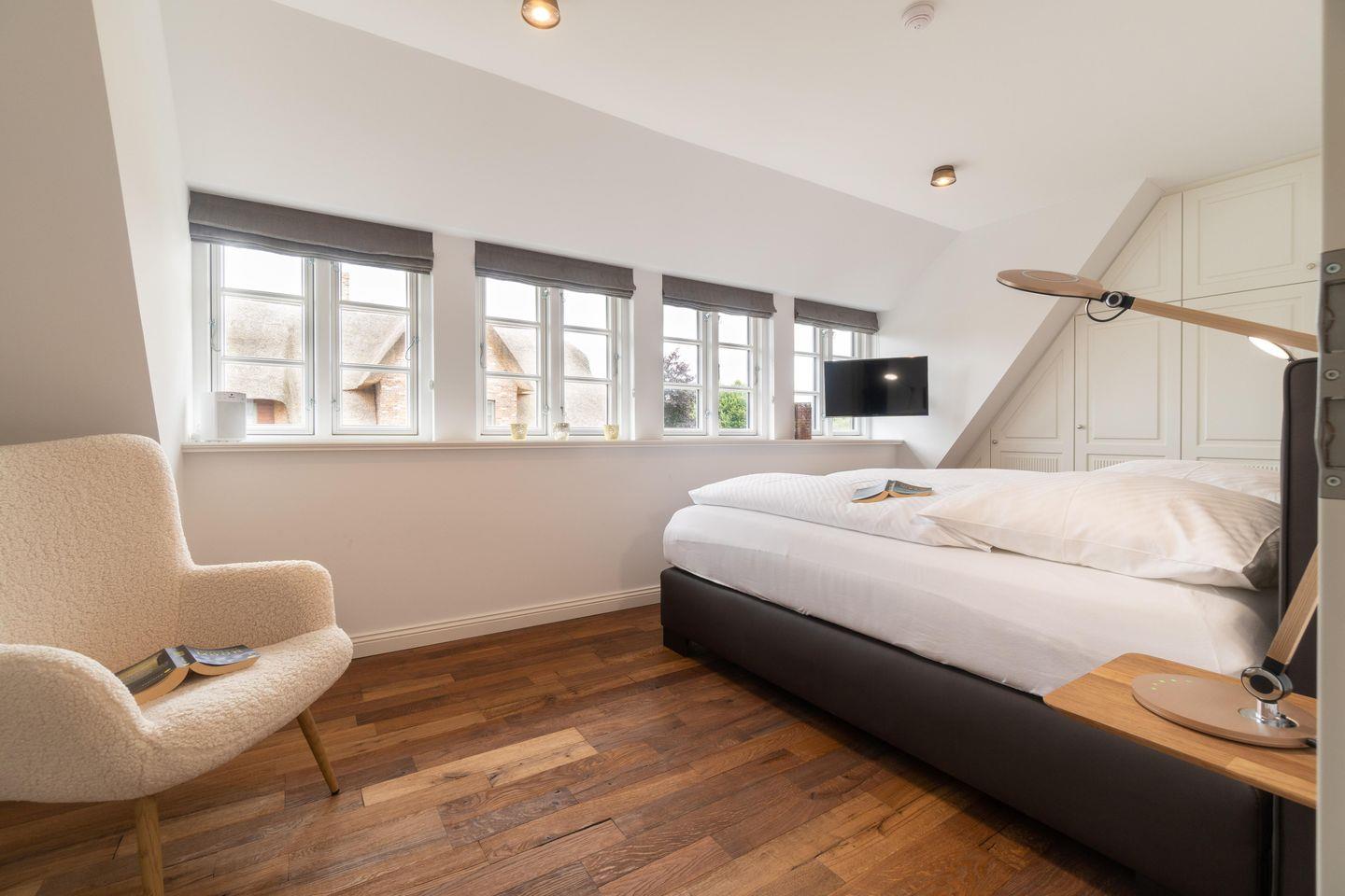 Im Obergeschoss finden Sie vier Schlafzimmer und zwei Vollbäder mit Walk-in Dusche, davon eines en Suite mit freistehender Badewanne und Smart-TV. Alle Schlafzimmer sind mit je einem Boxspringbett (180 x 200 cm) und einem eigenen Smart-TV sowie einem Internetradio oder alternativ mit einem Bluetooth-Lautsprecher der Marke Block ausgestattet.