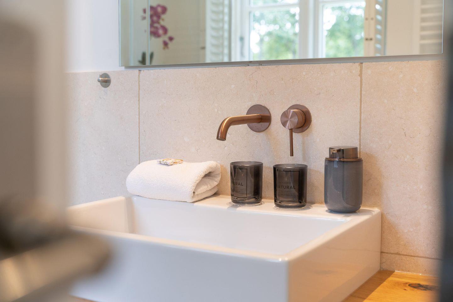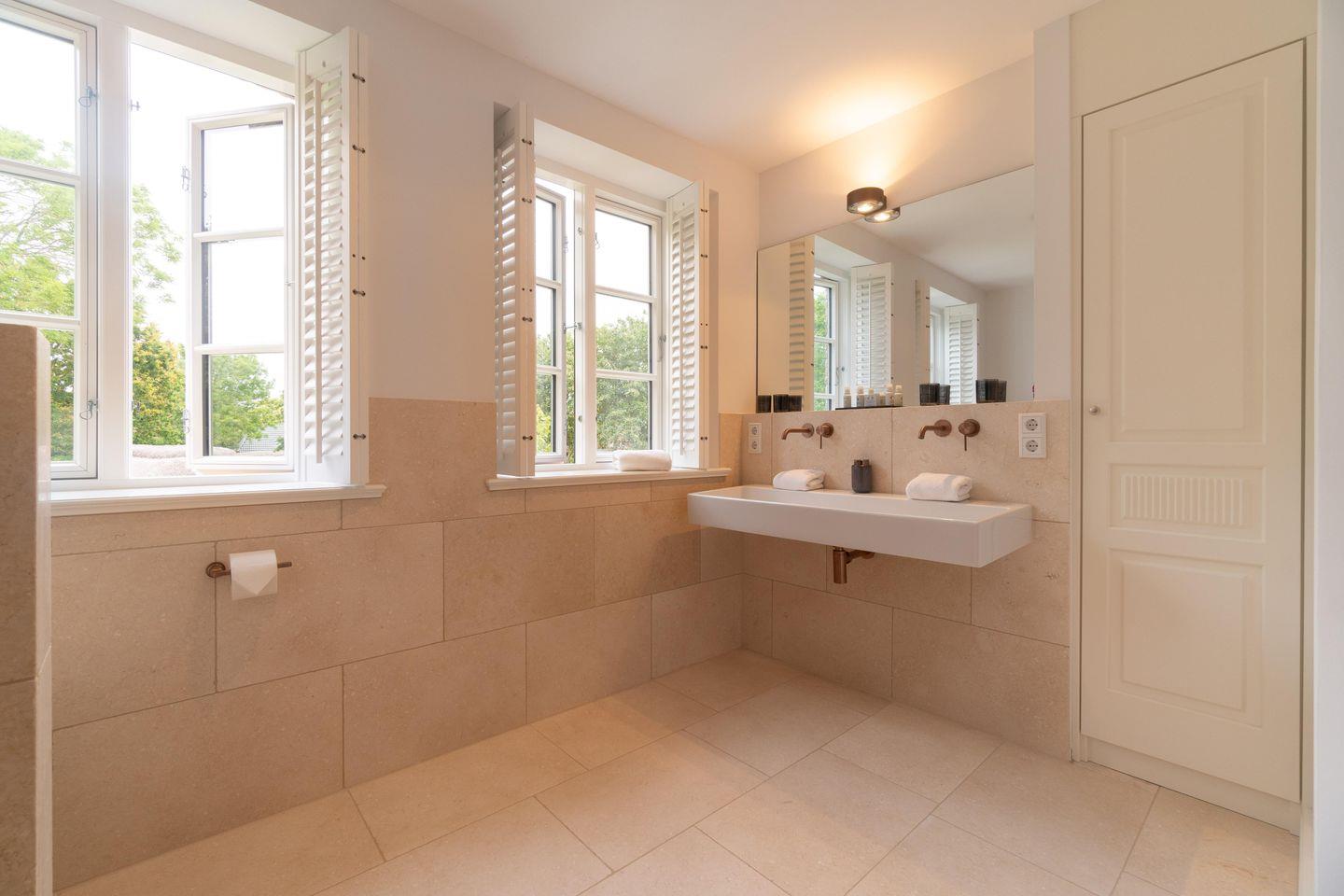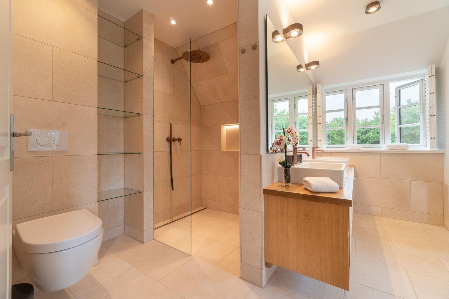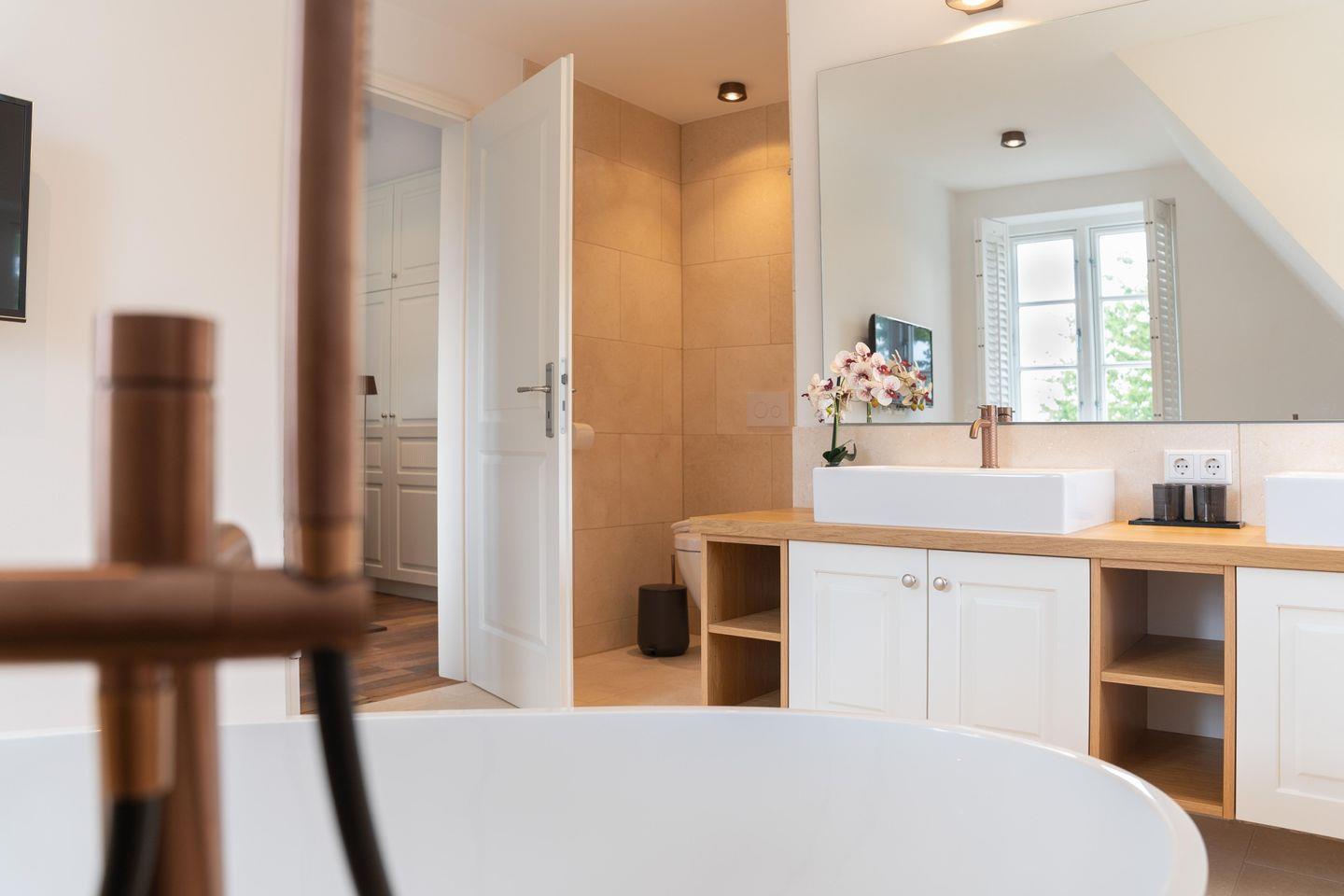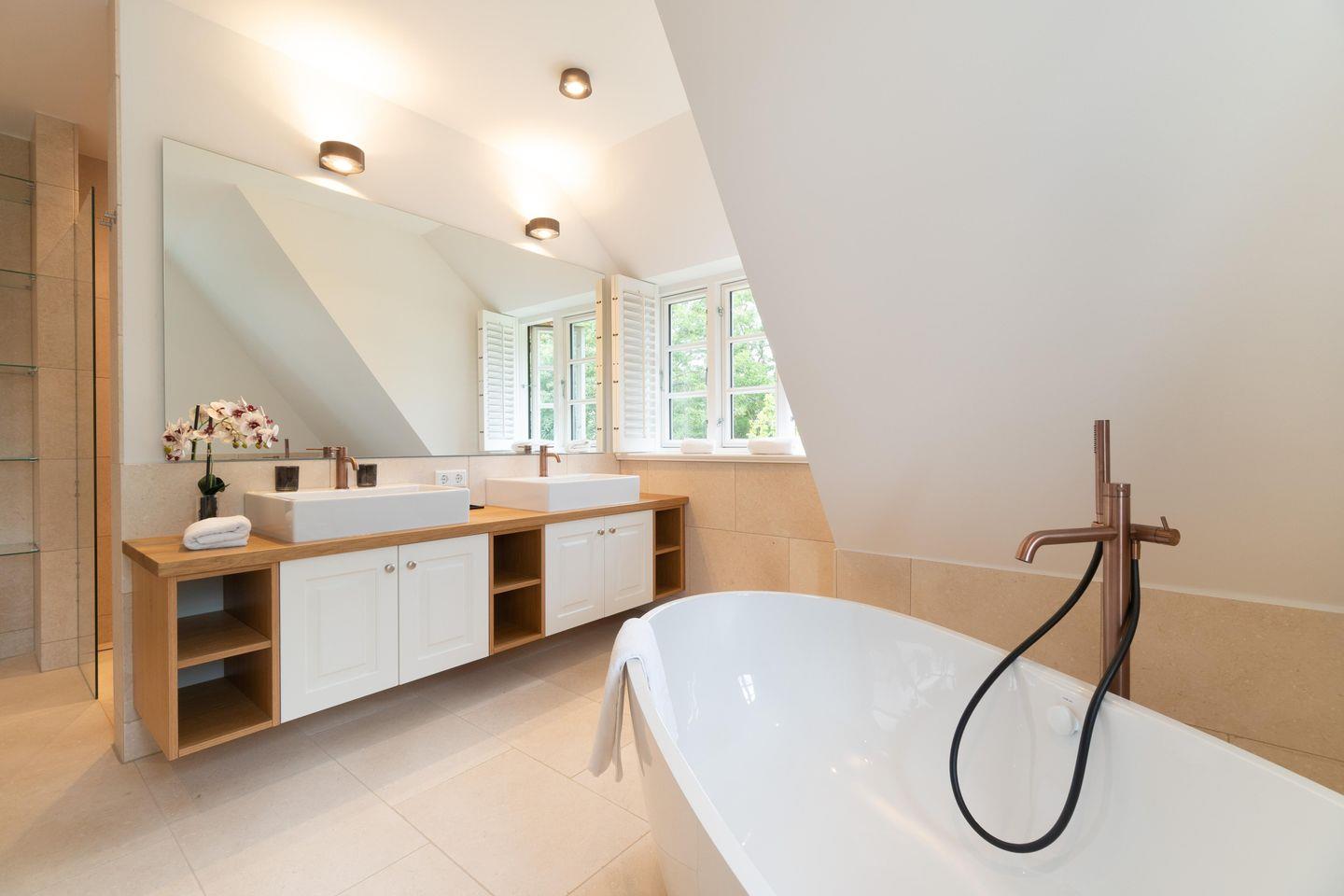 Im Obergeschoss finden Sie vier Schlafzimmer und zwei Vollbäder mit Walk-in Dusche, davon eines en Suite mit freistehender Badewanne und Smart-TV. Alle Schlafzimmer sind mit je einem Boxspringbett (180 x 200 cm) und einem eigenen Smart-TV sowie einem Internetradio oder alternativ mit einem Bluetooth-Lautsprecher der Marke Block ausgestattet.