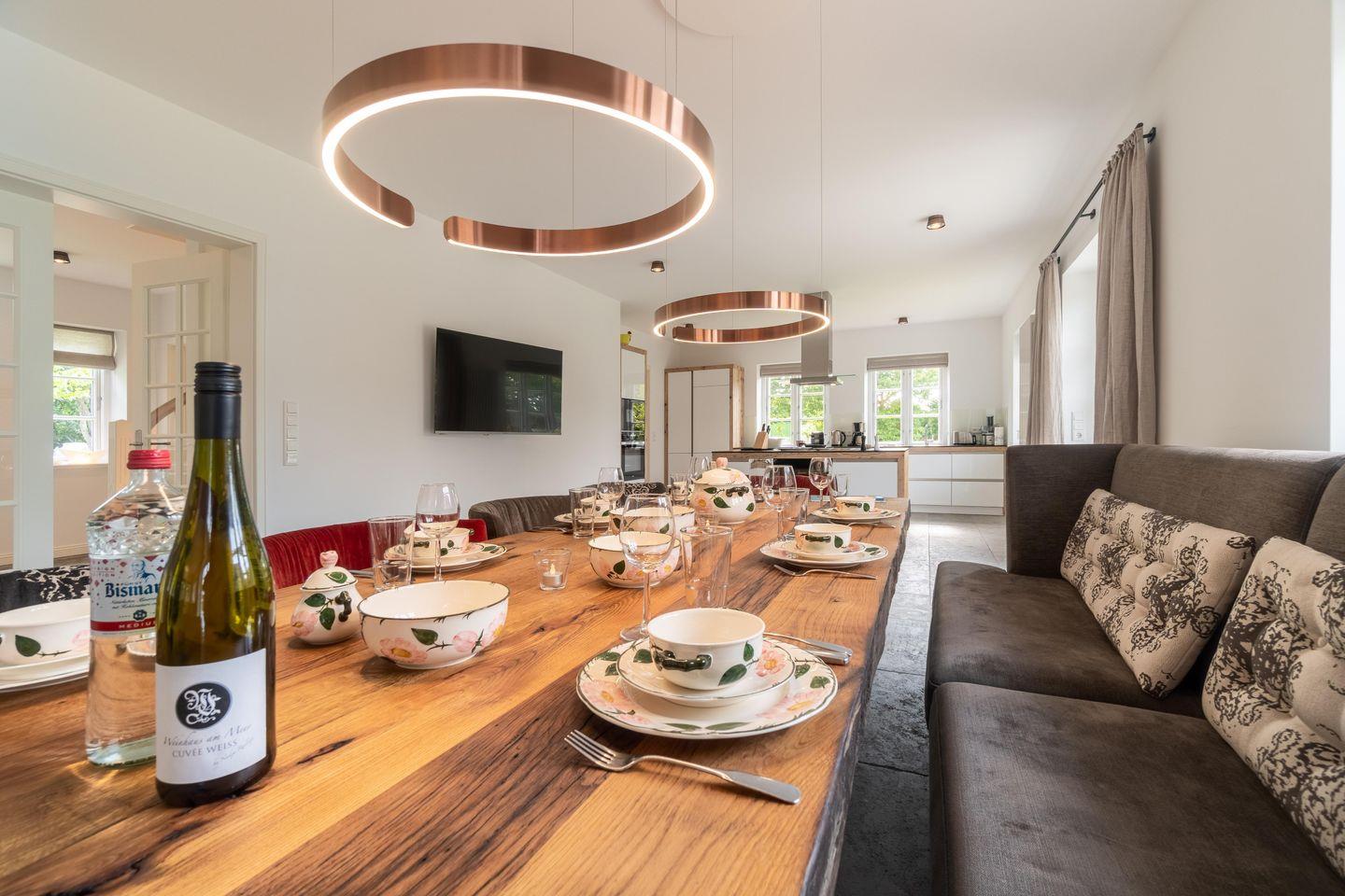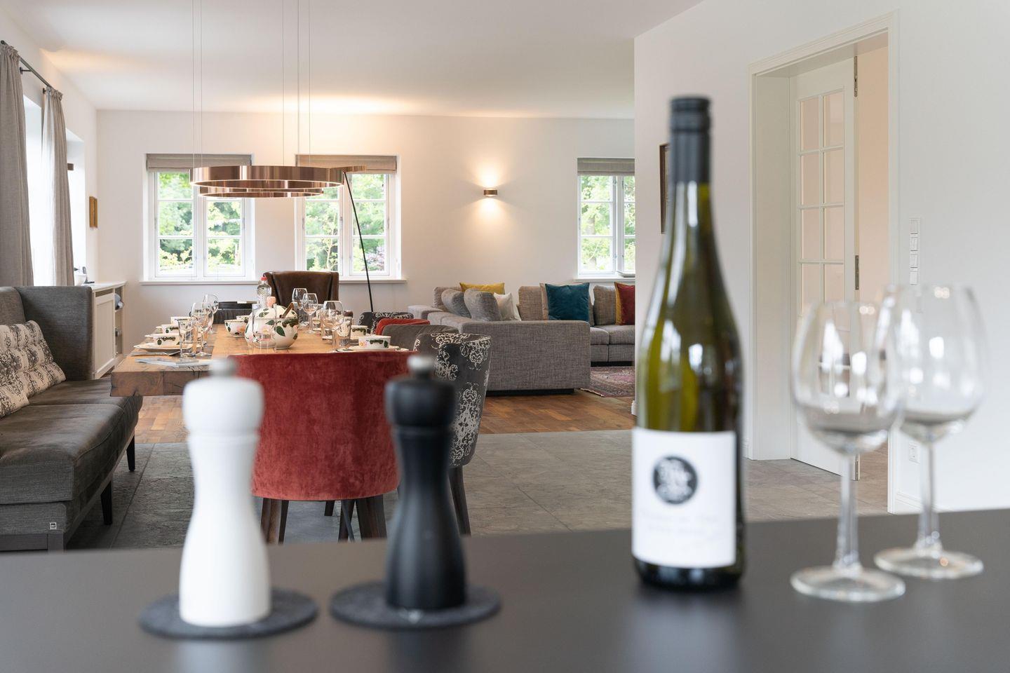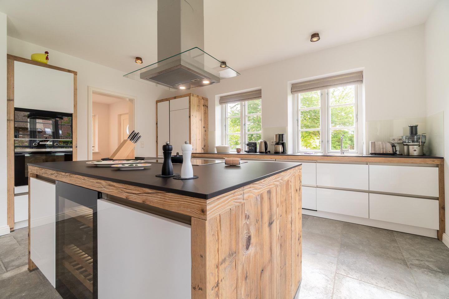 Im Erdgeschoss bietet das Haus eine große Diele mit Tunnelkamin, einen großzügigen Wohn- und Essbereich mit offener Küche, ein Duschbad sowie ein Hauswirtschaftsraum mit Waschmaschine und Trockner. Über den Wohn- und Essbereich gelangen Sie auf die im Süden des Hauses gelegene Terrasse und in den eigenen Garten. Der Tunnelkamin ist gleichermaßen vom Eingangsbereich und vom Wohnbereich einsehbar und spendet an kühleren Tagen eine angenehme Wärme. Die Küche verfügt über eine Kochinsel, einen separaten Weinkühlschrank und ist sehr gut ausgestattet.