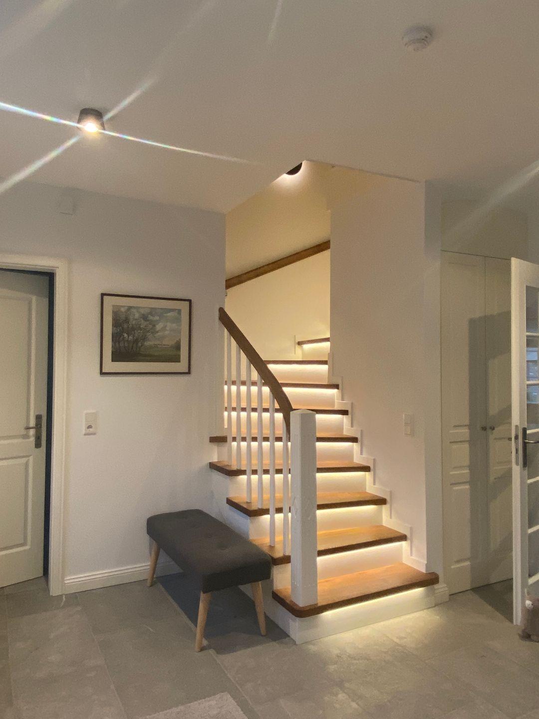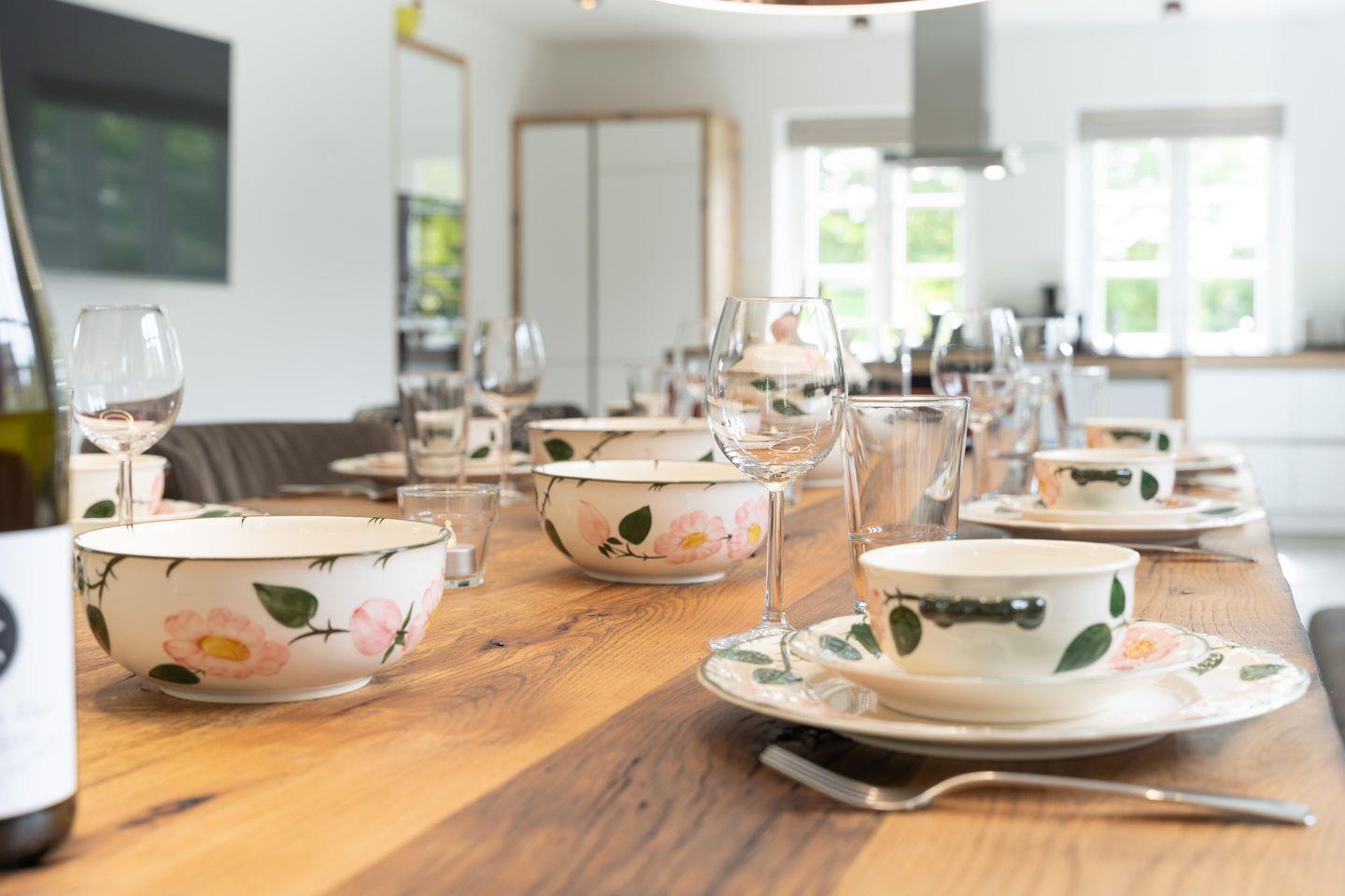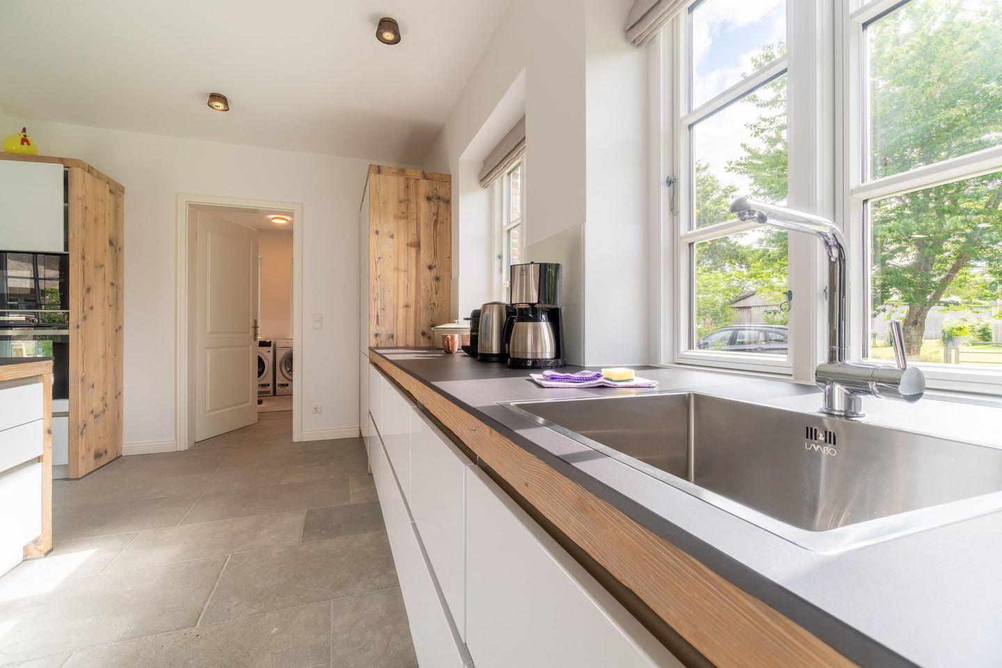 Im Erdgeschoss bietet das Haus eine große Diele mit Tunnelkamin, einen großzügigen Wohn- und Essbereich mit offener Küche, ein Duschbad sowie ein Hauswirtschaftsraum mit Waschmaschine und Trockner. Über den Wohn- und Essbereich gelangen Sie auf die im Süden des Hauses gelegene Terrasse und in den eigenen Garten. Der Tunnelkamin ist gleichermaßen vom Eingangsbereich und vom Wohnbereich einsehbar und spendet an kühleren Tagen eine angenehme Wärme. Die Küche verfügt über eine Kochinsel, einen separaten Weinkühlschrank und ist sehr gut ausgestattet.