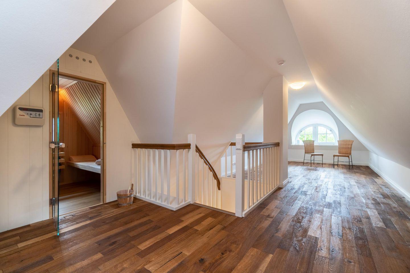 Die im Dachgeschoss gelegene Sauna gibt über ein kleines Fenster den Blick in den Garten und auf die umliegende Landschaft frei.